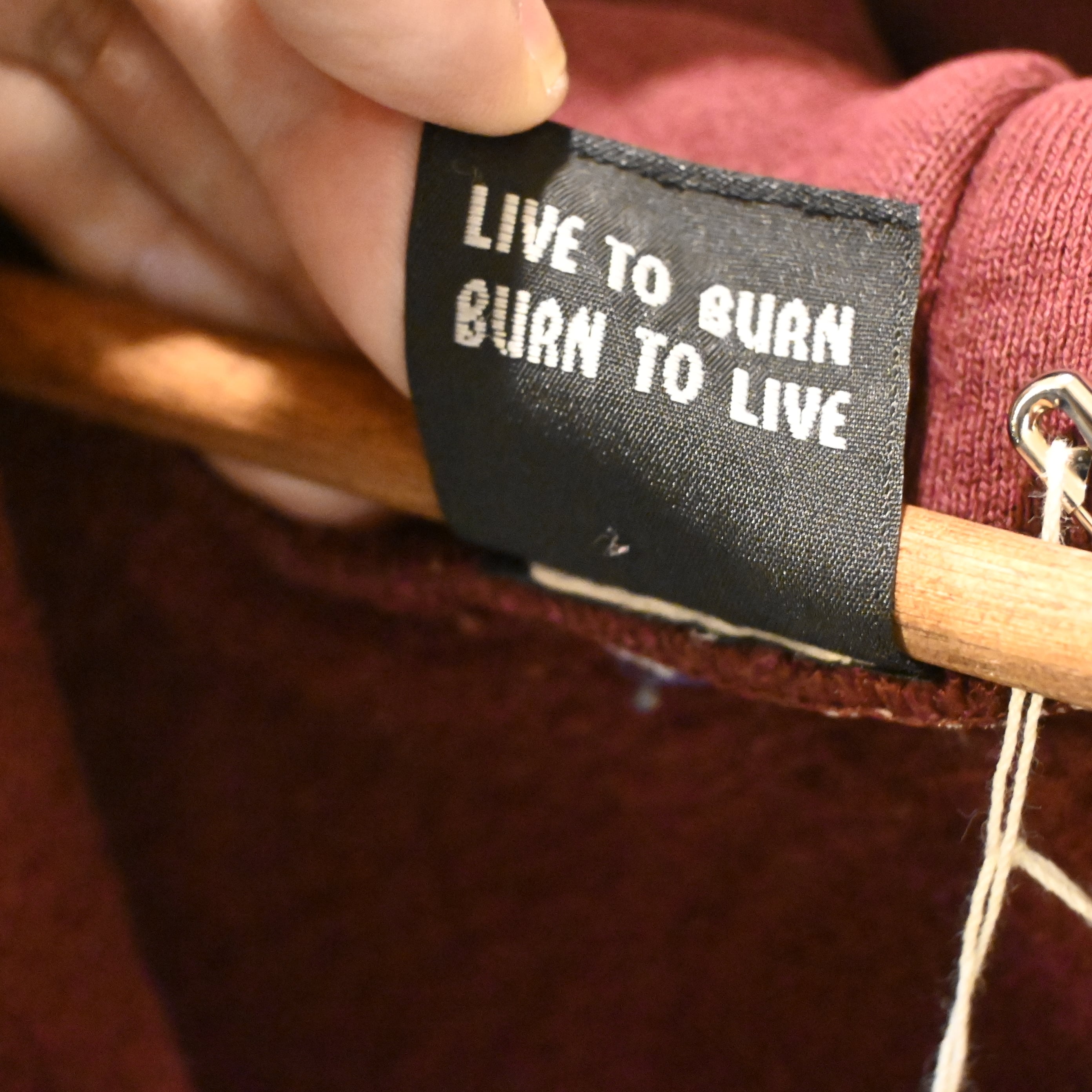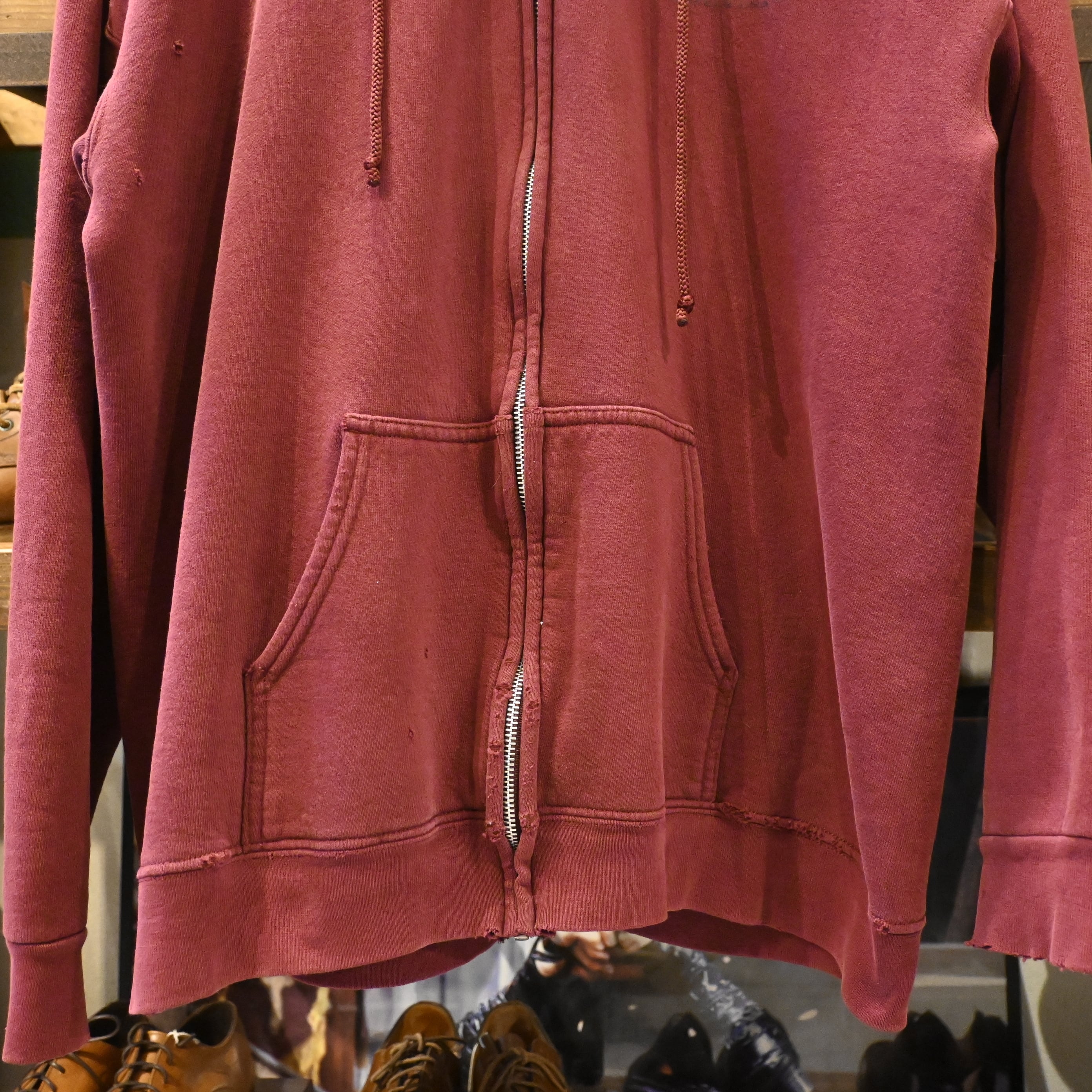 バーガンディカラーのフェード感と袖口のダメージが、スケートカルチャーのリアルさを感じさせる一着です。