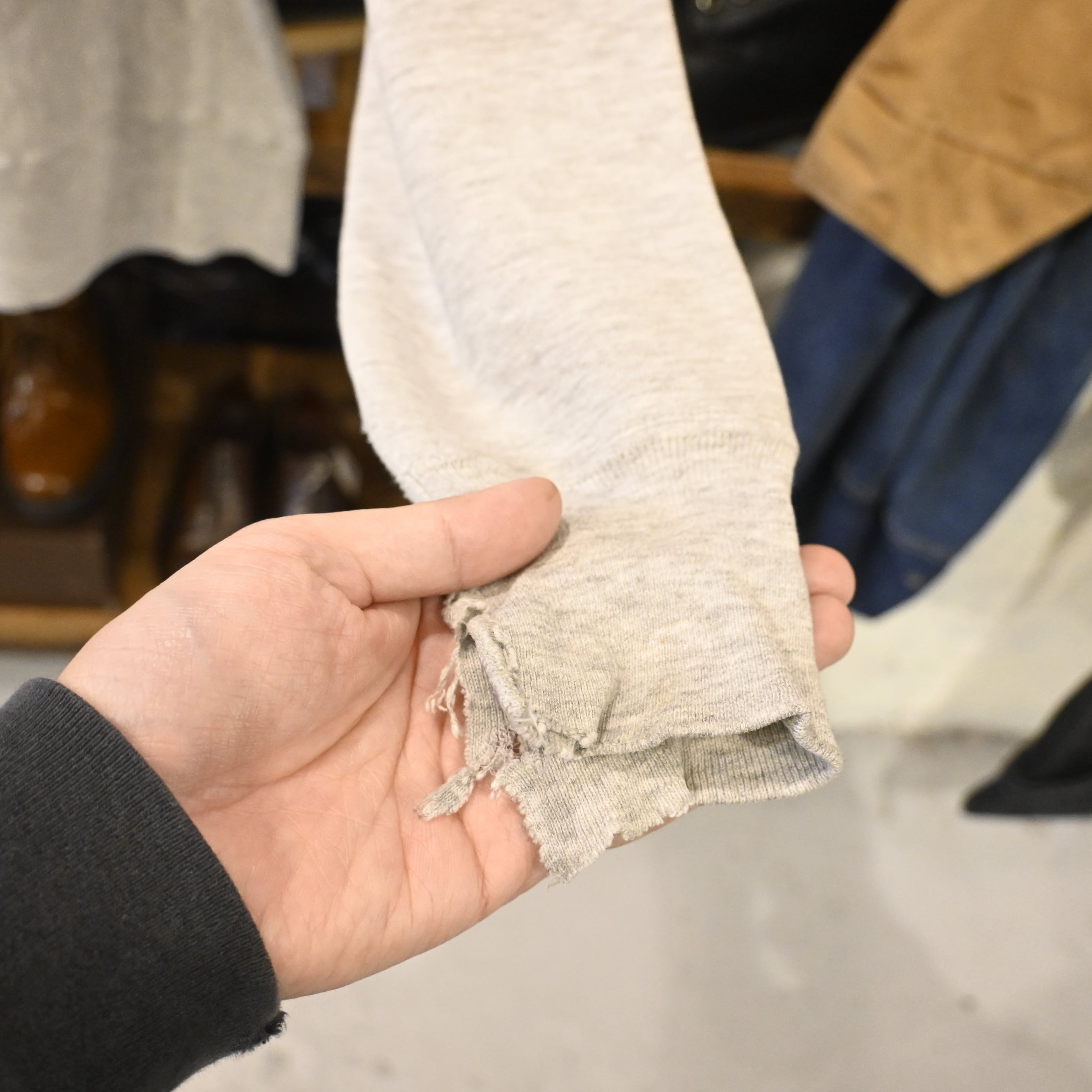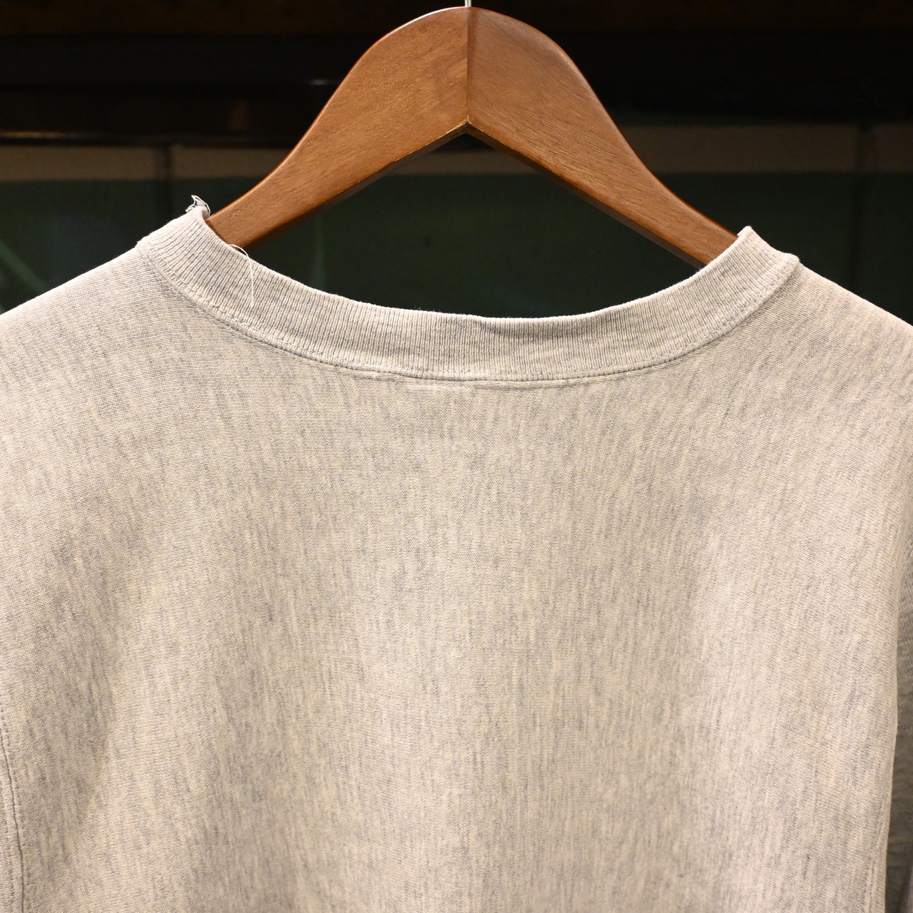 ボディは定番の杢グレー、プリントは経年によるフェード感が味わい深く、袖口やネックのダメージもリアルなヴィンテージの雰囲気を演出。
