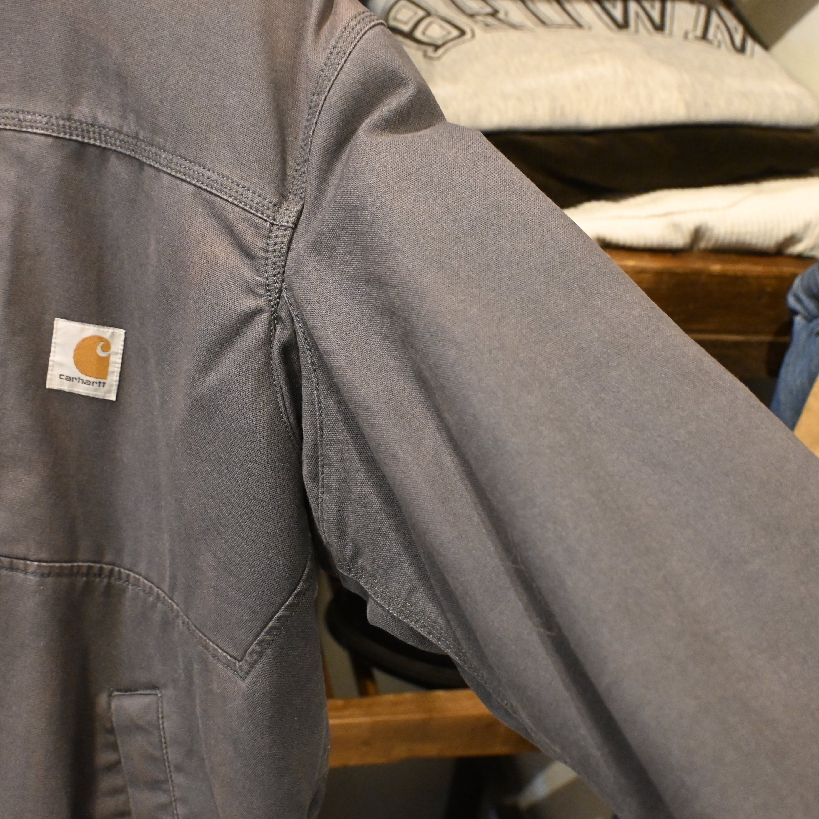 素材はCarharttらしいタフなコットンダックをベースに、裏地には3M Thinsulate(シンサレート)中綿を採用。防寒性・耐久性ともに非常に高く、真冬のアウターとしても十分対応可能なモデルです。