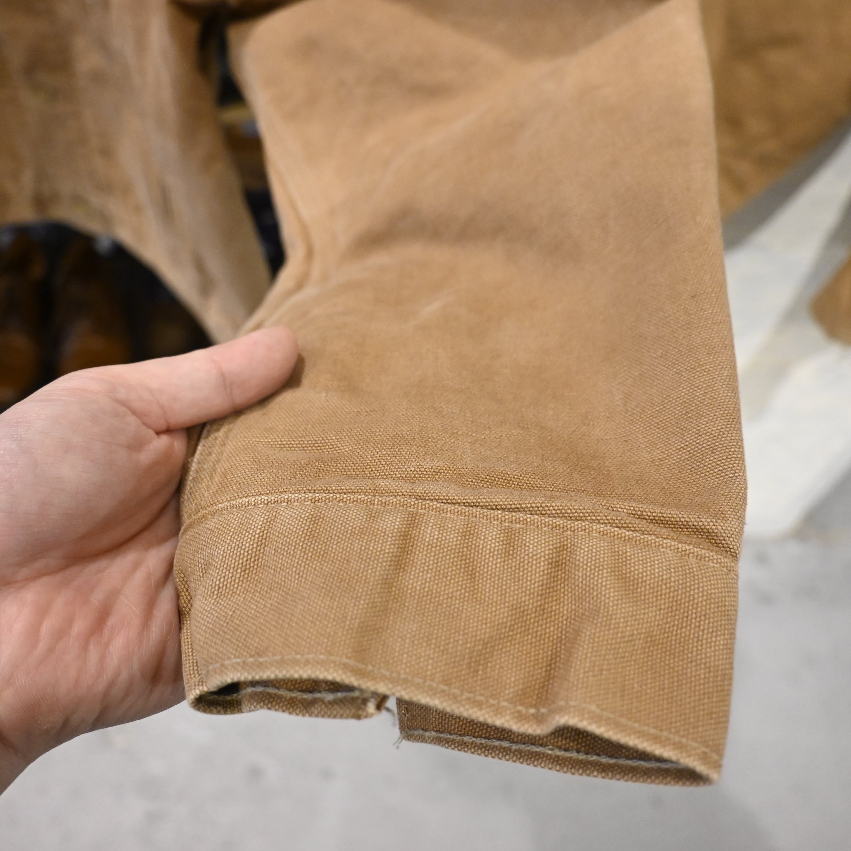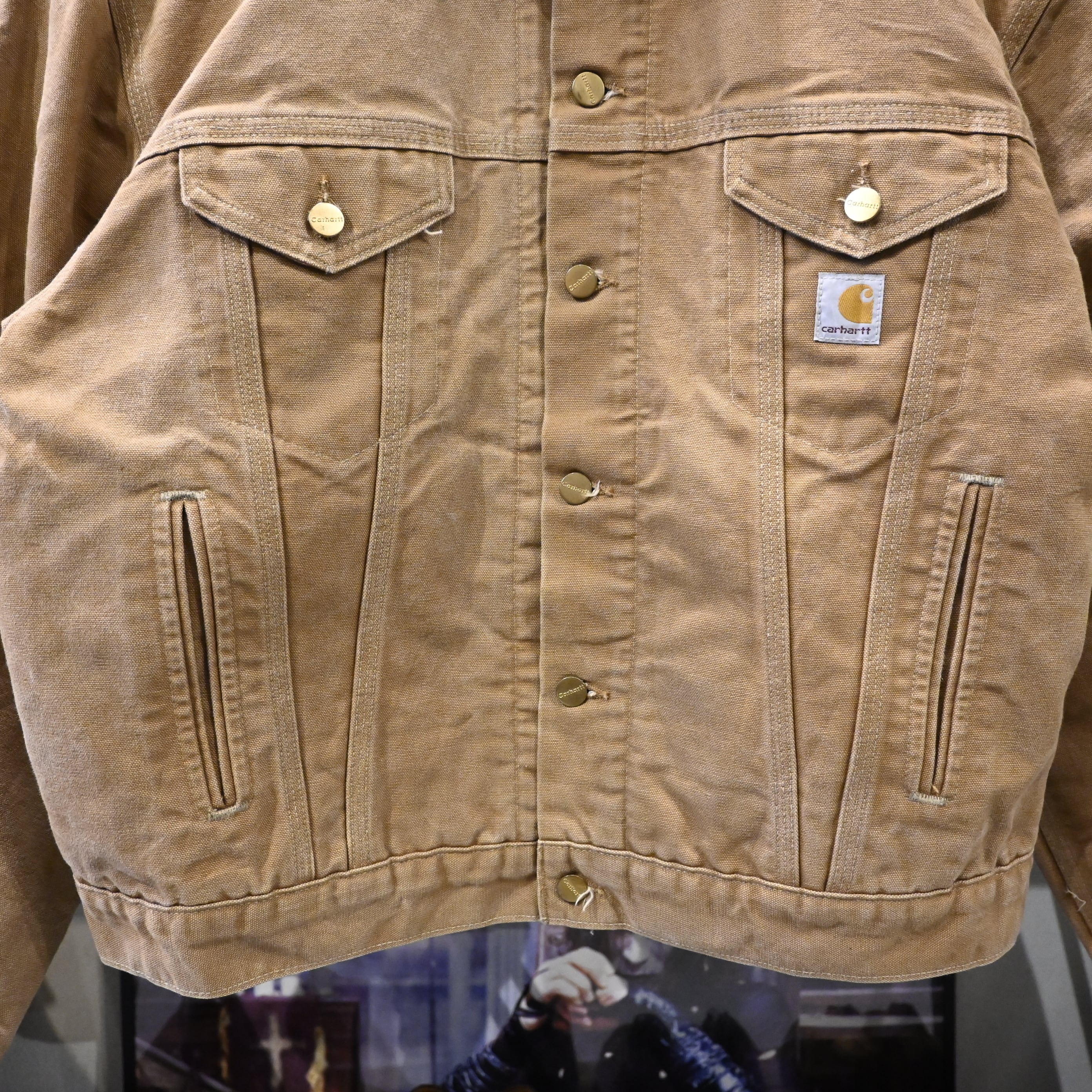 ボタンにはブランドロゴ刻印入り、胸ポケットには通称“カーハートパッチ”タグを配置。