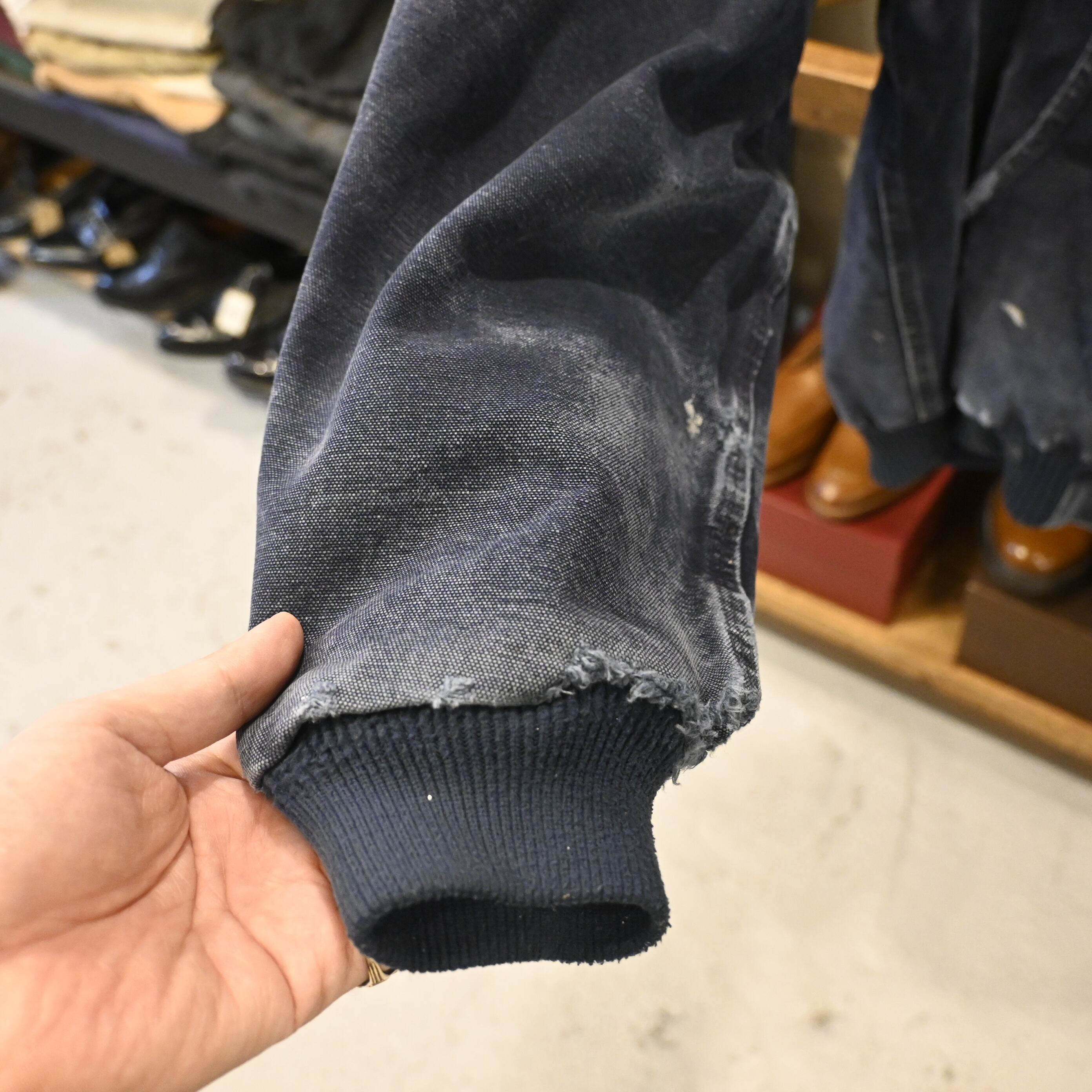 袖や裾のリブにはダメージが見られますが、リアルなワークウェアとしての味わいを楽しめるアイテムです。