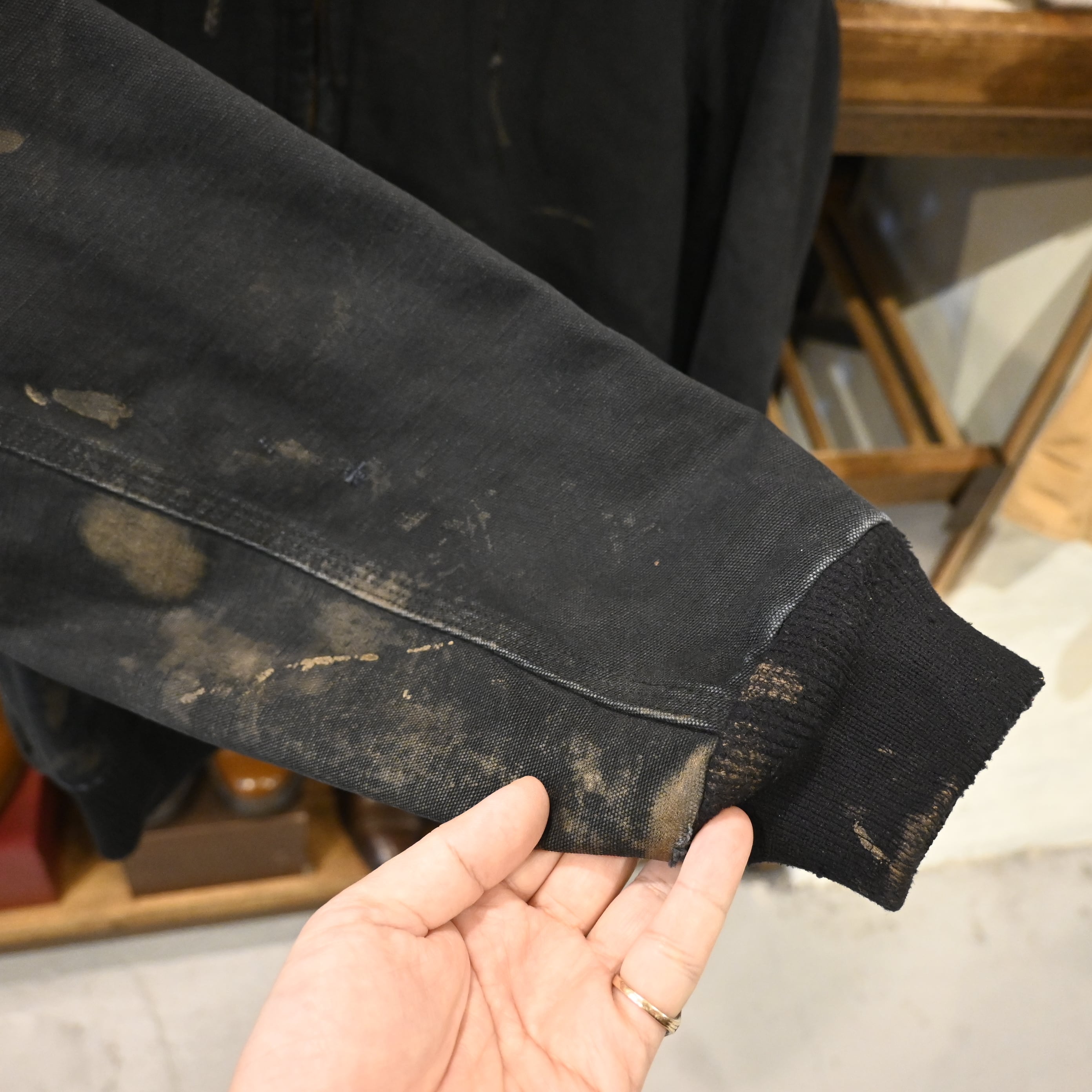 タフなコットンダック生地に、長年の着用によるフェードやペンキ跡など、リアルなワークウェアの雰囲気が残る一点です。