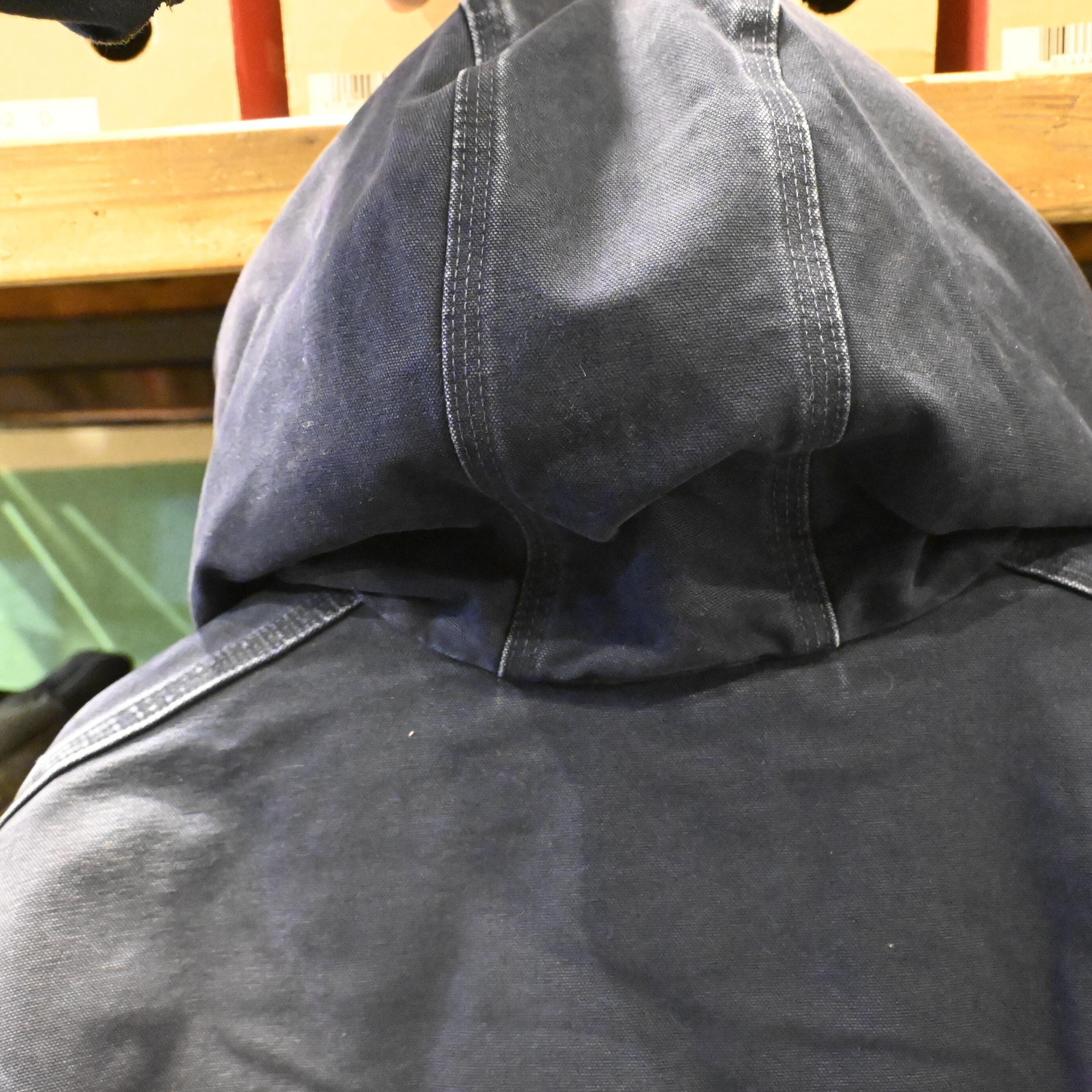 しっかりとしたコットンダック生地にネイビーカラーが施された一着で、長年の着用によるフェード感が非常に良い雰囲気を演出しています。