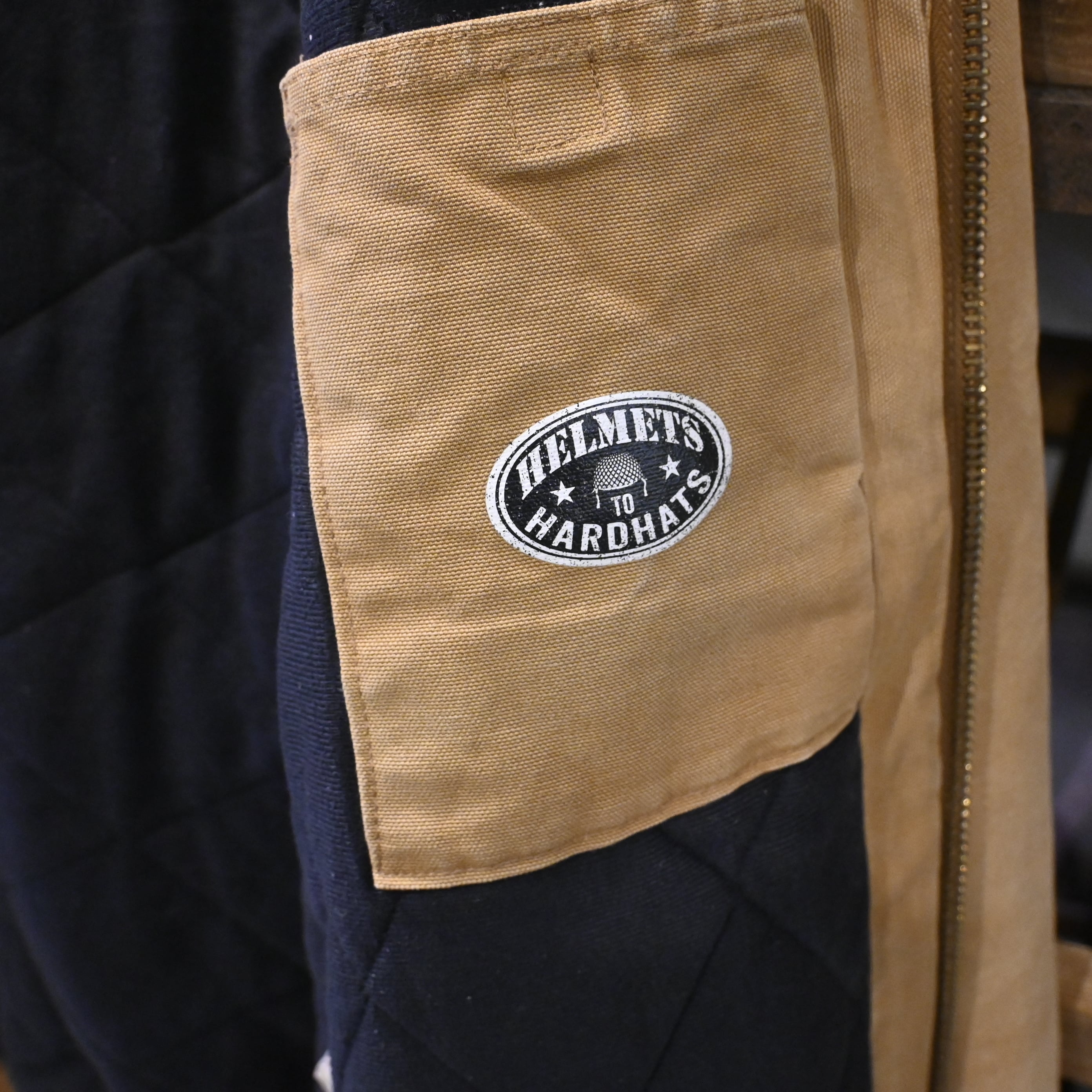 こちらは数が少なくなったUSA製の一着です。タフなブラウンダック生地に中綿入りキルティングライナーを備え、保温性・耐久性ともに抜群。胸元にはおなじみのスクエアロゴパッチ、内ポケットには“HELMETS TO HARDHATS”ロゴ入りパッチが付いた特別仕様です。