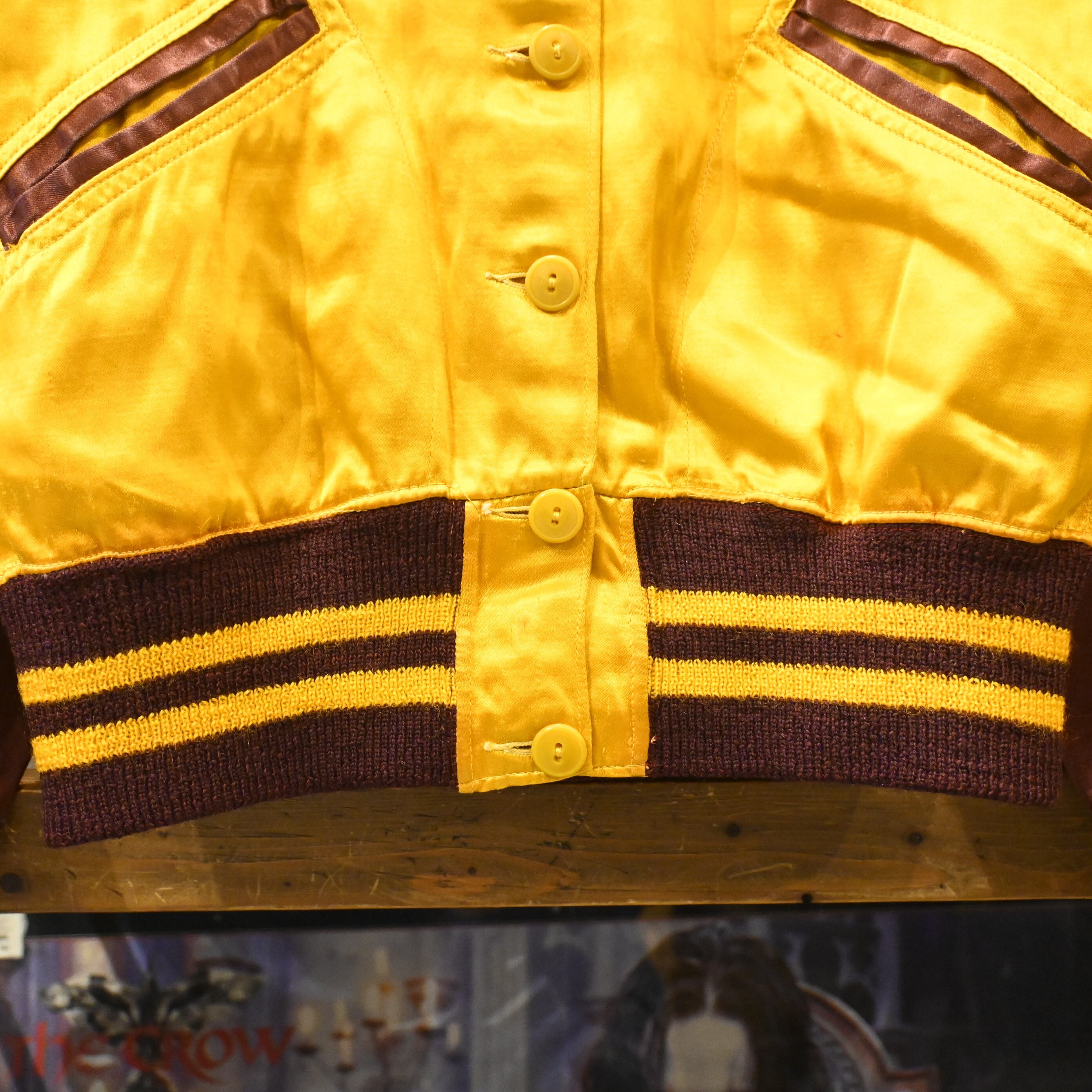 光沢あるアセテート系サテンの質感、リブの配色、ステッチワークの美しさなど、時代を感じさせるディテールが詰まった一着。