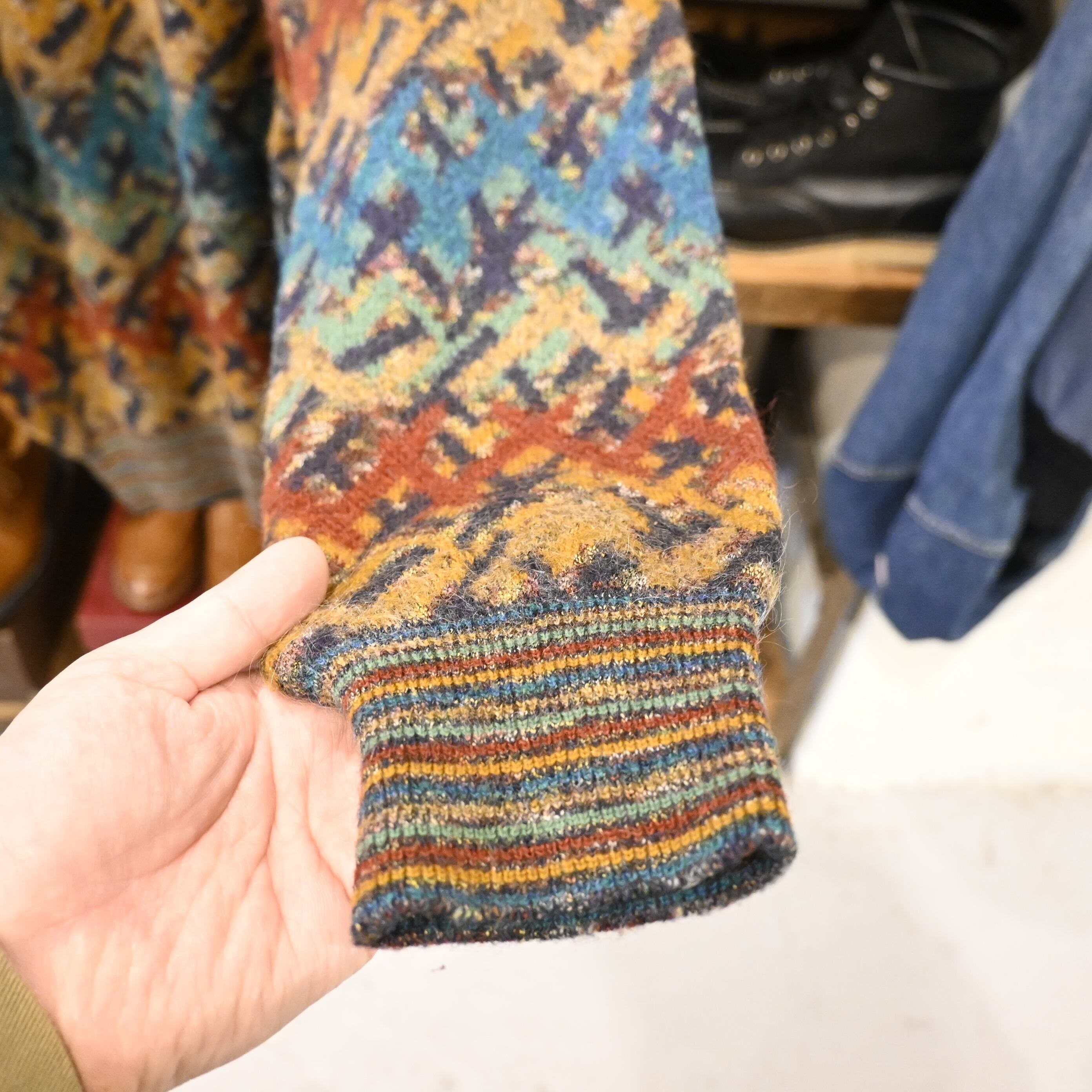 ブランドの象徴である複雑な色使いと幾何学模様が際立つ一着で、オレンジ・ブルー・マスタードなどを基調とした立体感ある編み柄が特徴です。