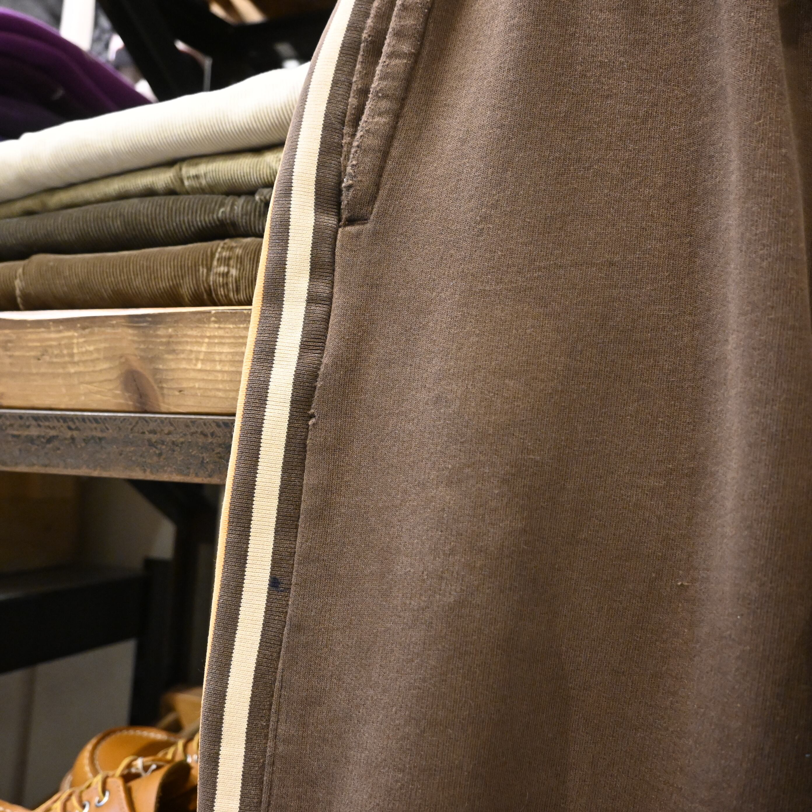 裾リブ部分や腿付近に小さなピンホール・ほつれが見られますが、着用に支障のない程度です。全体的に生地の風合いは良く、味のある雰囲気に仕上がっています。