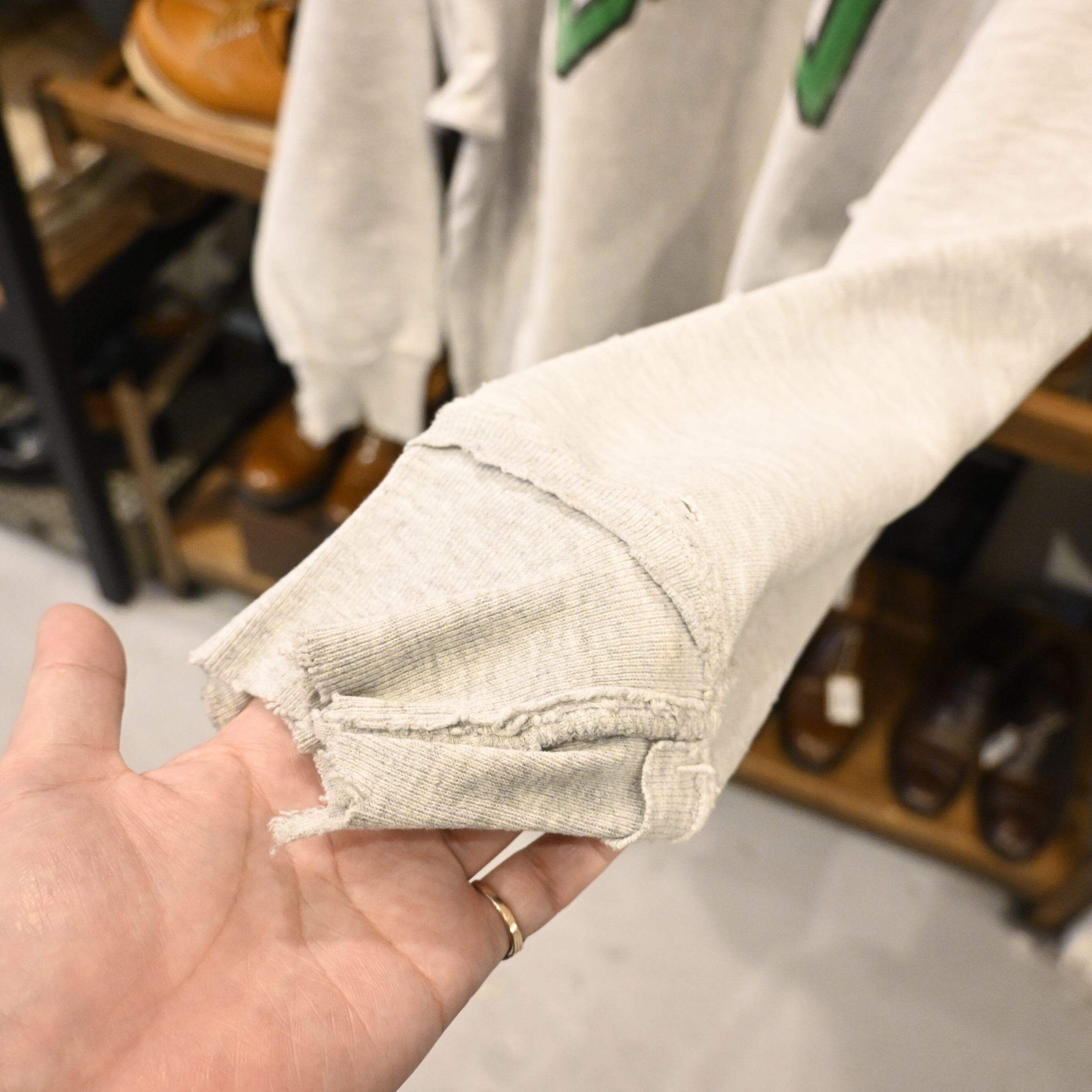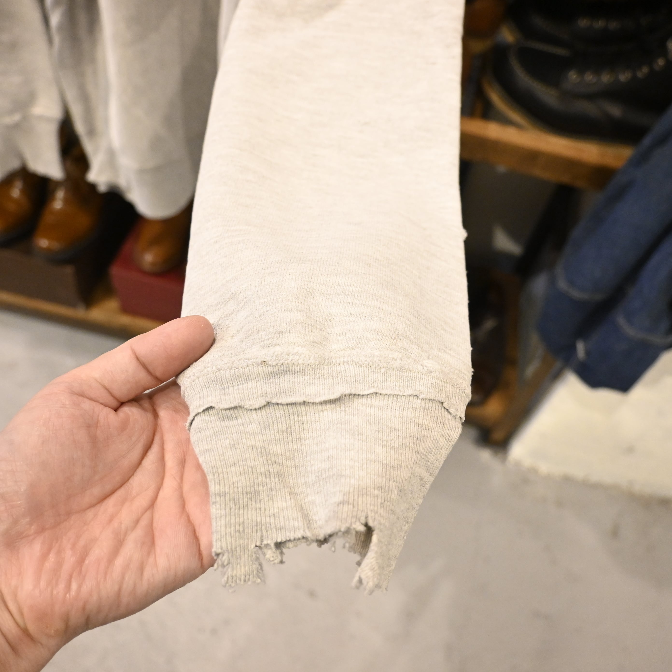首元・袖口・裾にはリペアやダメージが見られますが、古着らしいリアルな経年変化として雰囲気のある仕上がり。