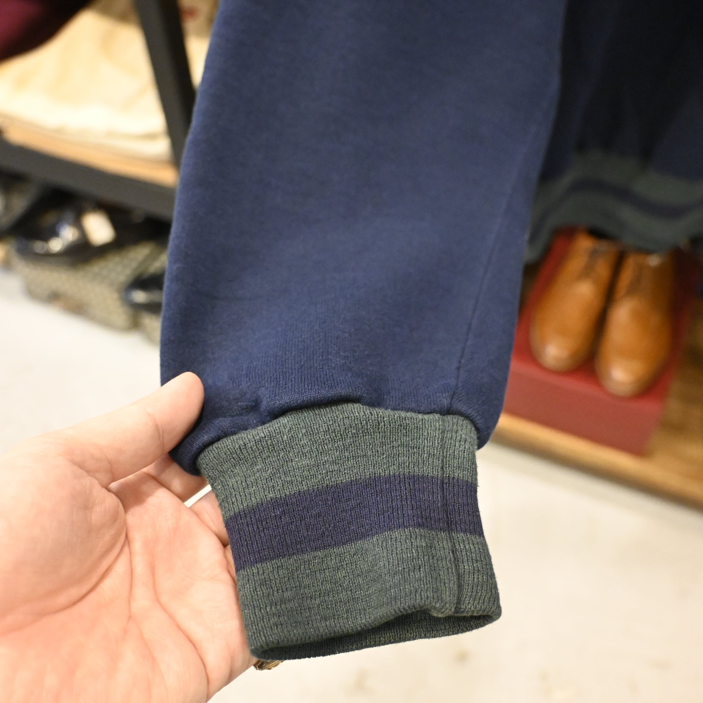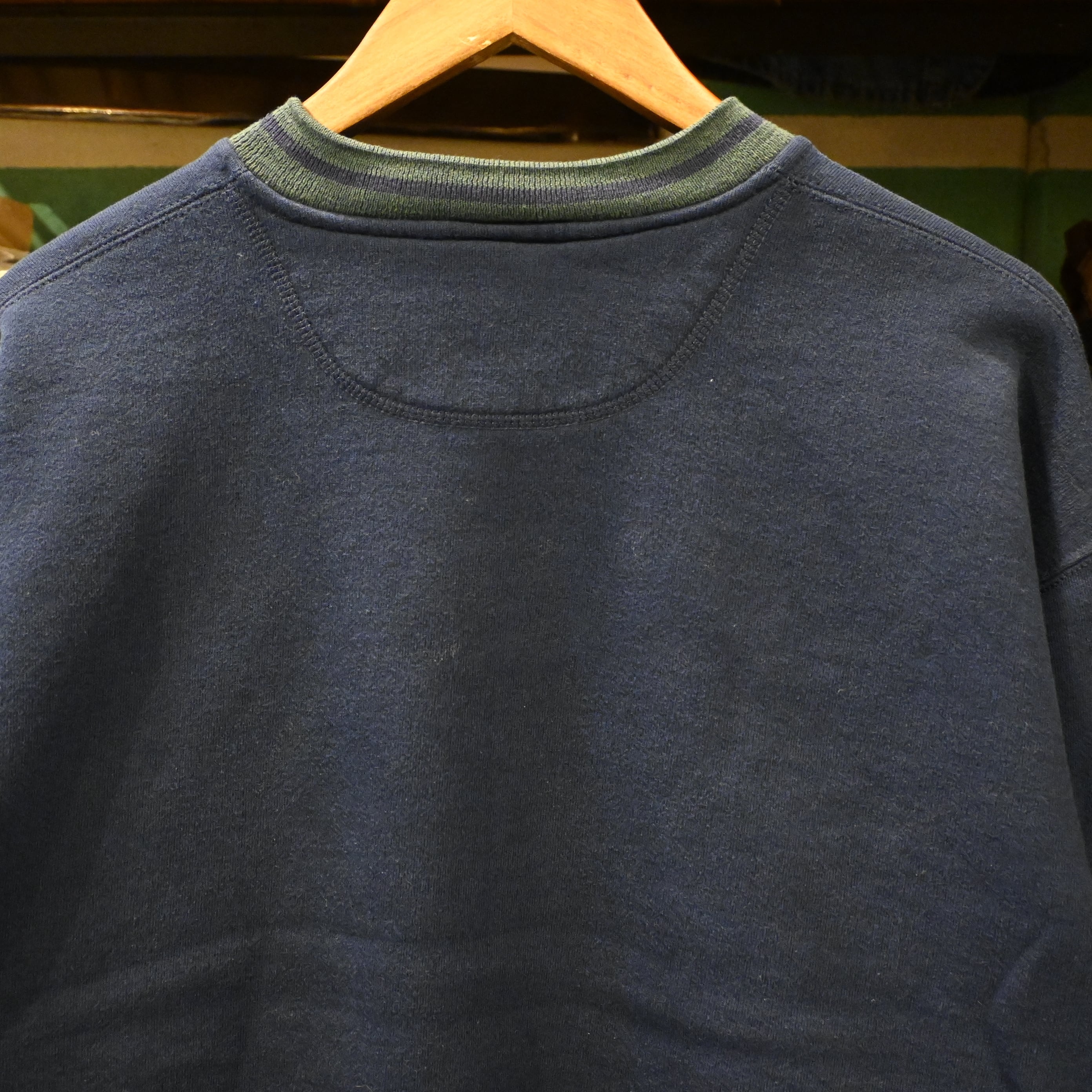 ネイビーボディにグリーンのラインリブが映える落ち着いた配色で、ヴィンテージスウェットらしい雰囲気を持つ一枚です。