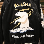 上質なベロア生地を使用し、背面には稲妻とともに立ち上がるホッキョクグマ、袖には犬ぞりをイメージした犬たちが大胆に刺繍された“ALASKA”モデル。