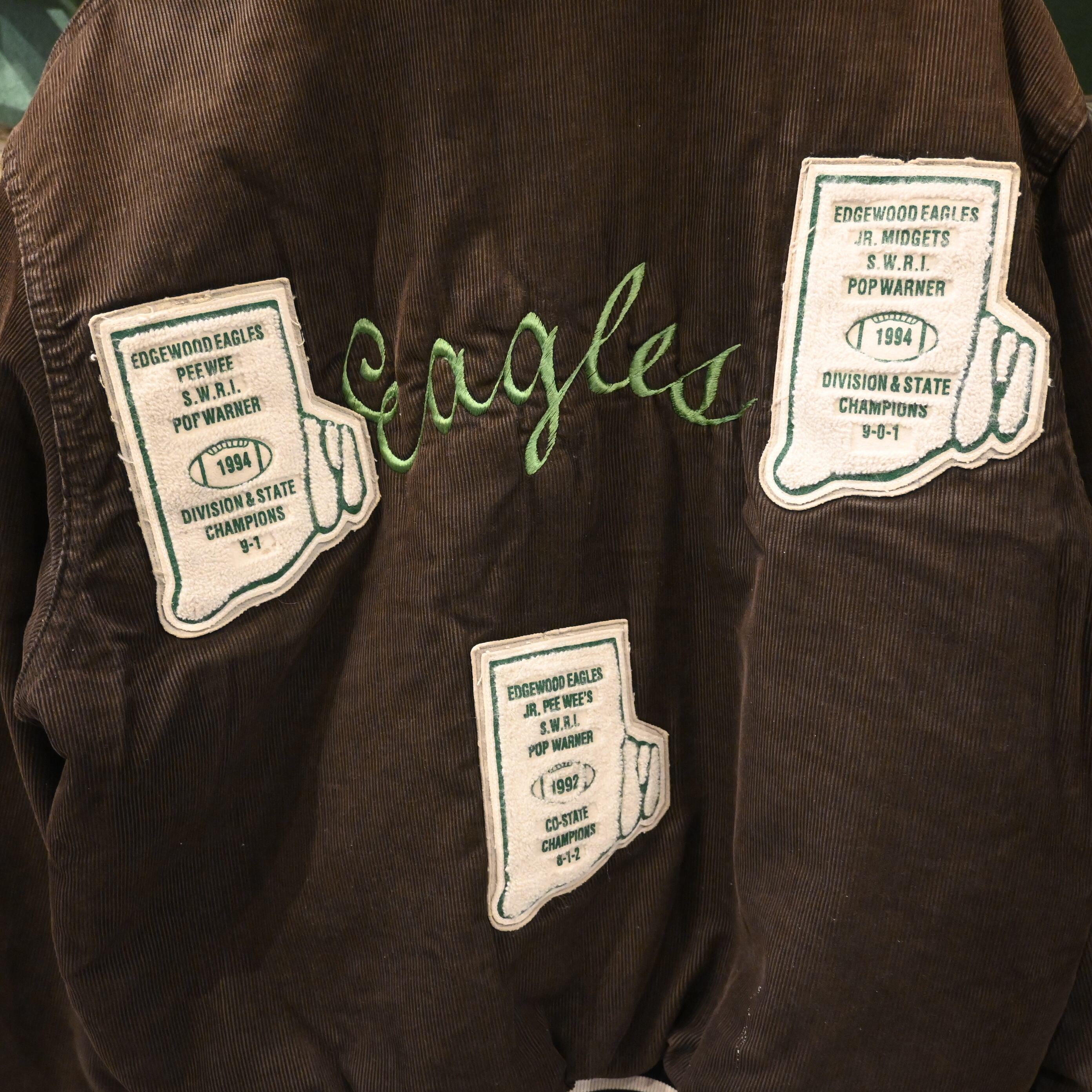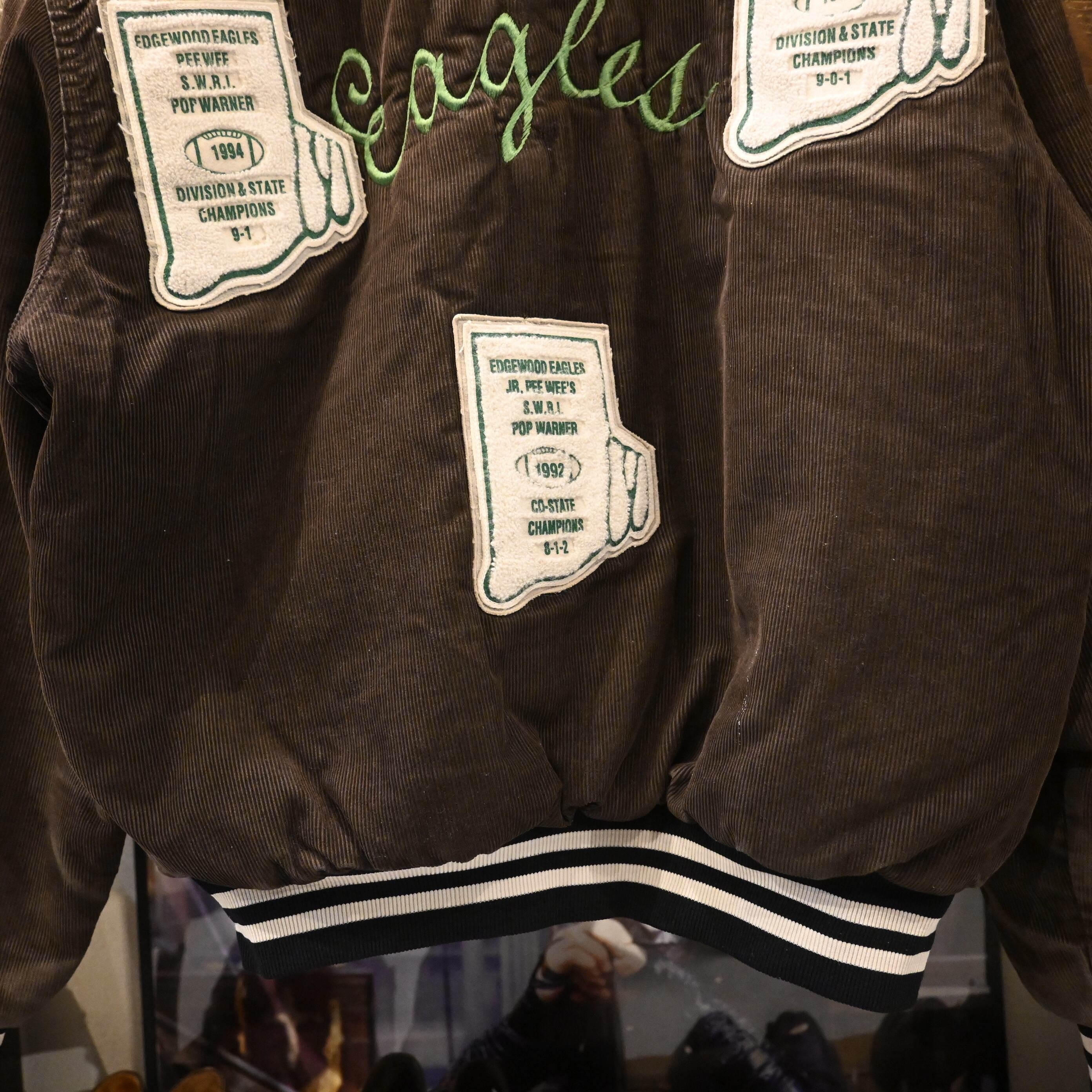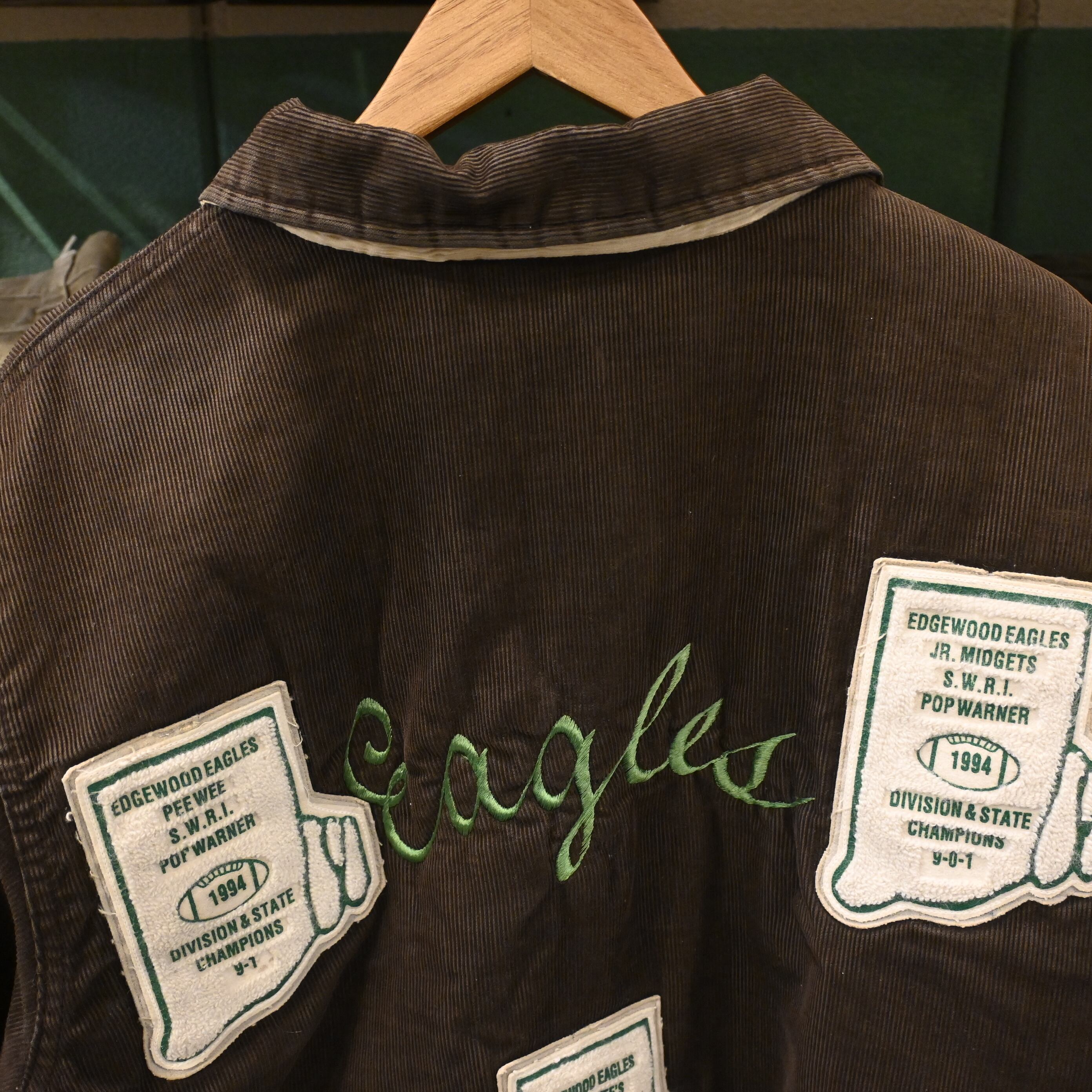 ブラウンの太畝コーデュロイをベースに、胸元には“EDGEWOOD EAGLES FOOTBALL”の刺繍、