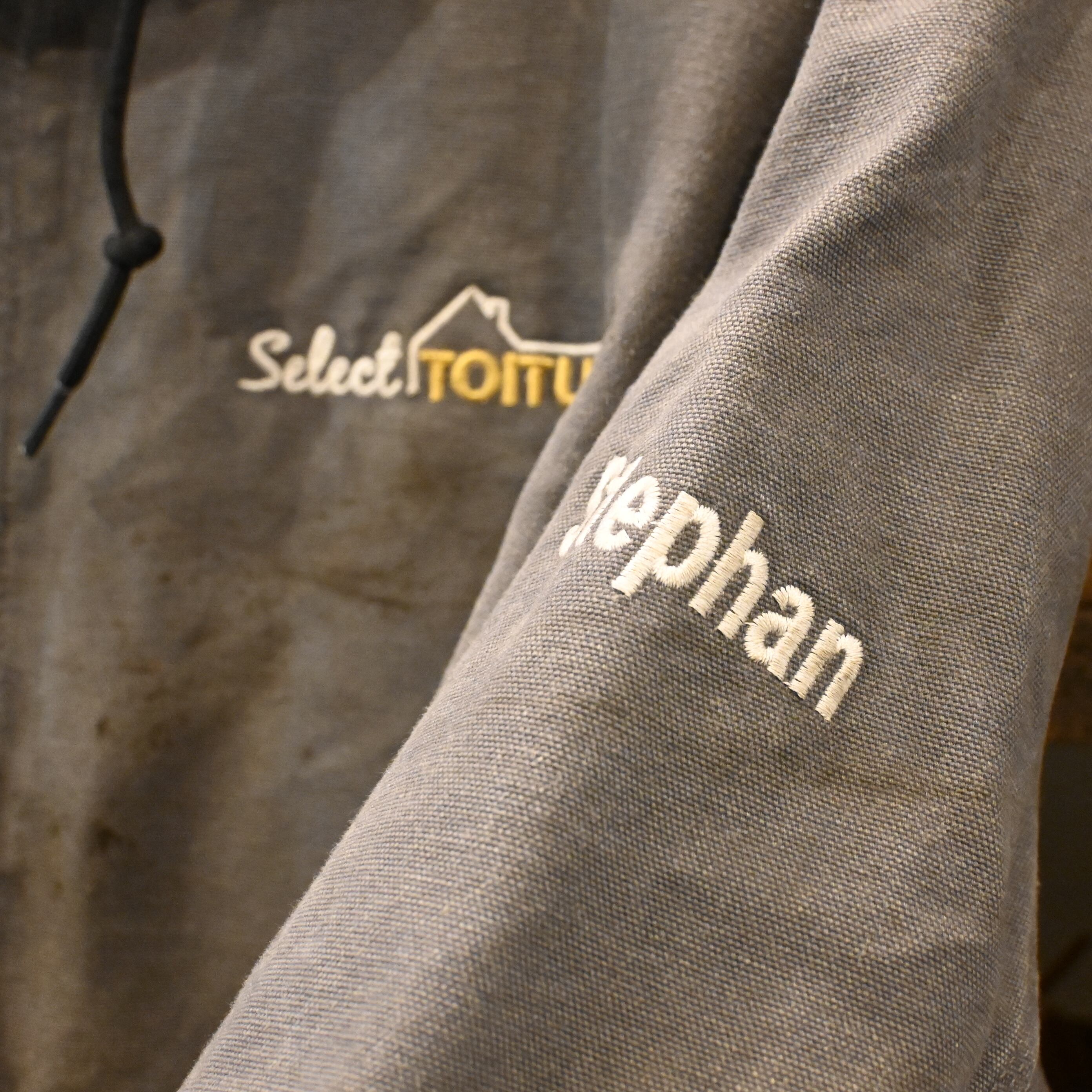 左胸と背面に「Select Toiture inc.」の企業ロゴ刺繍が入り、実際のワークユニフォームとして使われていた個体。