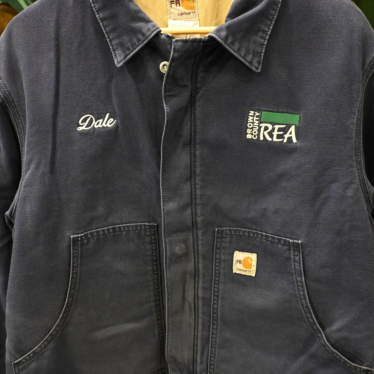 胸元には「BROWN COUNTY REA」の企業ロゴとネーム刺繍が施された、実際の作業現場用ユニフォームとして使用されていた一着です。