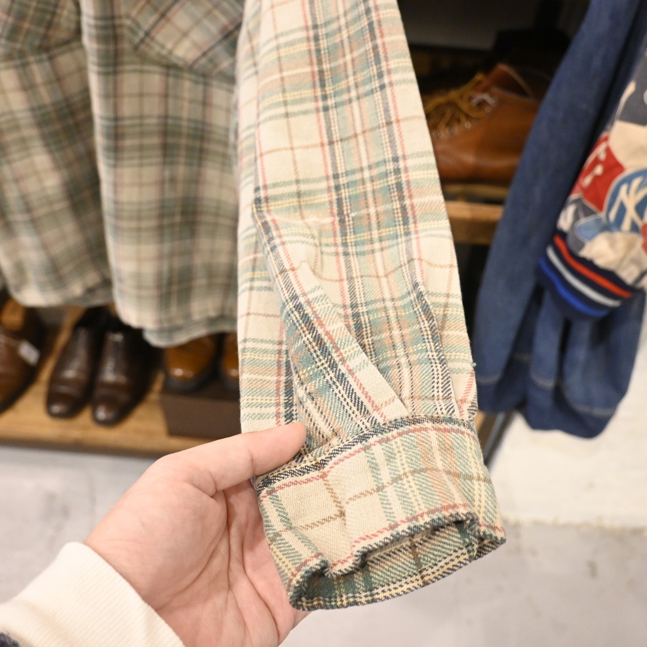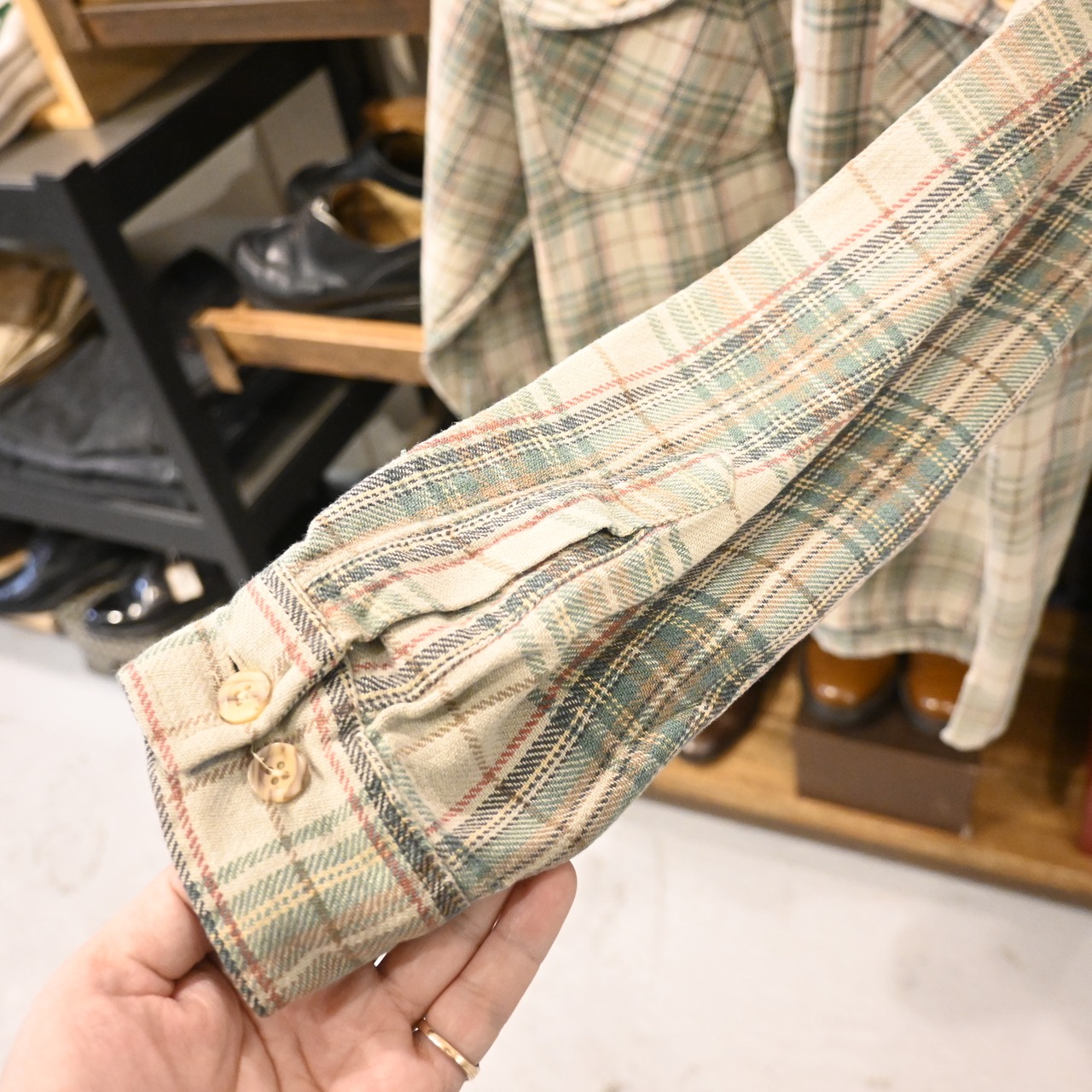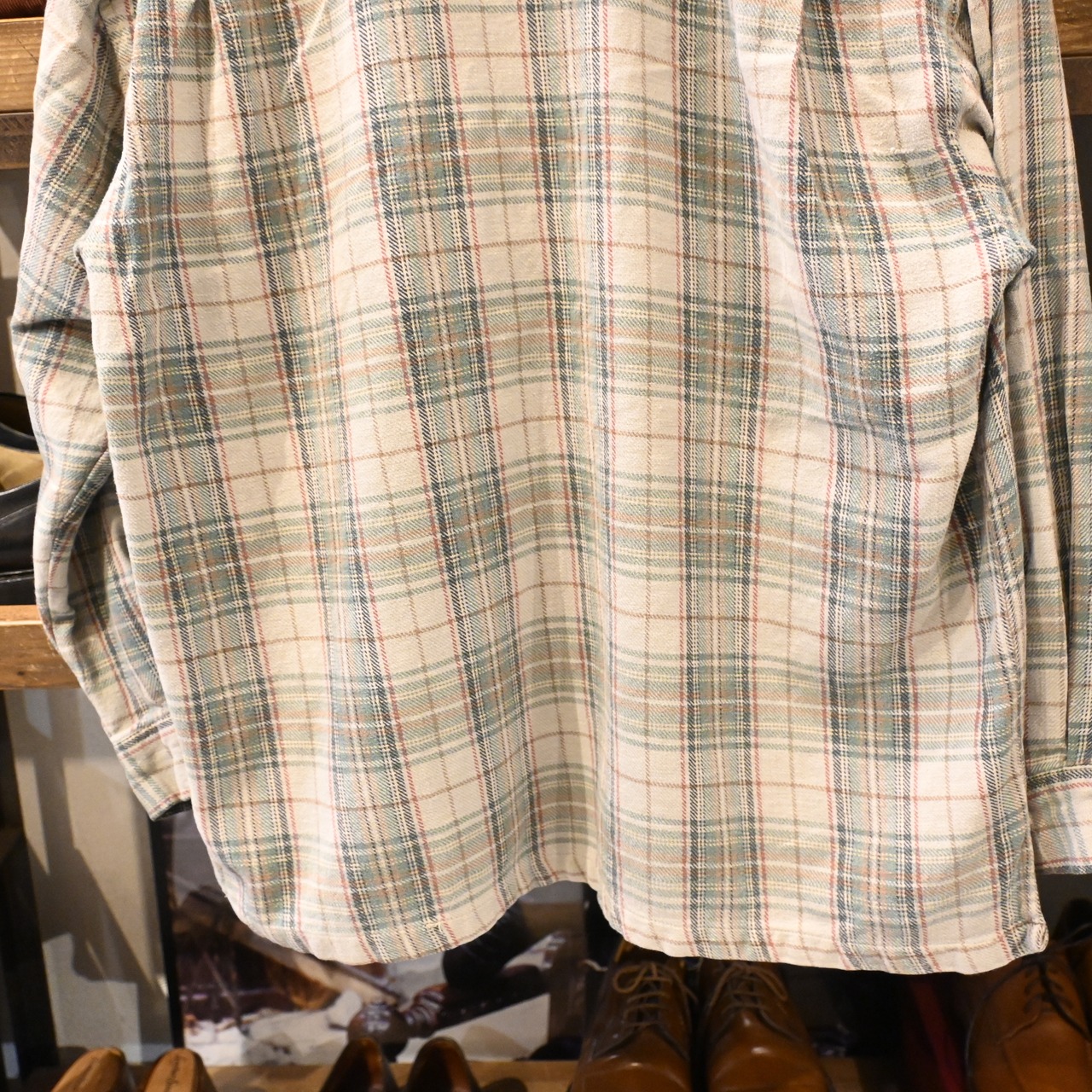 ベージュをベースに、グリーン・レッド・ブラウンの落ち着いたトーンで構成されたチェック柄が印象的な一枚です。