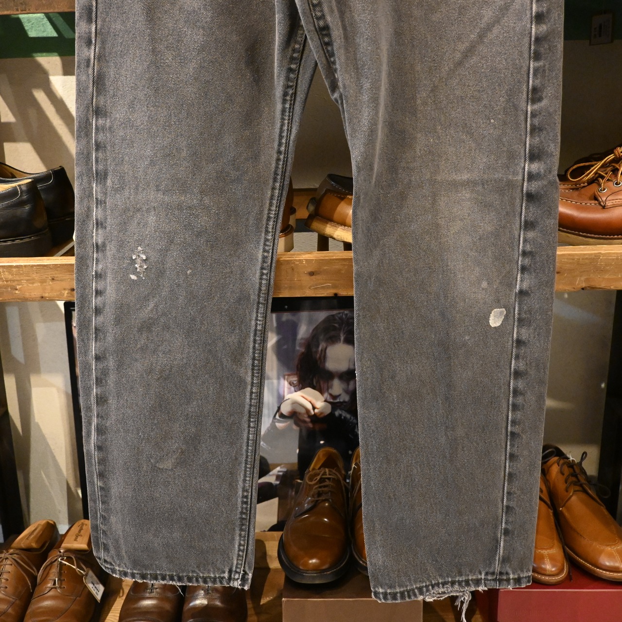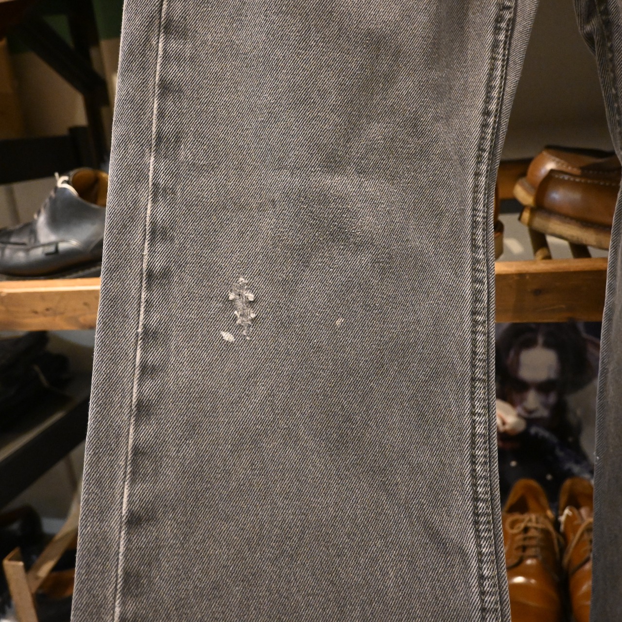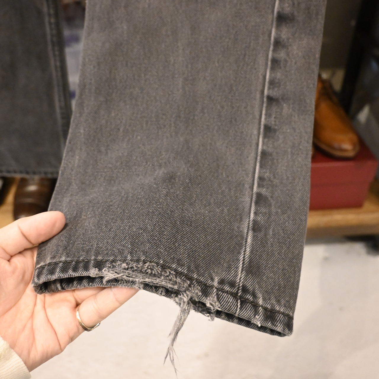 全体にフェードしたブラックデニムの風合いが抜群で、経年変化によるグレーがかったトーンがヴィンテージらしい一本。