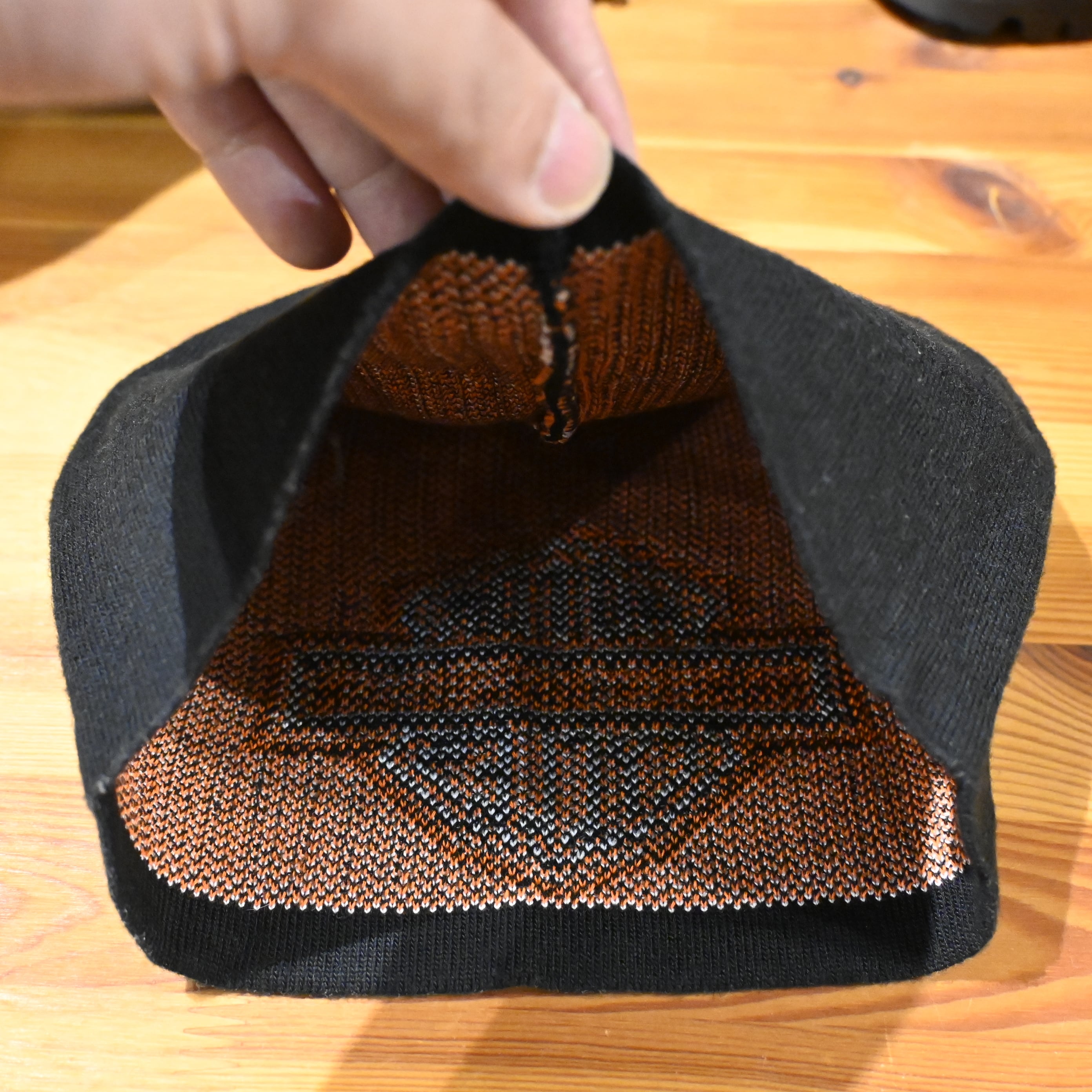 フロントに大きく配されたオレンジ×ブラックの配色が存在感抜群で、アメリカンバイカーらしい無骨なムードをしっかり演出してくれます。