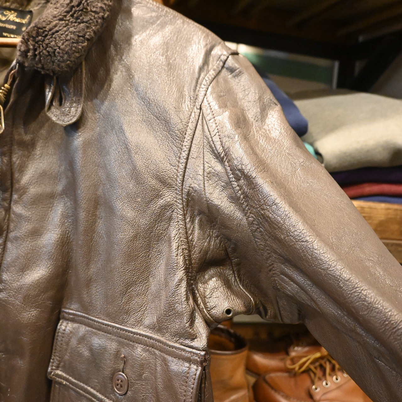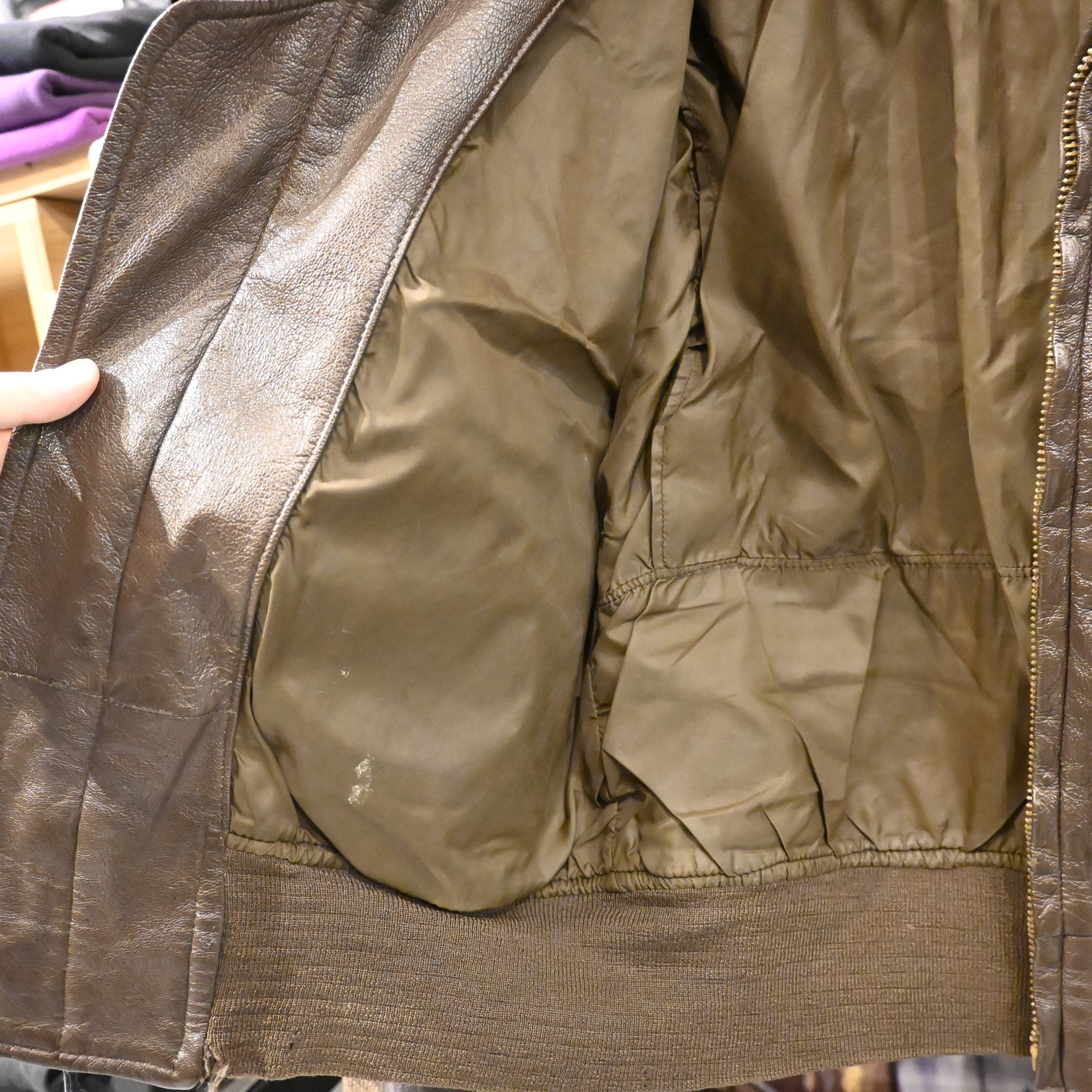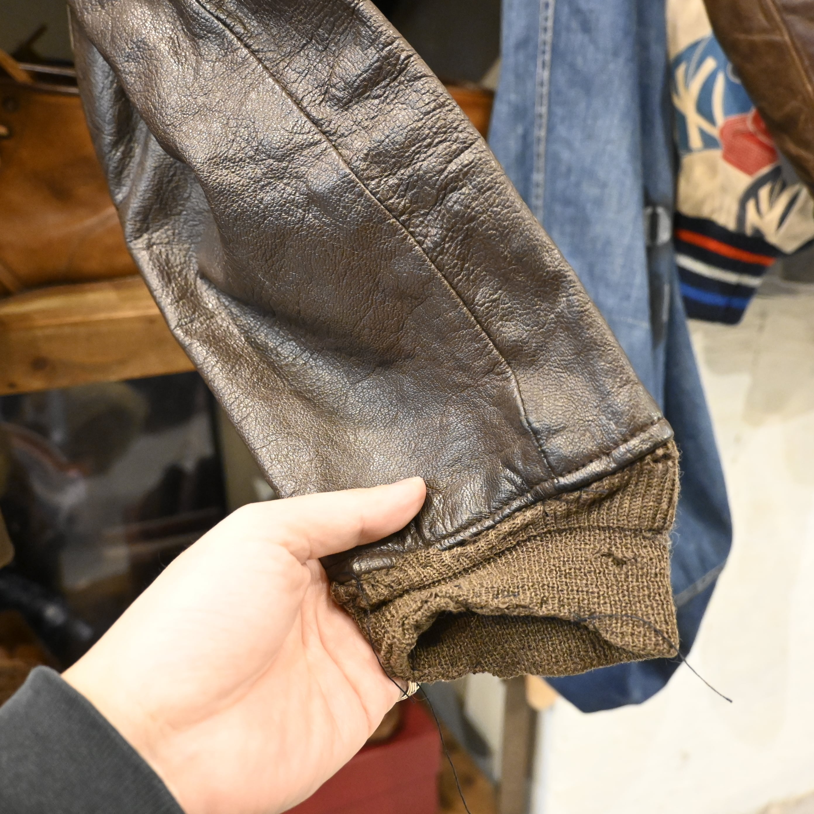 レザーは厚みがあり、全体に経年のシワ・クラックが入った非常に味わい深い表情。袖リブ・裾リブにはダメージが見られますが、ヴィンテージレザーとして自然な経年変化の範囲です。裏地は比較的良好で、まだ十分着用いただけるコンディションとなっています。