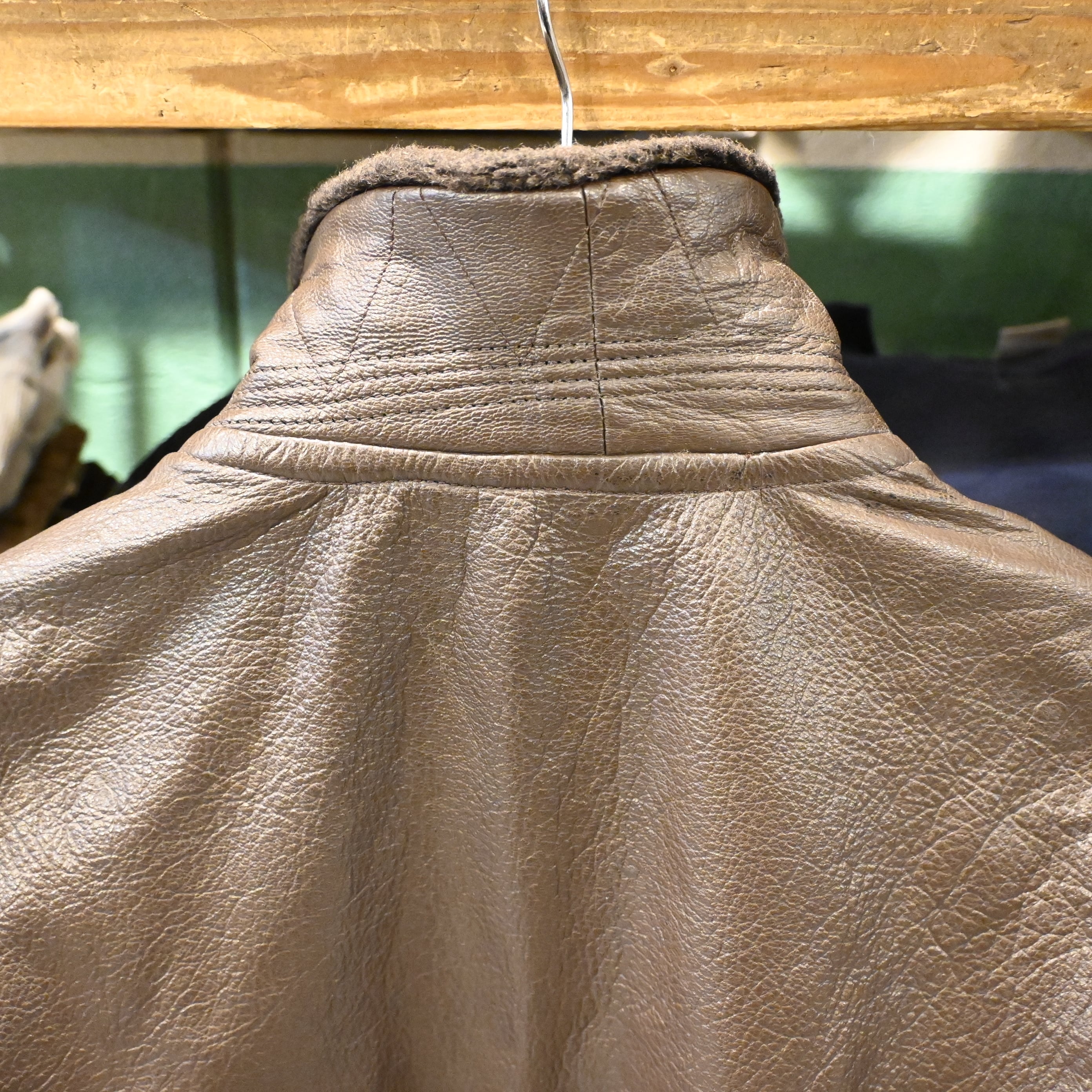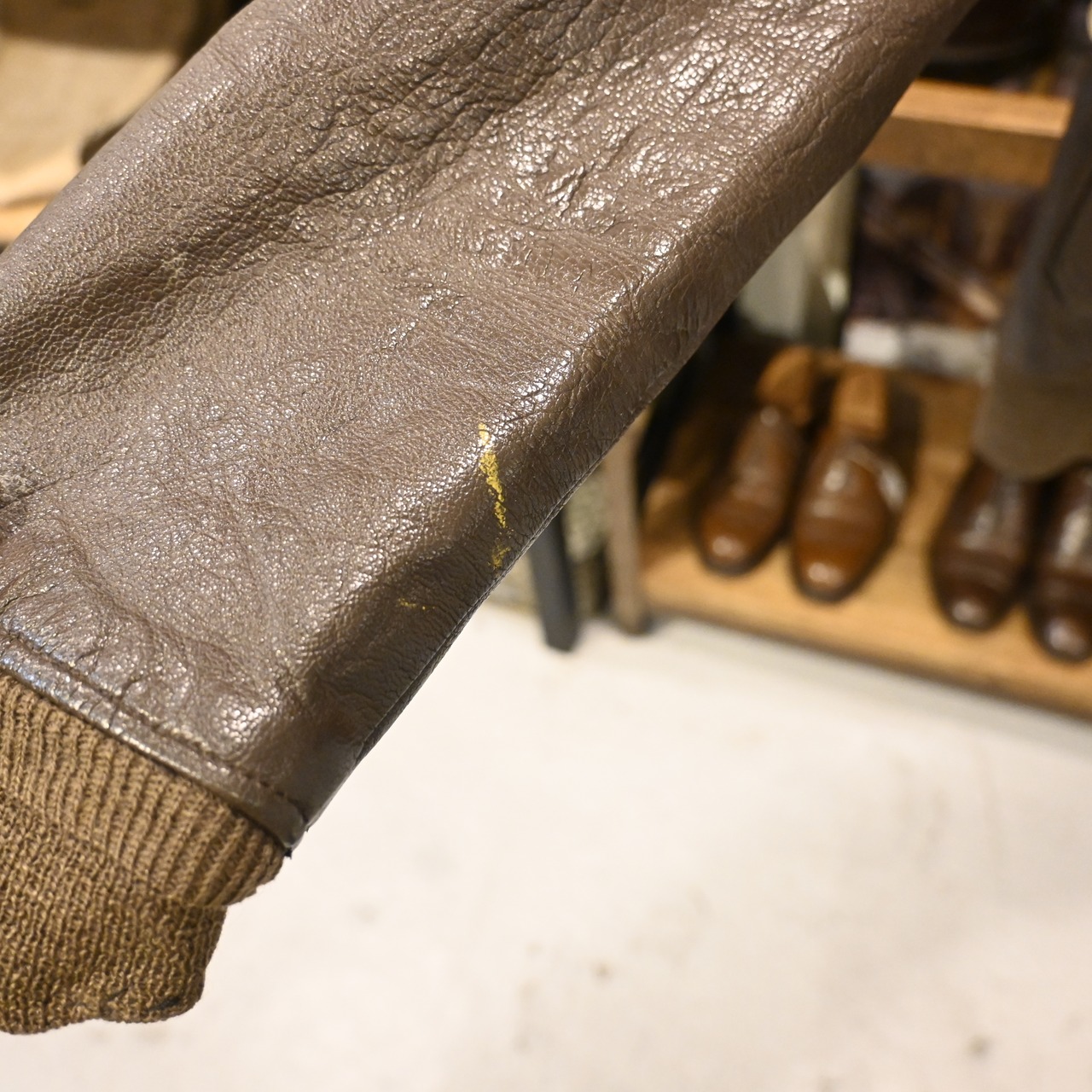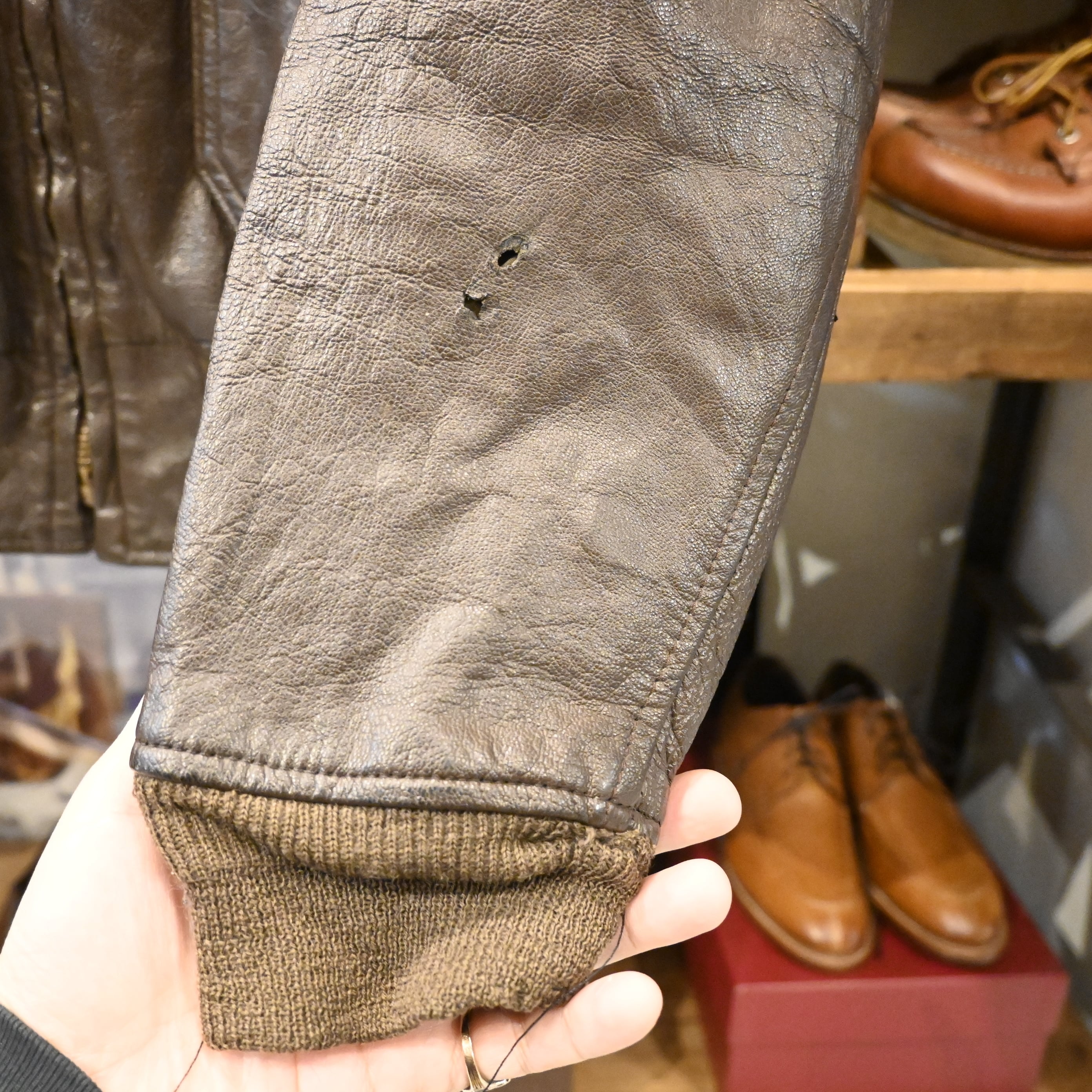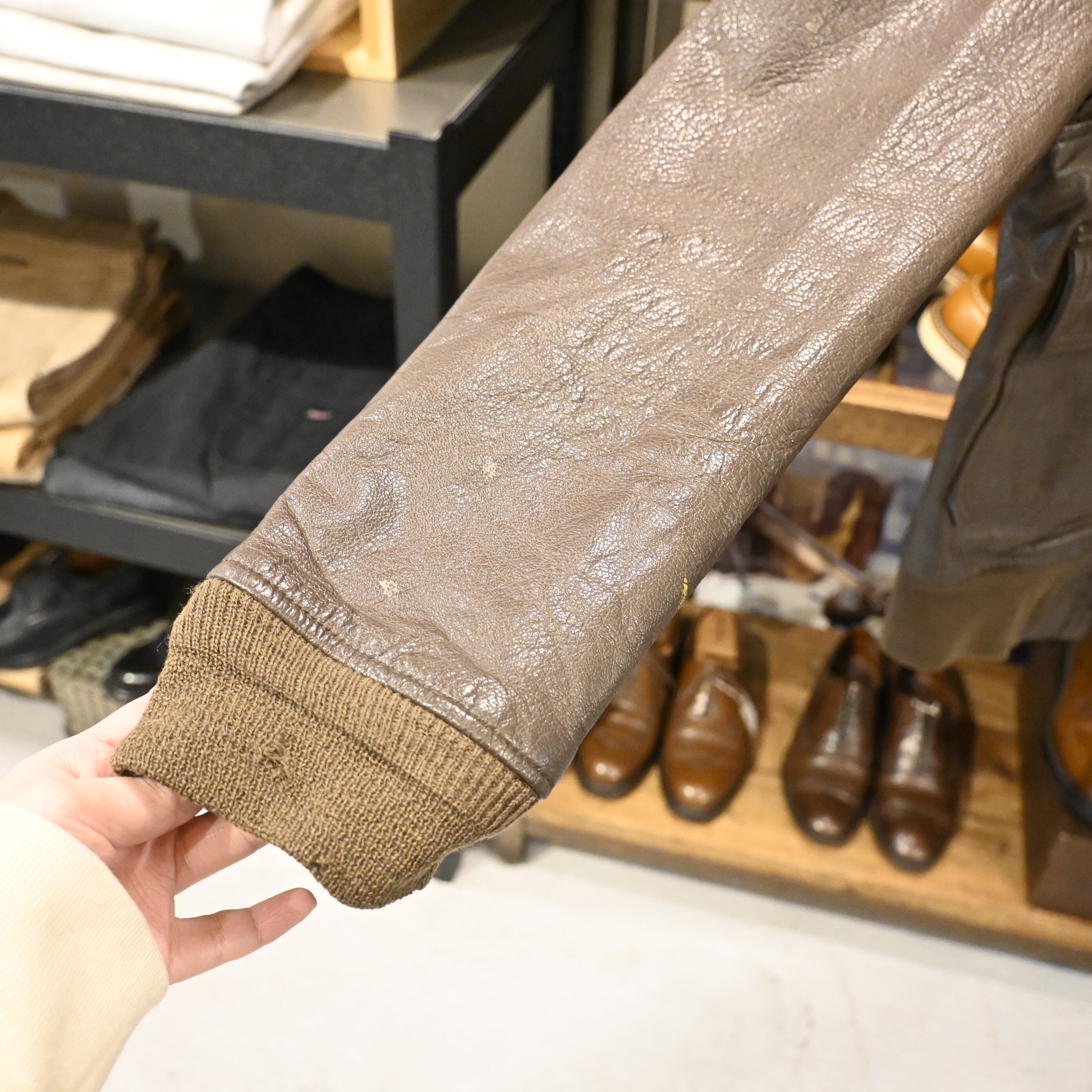 レザーは厚みがあり、全体に経年のシワ・クラックが入った非常に味わい深い表情。袖リブ・裾リブにはダメージが見られますが、ヴィンテージレザーとして自然な経年変化の範囲です。裏地は比較的良好で、まだ十分着用いただけるコンディションとなっています。