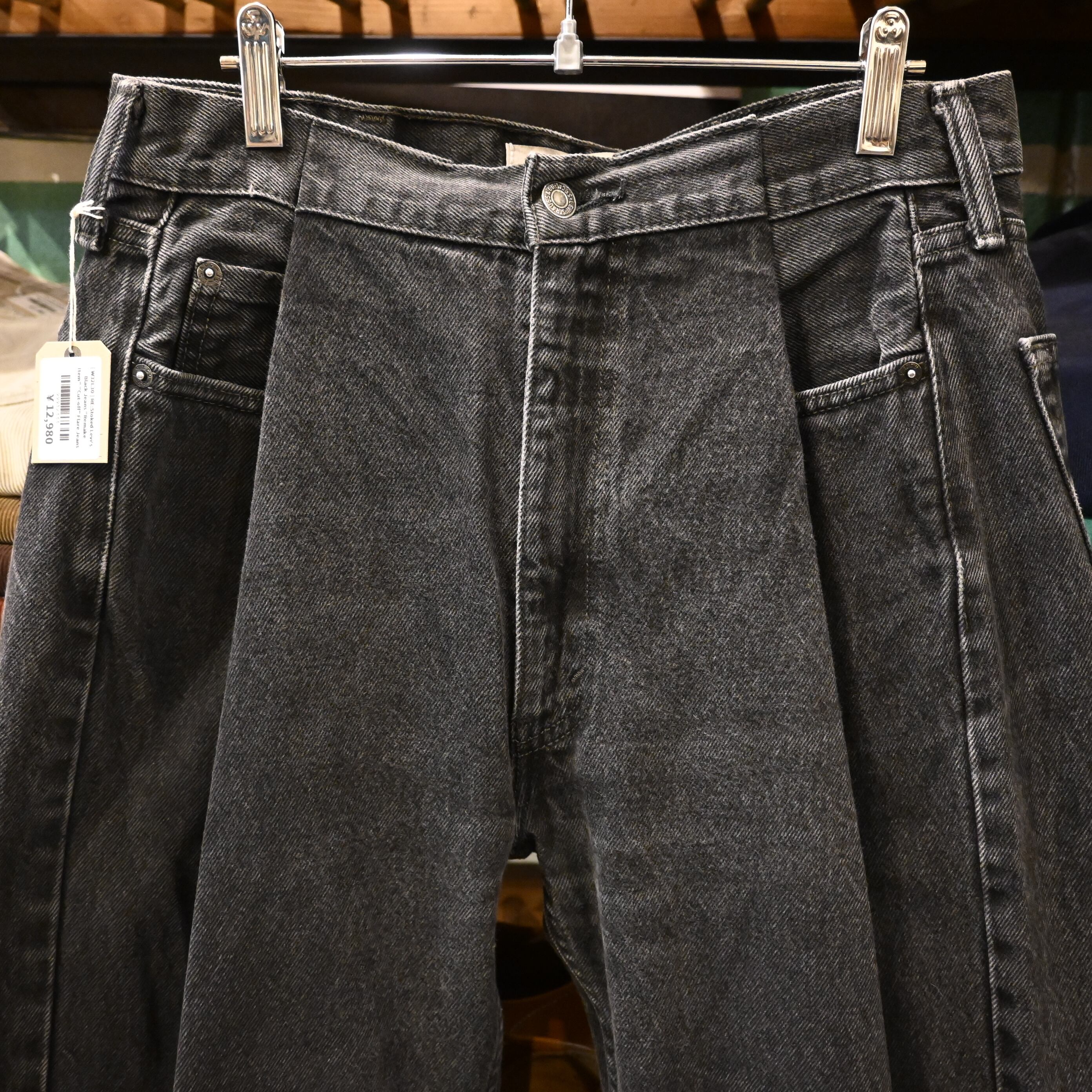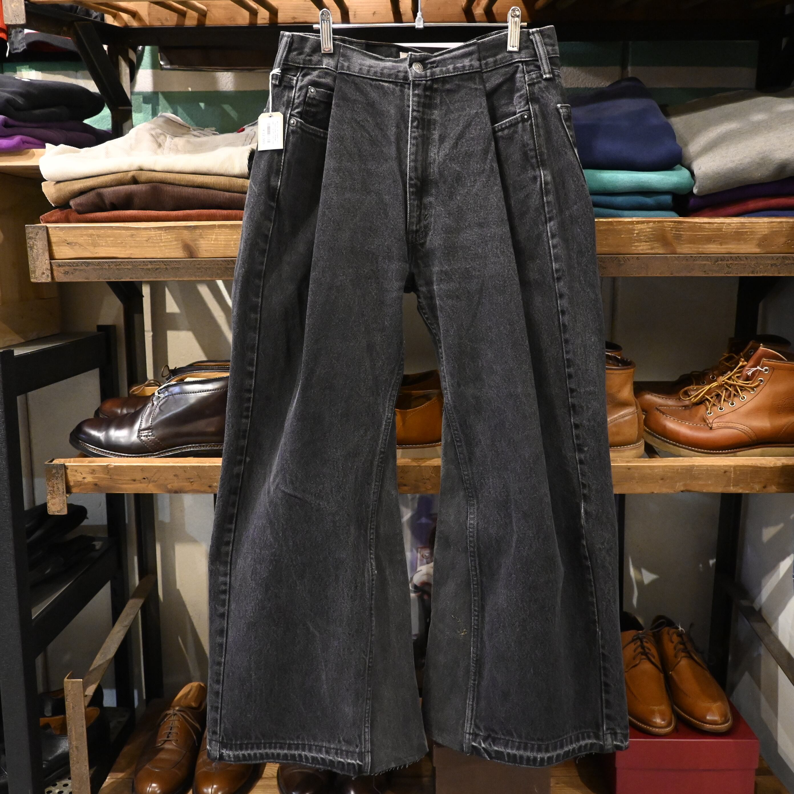 裾をカットオフし、広がりのバランスを調整することで、古着特有のフェード感を活かしつつ、現代的なワイド・フレアシルエットへとアップデートしています。