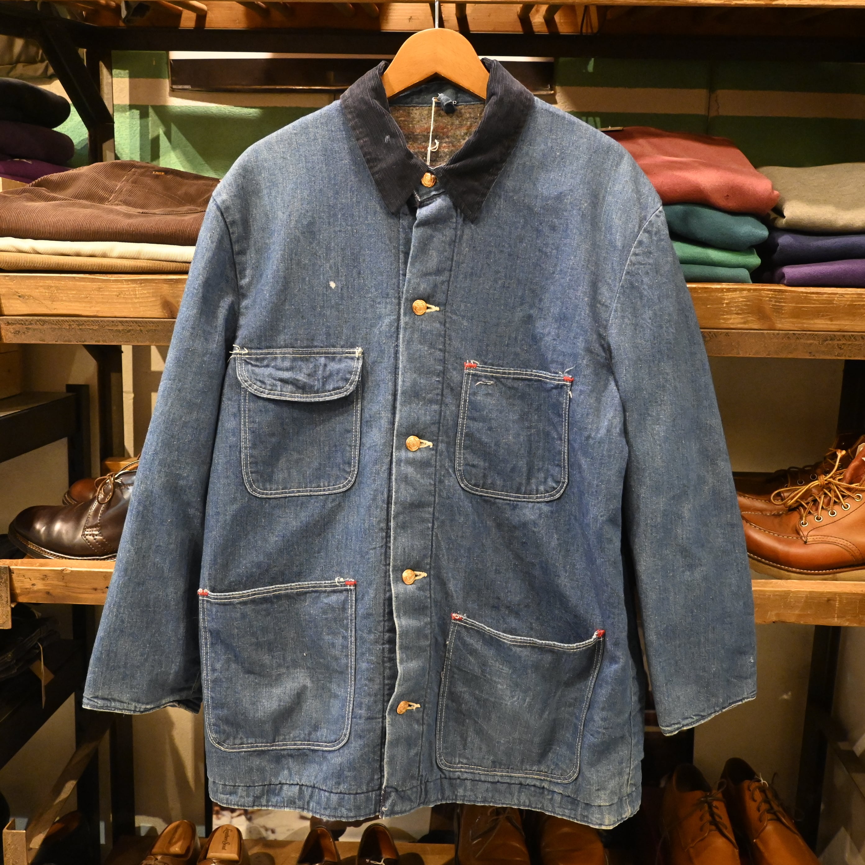 特徴的なコーデュロイ襟、丸みのあるワークポケット、味の出たデニムの縦落ちなど、ヴィンテージならではの雰囲気をしっかりと感じられる一着。