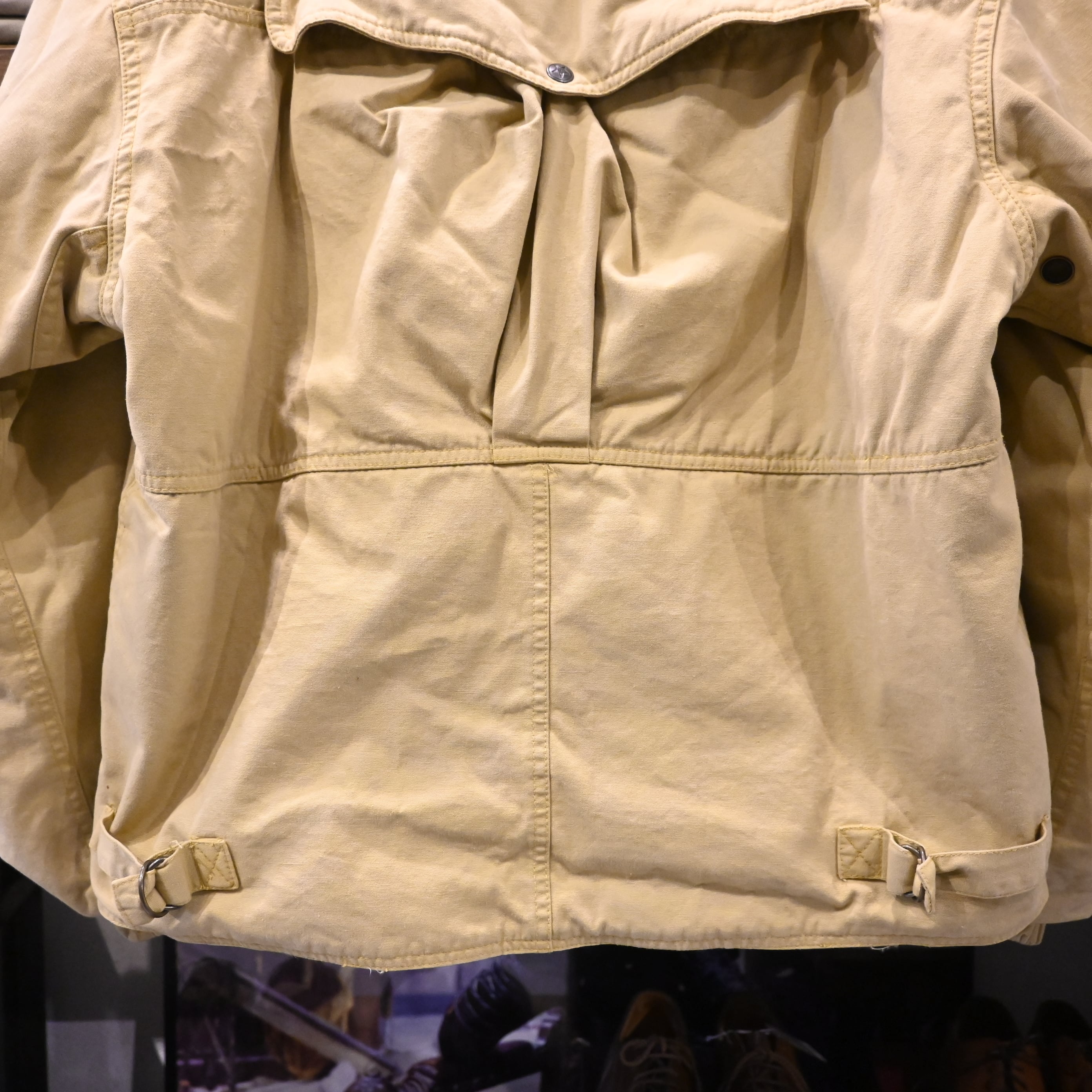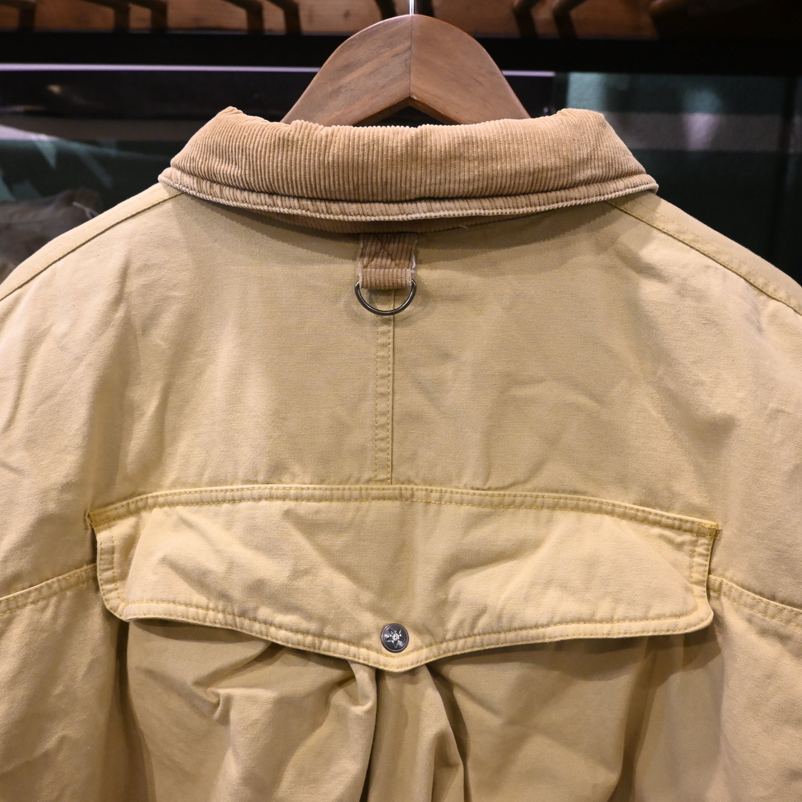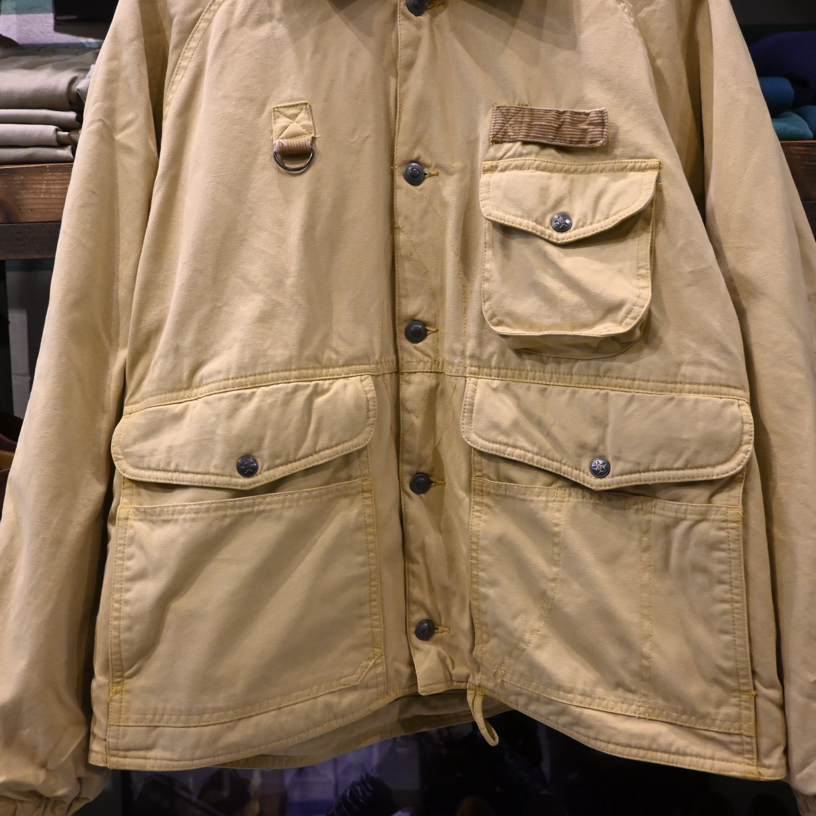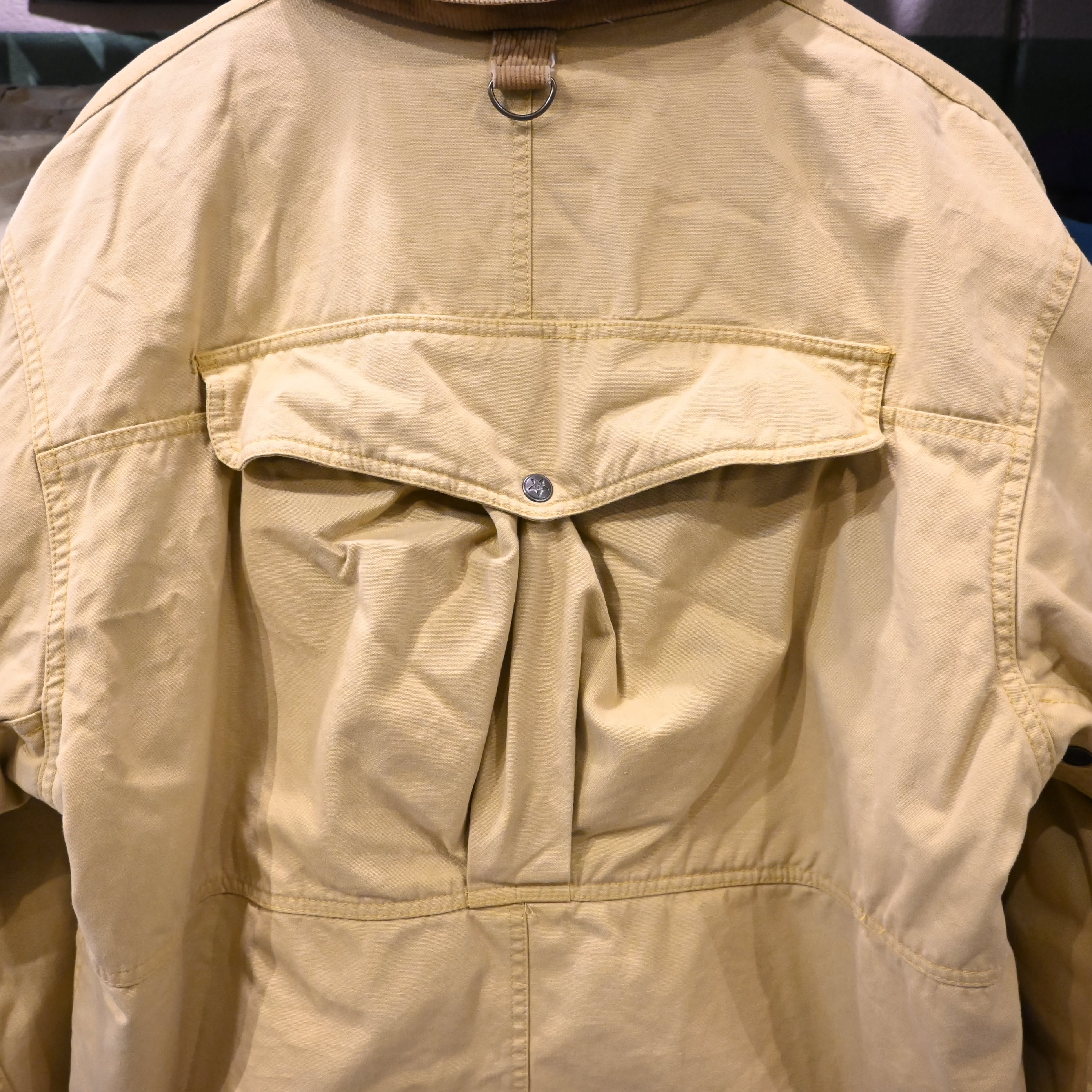 フロントには計4つのフラップポケットと胸のユーティリティポケット、Dリングを搭載し、実用性を重視した作りになっています。背面にはハンティングウェア特有のゲームポケット(バックポケット)を備え、無骨な雰囲気とヴィンテージらしい存在感を楽しめる一着。