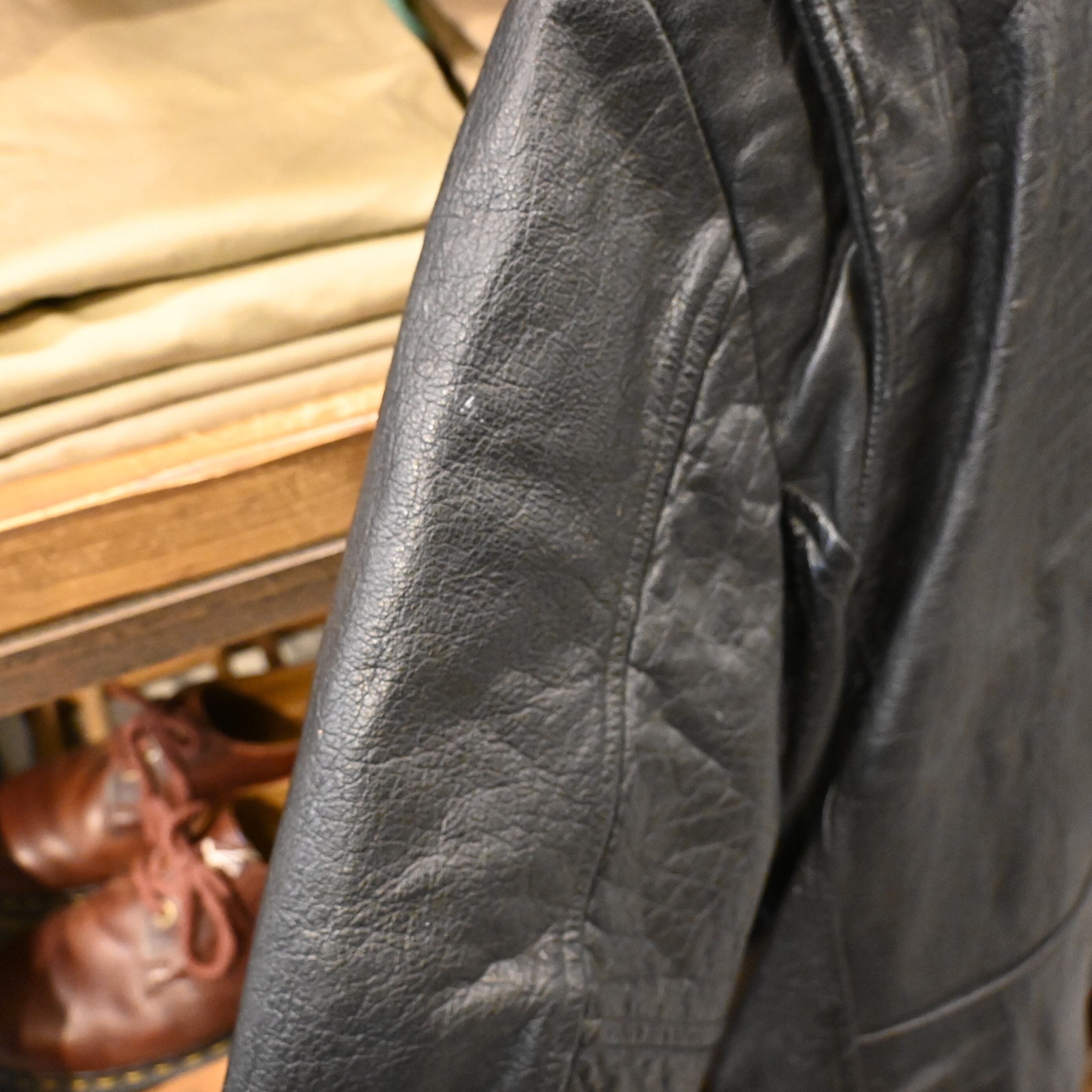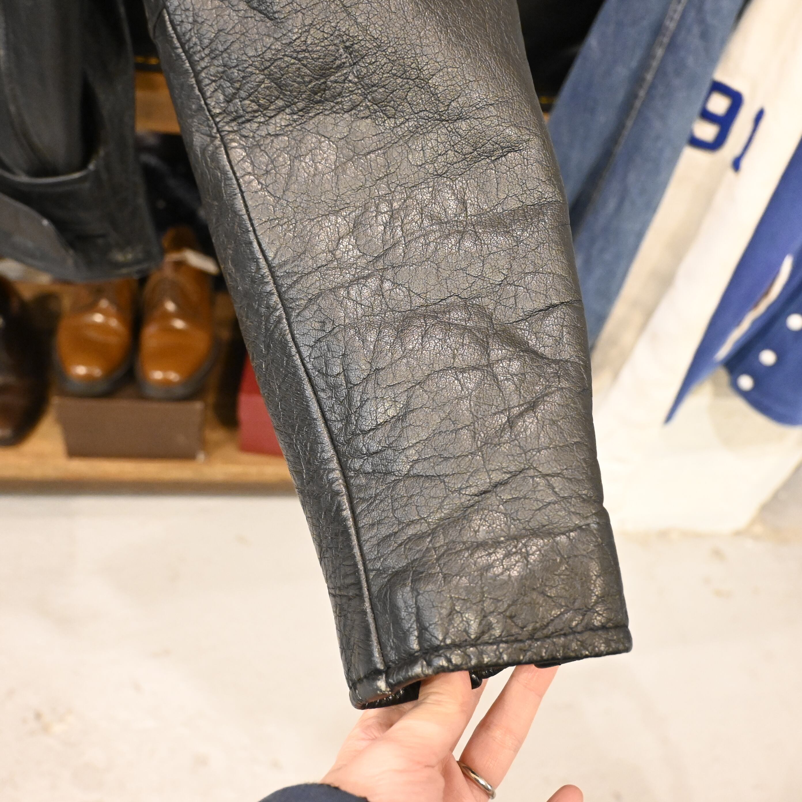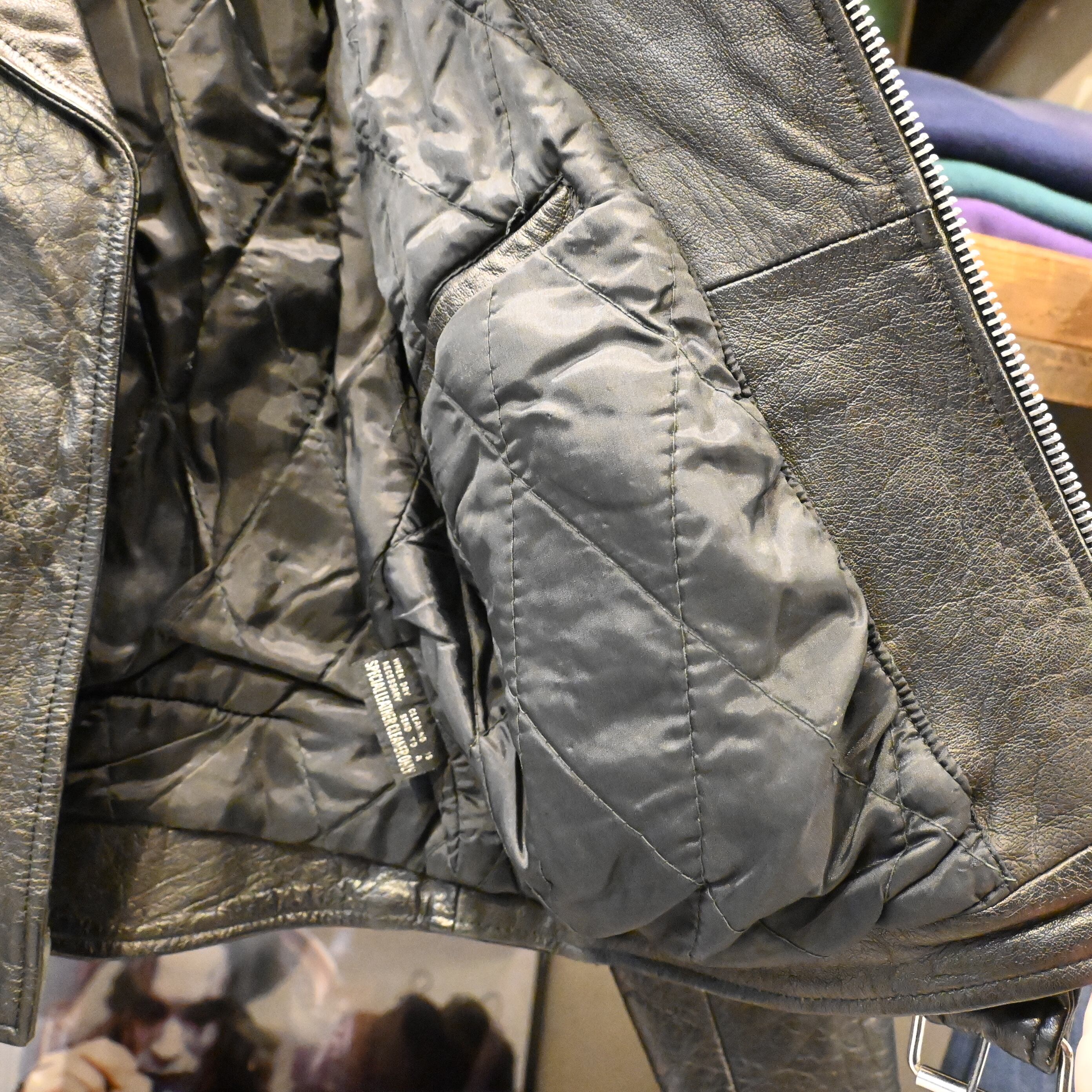 ライニングは中綿入りのキルティング仕様で、防寒性も高く、秋冬シーズンに最適。経年によるスレやアタリがありますが、レザー特有の風合いとして非常に良い雰囲気に仕上がっています。