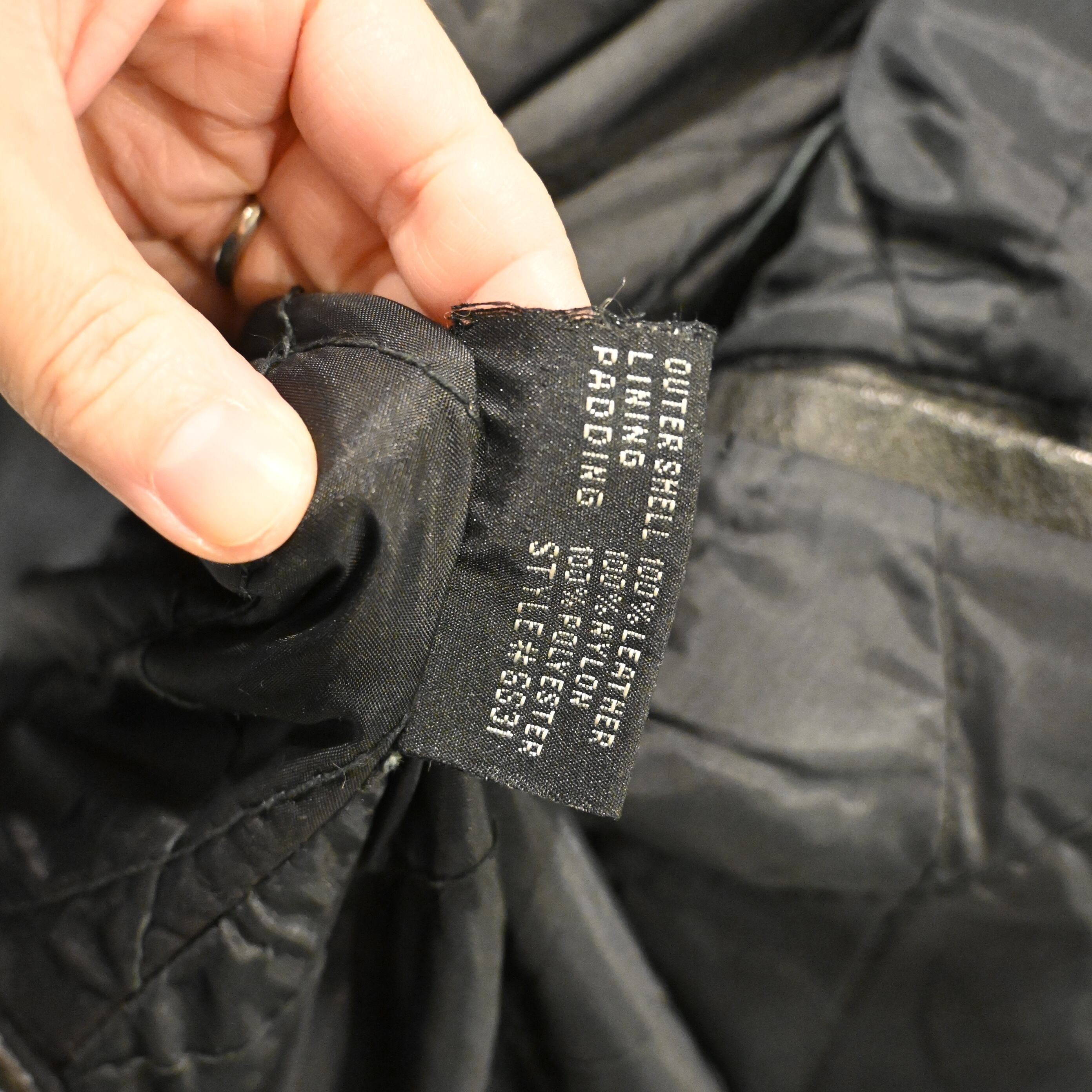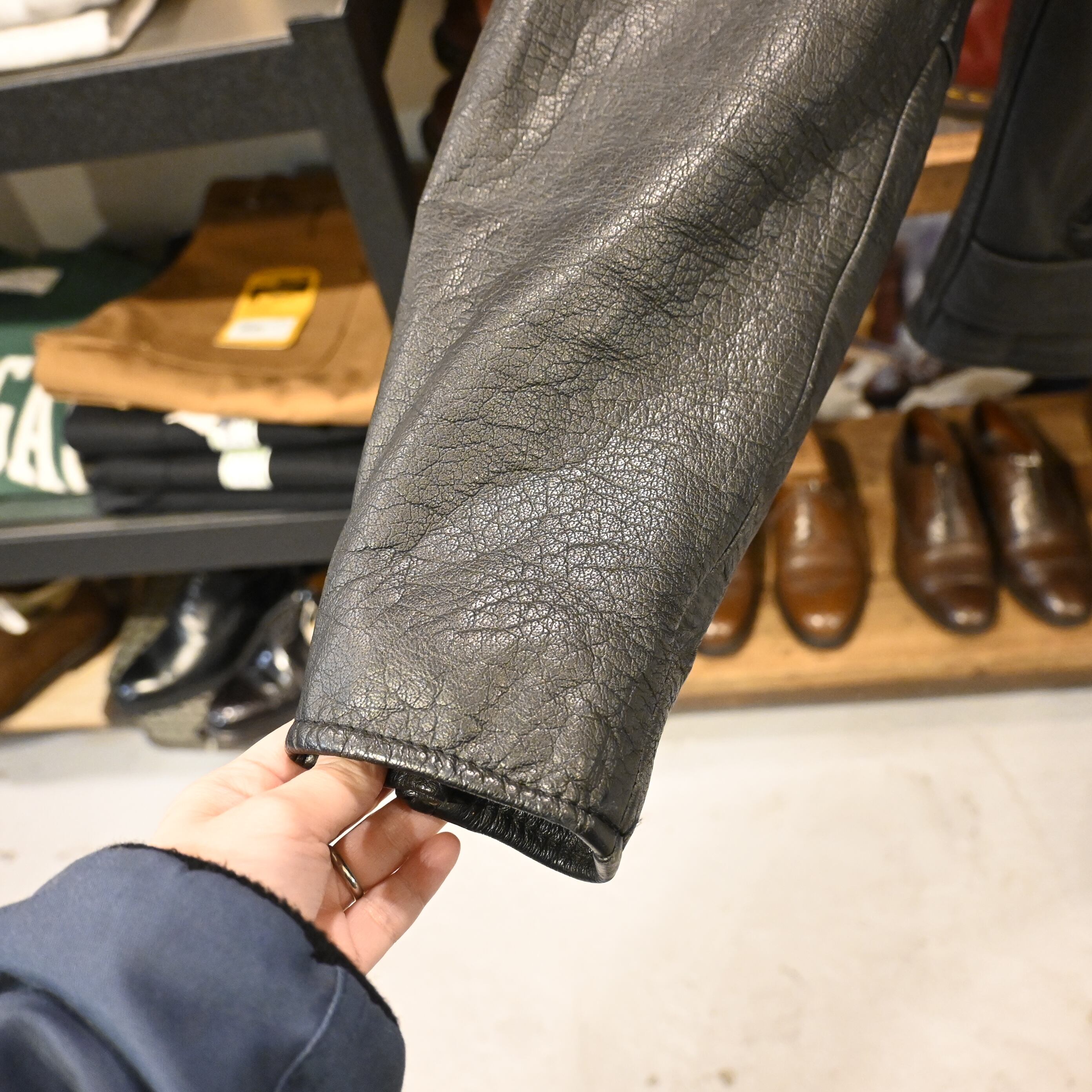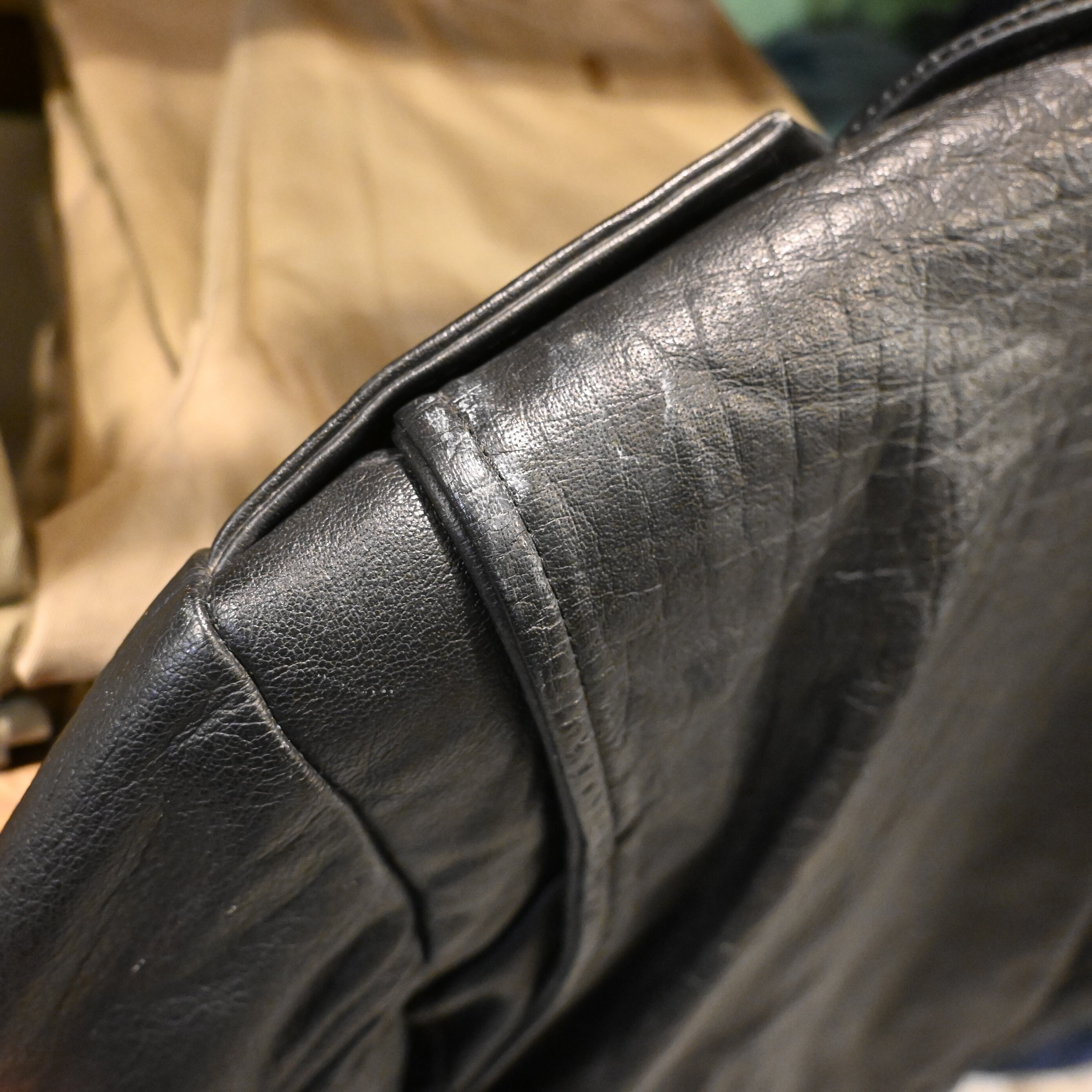 ライニングは中綿入りのキルティング仕様で、防寒性も高く、秋冬シーズンに最適。経年によるスレやアタリがありますが、レザー特有の風合いとして非常に良い雰囲気に仕上がっています。