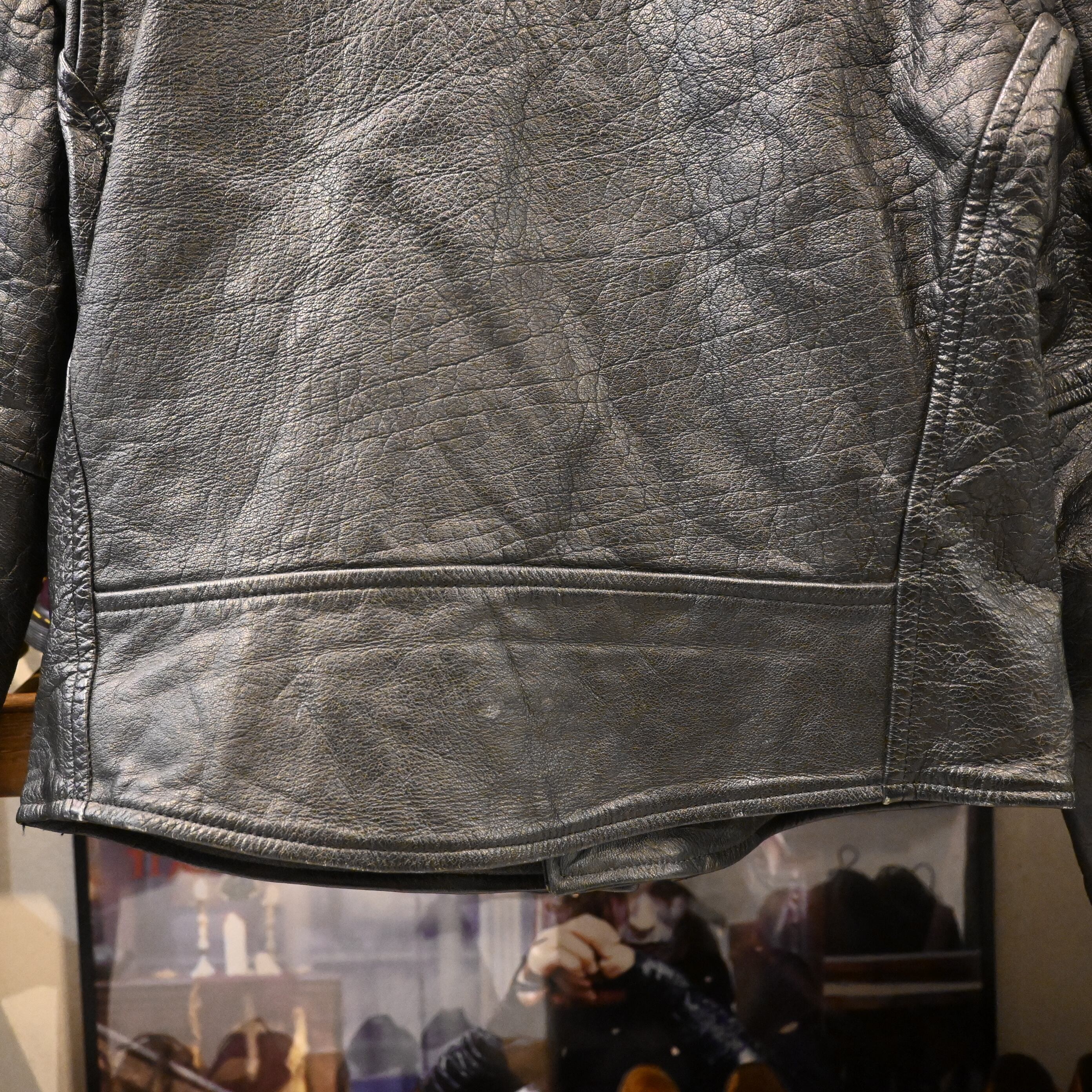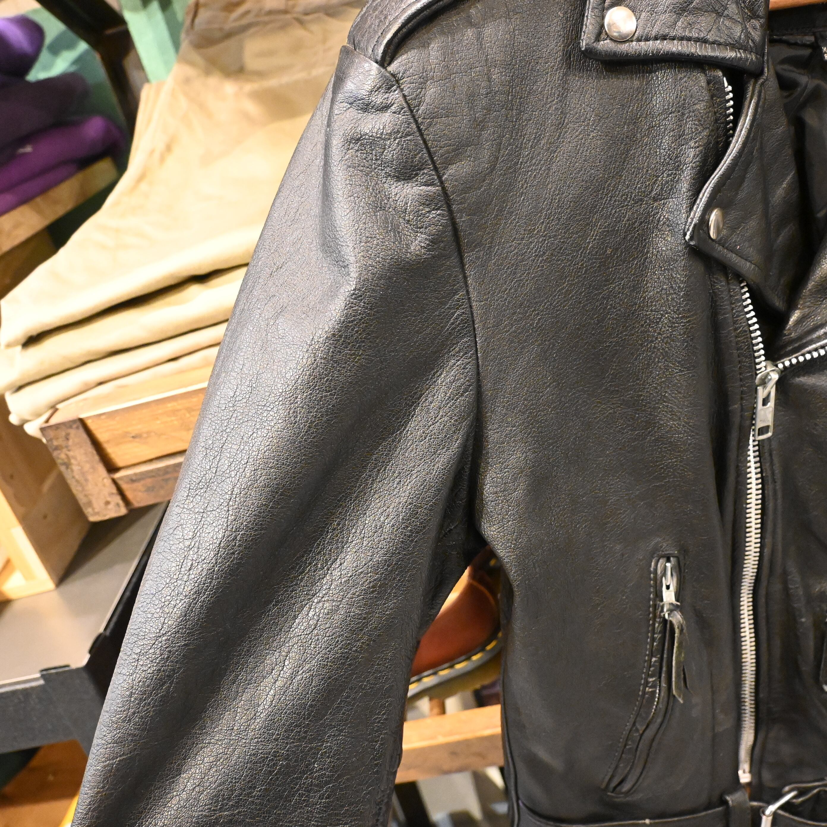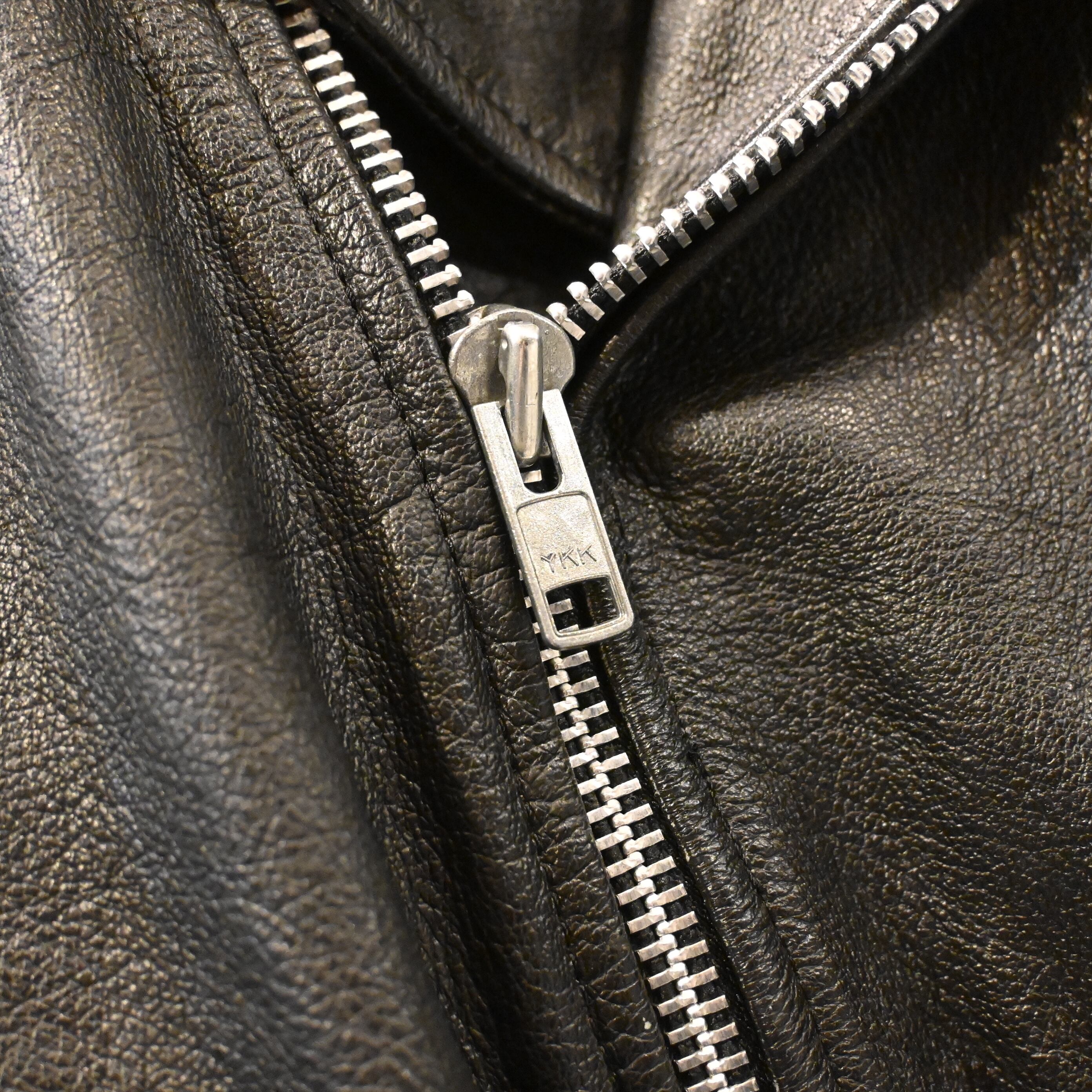 ブランド名の通りしっかりとしたレザー使いが特徴で、こちらの1着もシボ感の強い厚手レザーが魅力。メインジッパーには太番手のYKKジップ、袖ジップ、斜めハンドポケット、フラップポケット、ウエストベルトなど、クラシックなバイカージャケットのディテールが揃っています。