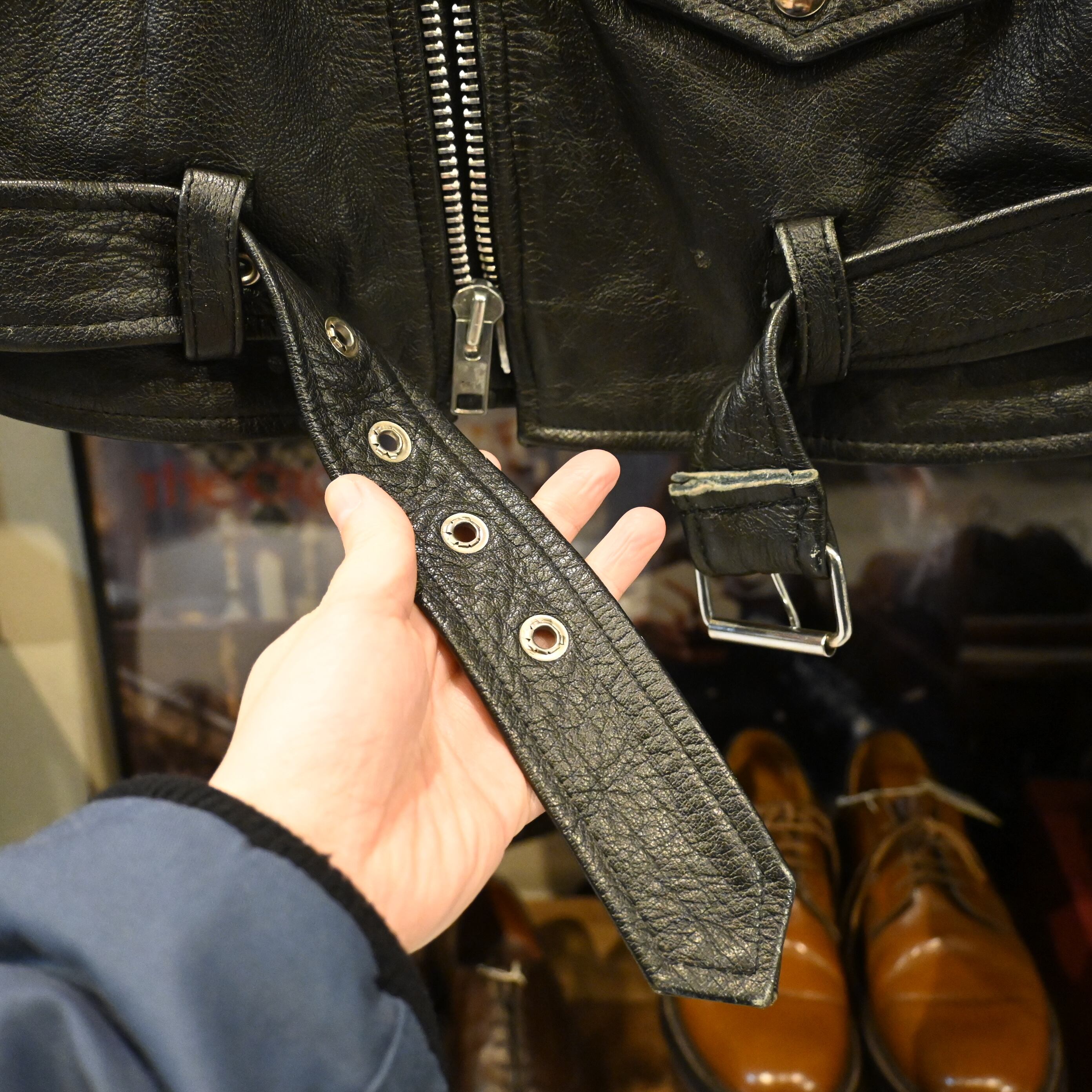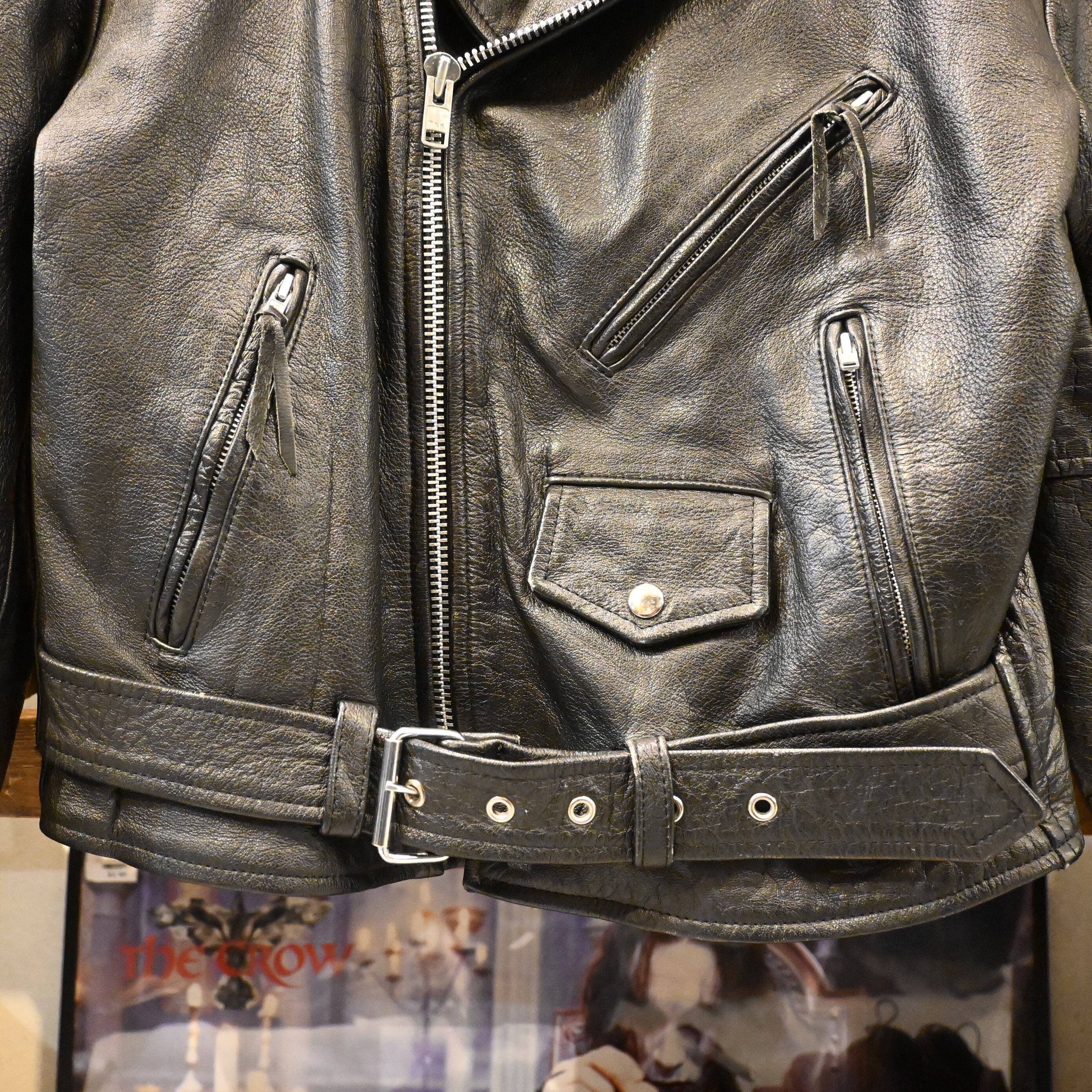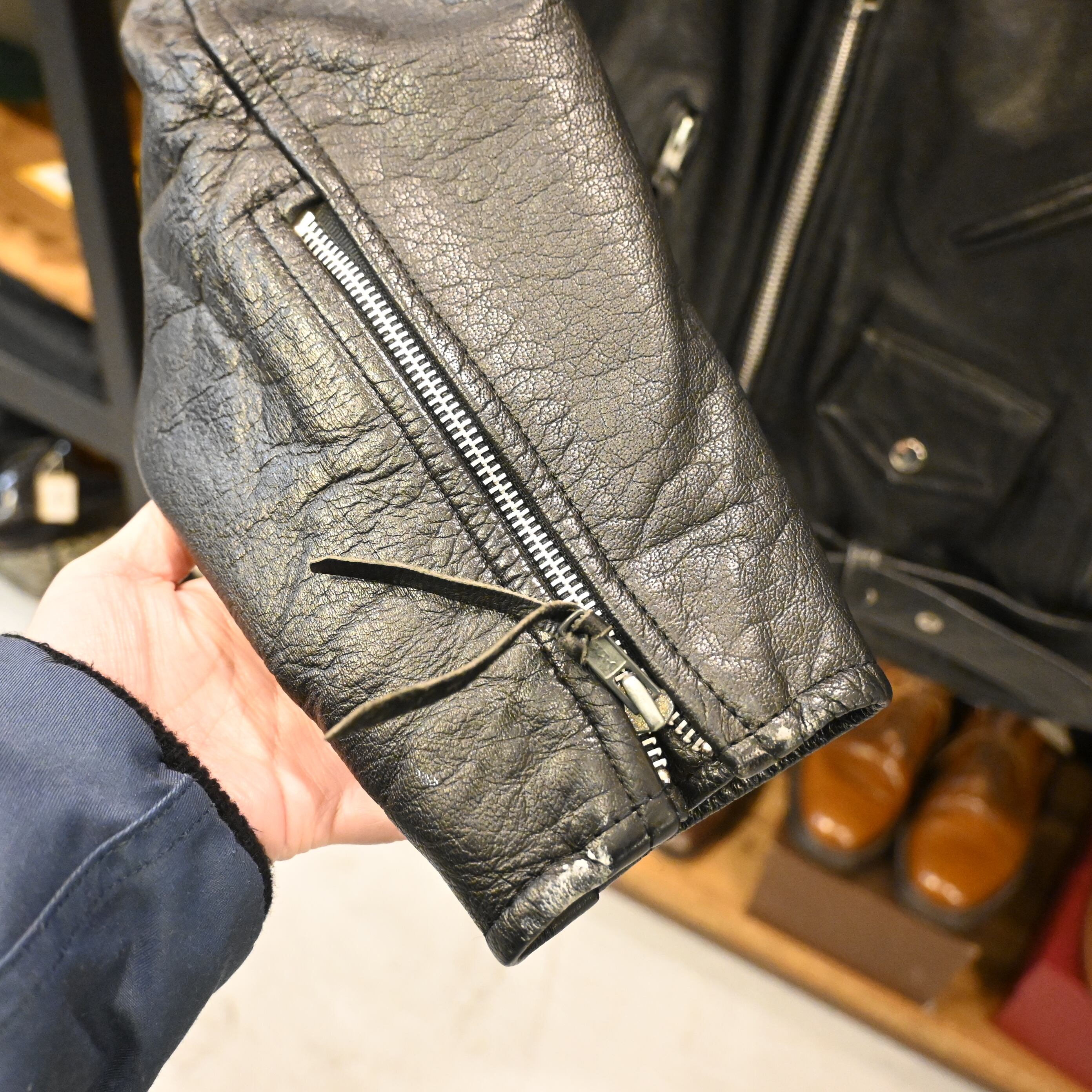 ブランド名の通りしっかりとしたレザー使いが特徴で、こちらの1着もシボ感の強い厚手レザーが魅力。メインジッパーには太番手のYKKジップ、袖ジップ、斜めハンドポケット、フラップポケット、ウエストベルトなど、クラシックなバイカージャケットのディテールが揃っています。