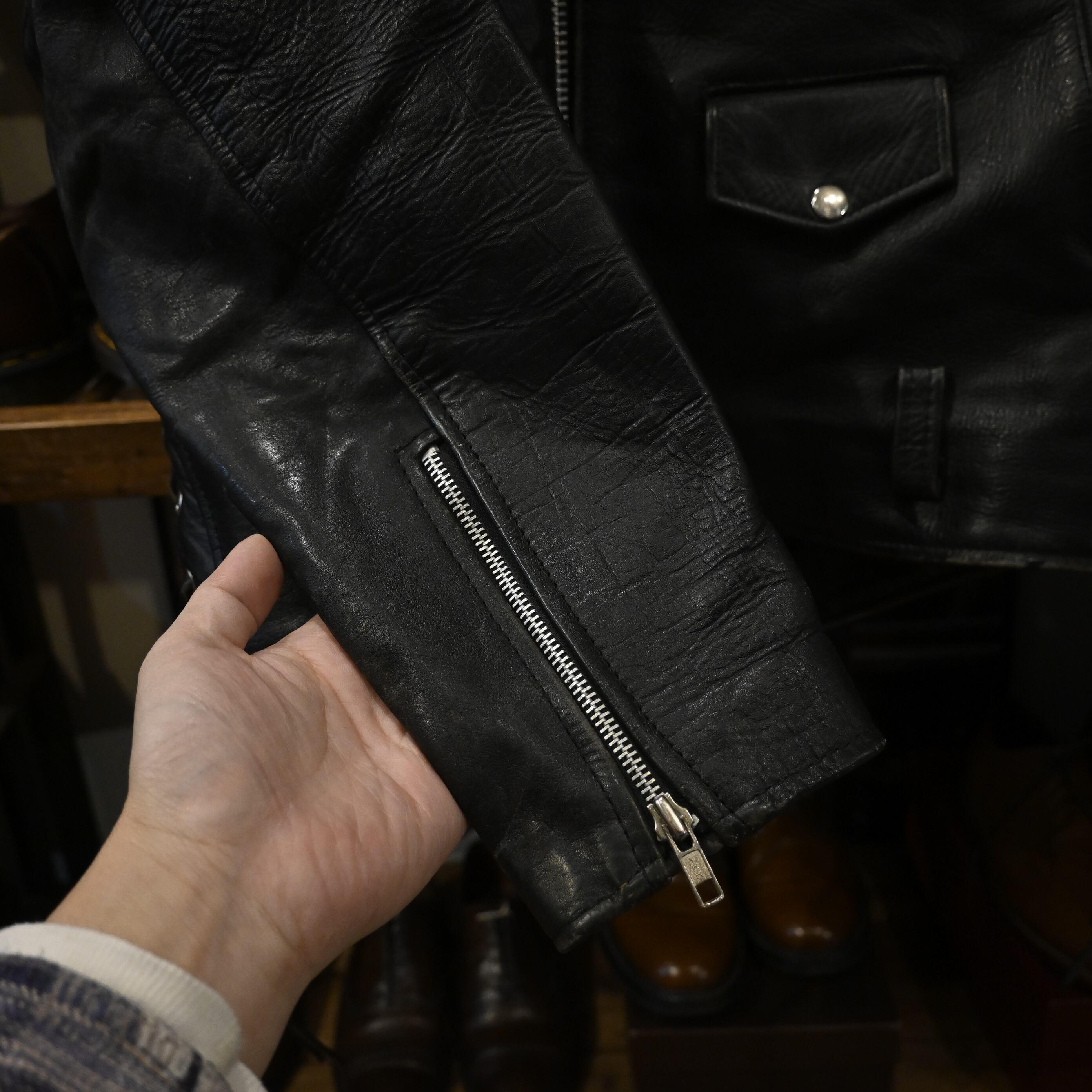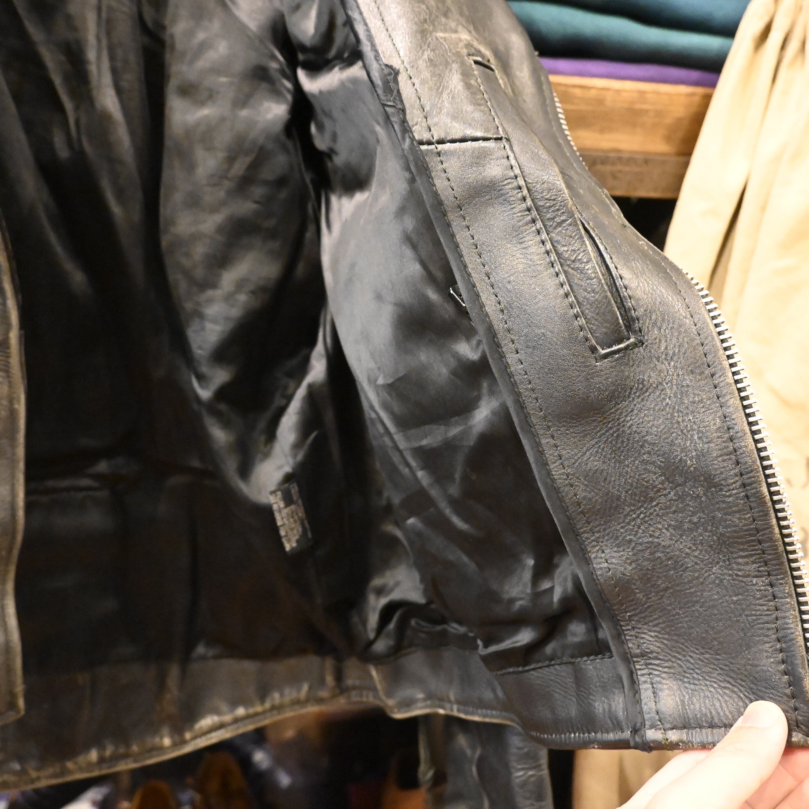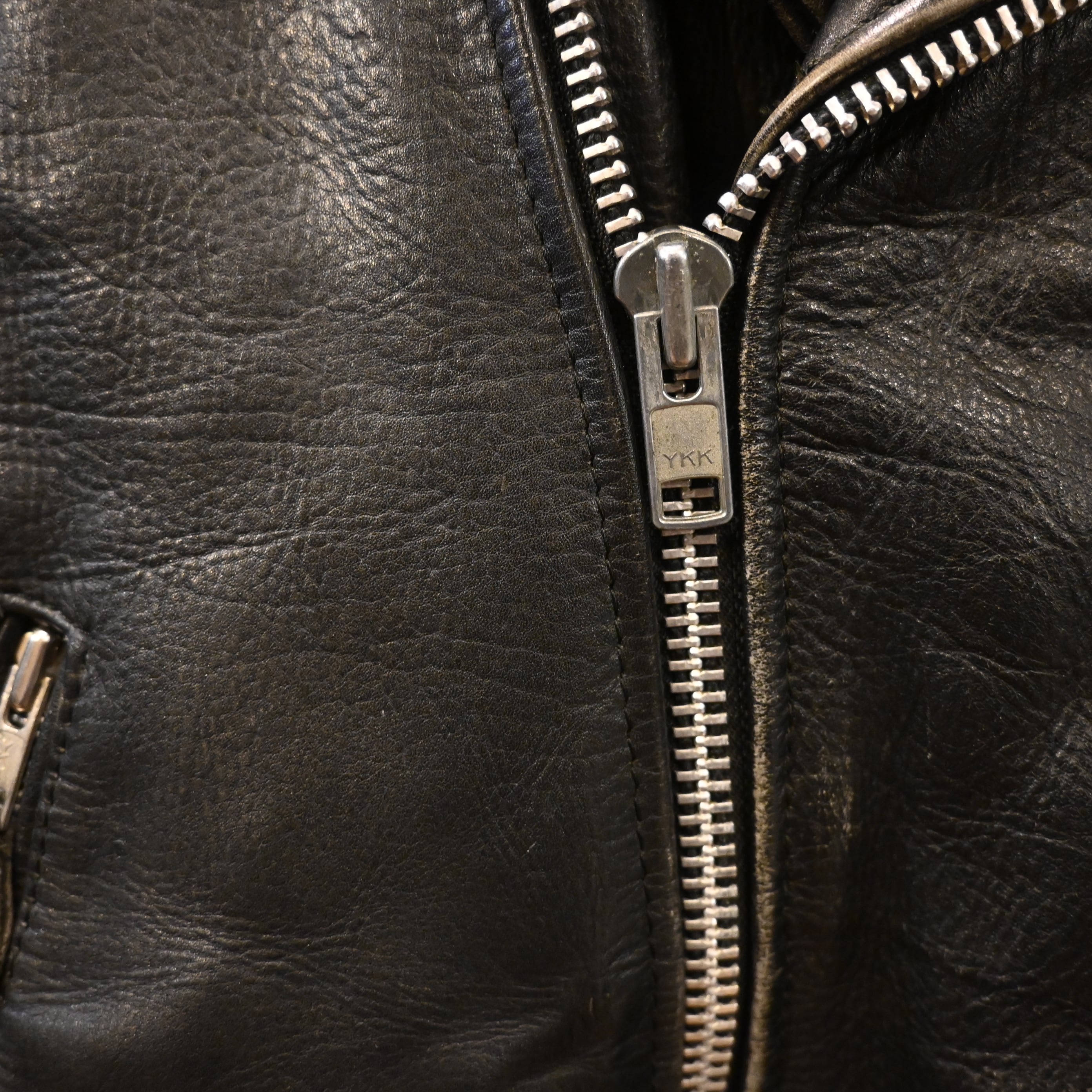 厚みのあるしっかりとしたレザーを使用しており、着込むことでさらに風合いが増すタフな質感が魅力です。太めのメインジップ、斜めジップポケット、フラップポケット、襟元のスナップボタンなど、クラシックなバイカー仕様をしっかり踏襲。