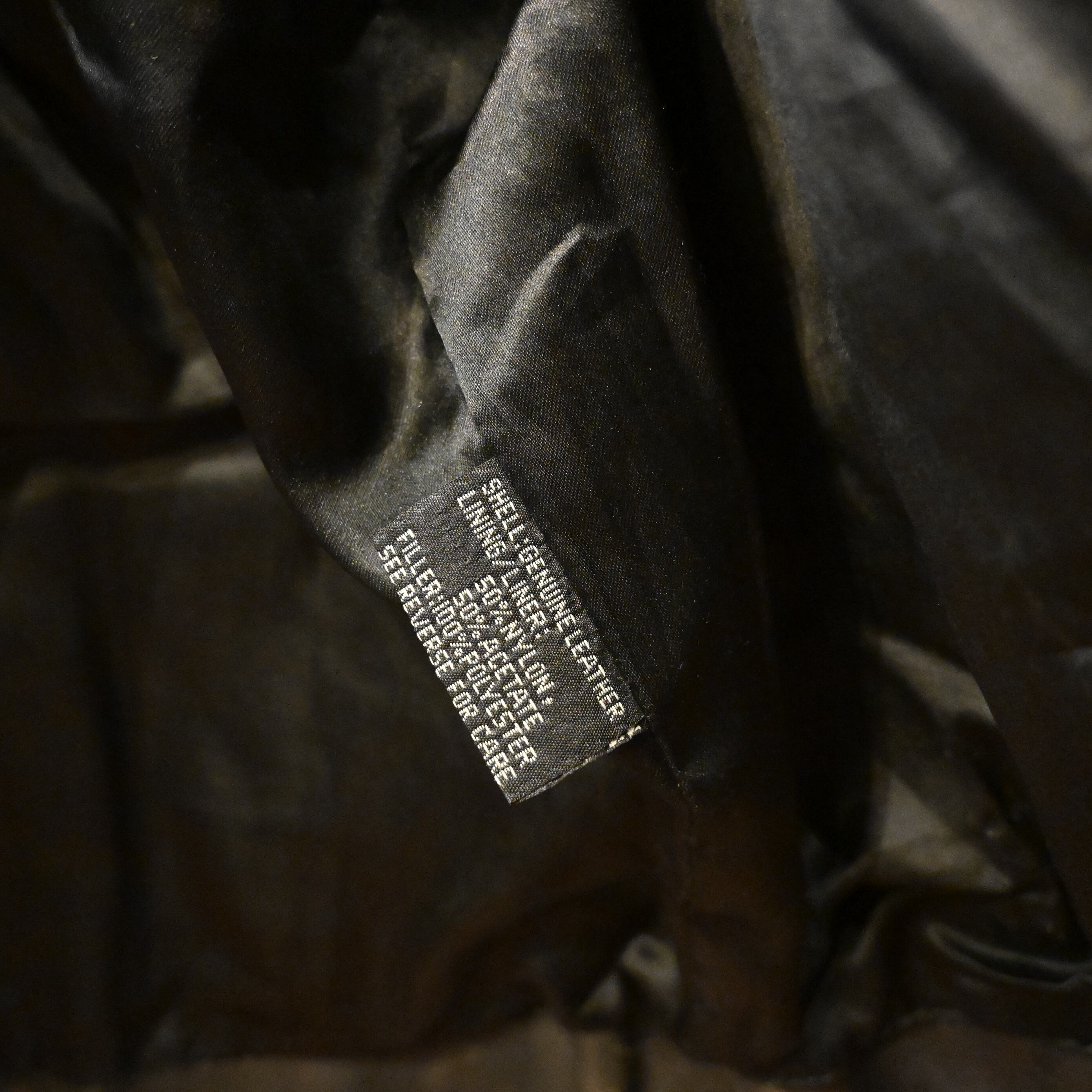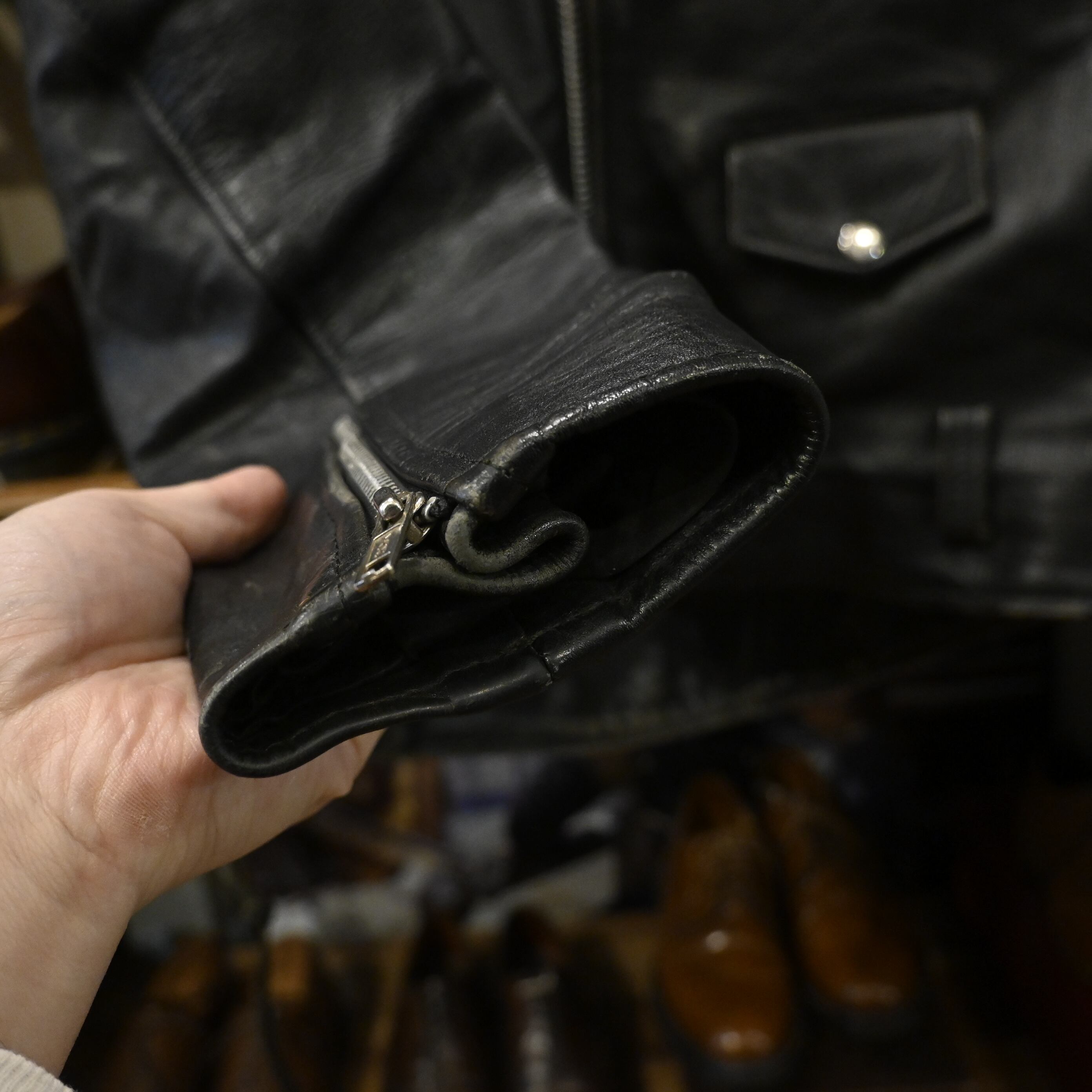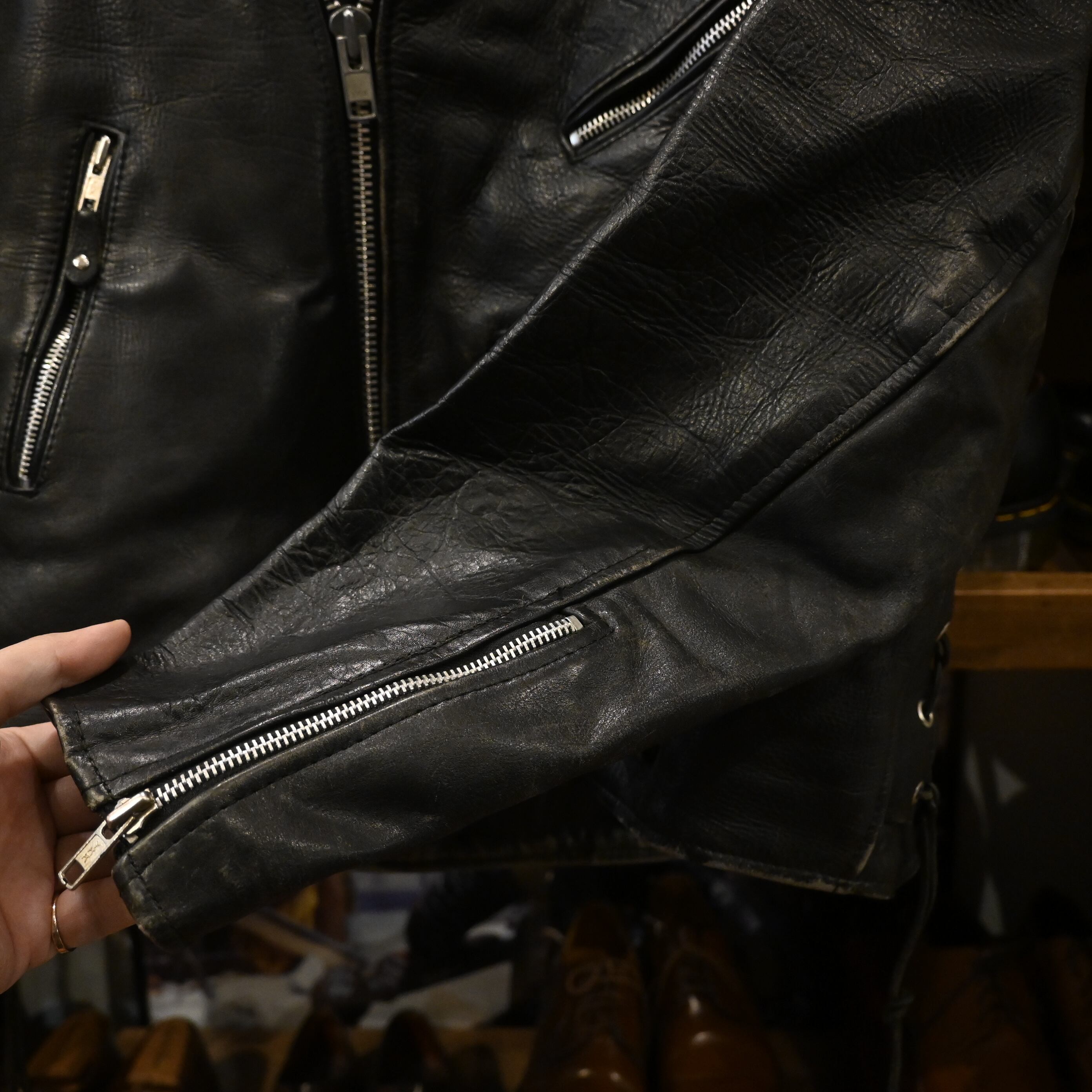 厚みのあるしっかりとしたレザーを使用しており、着込むことでさらに風合いが増すタフな質感が魅力です。太めのメインジップ、斜めジップポケット、フラップポケット、襟元のスナップボタンなど、クラシックなバイカー仕様をしっかり踏襲。