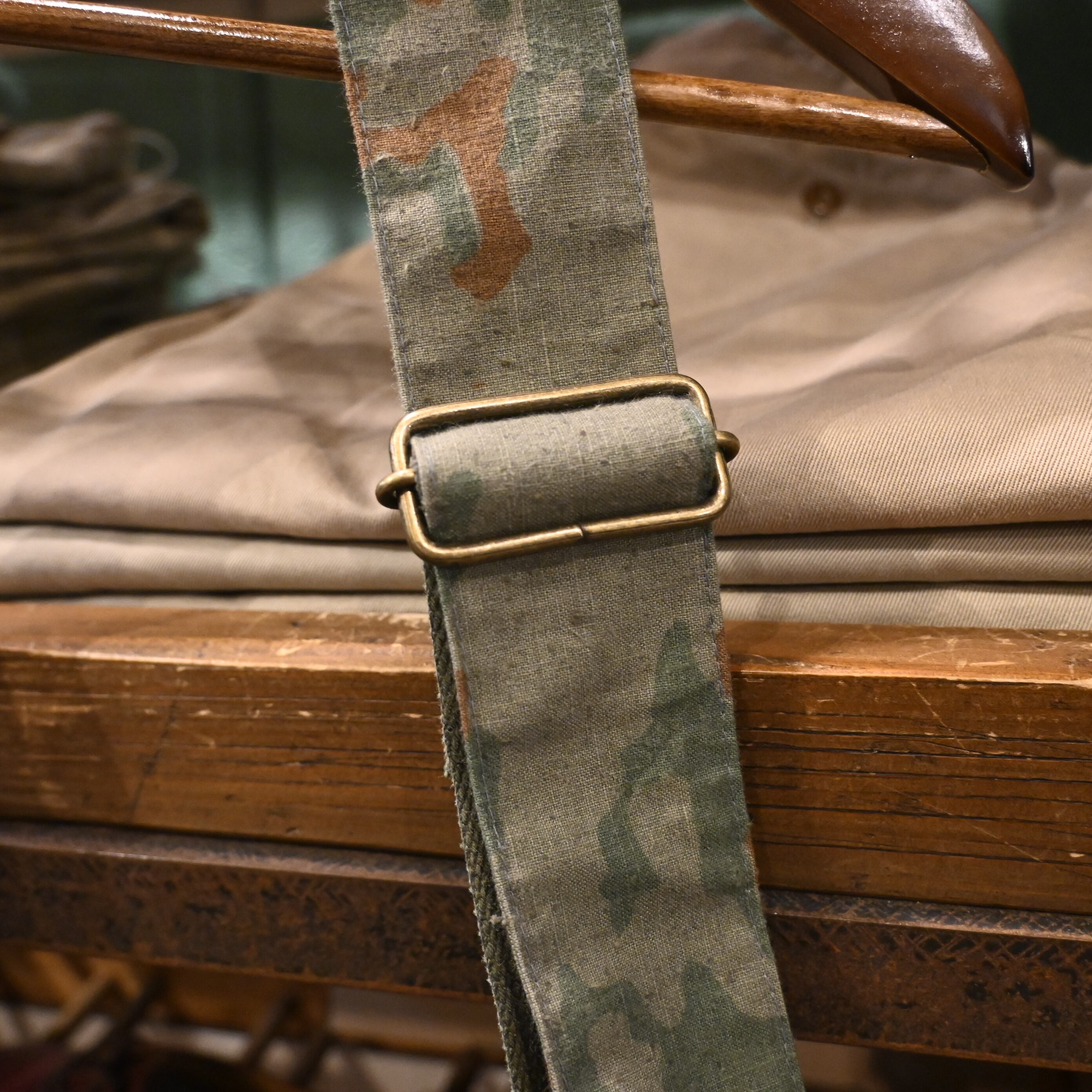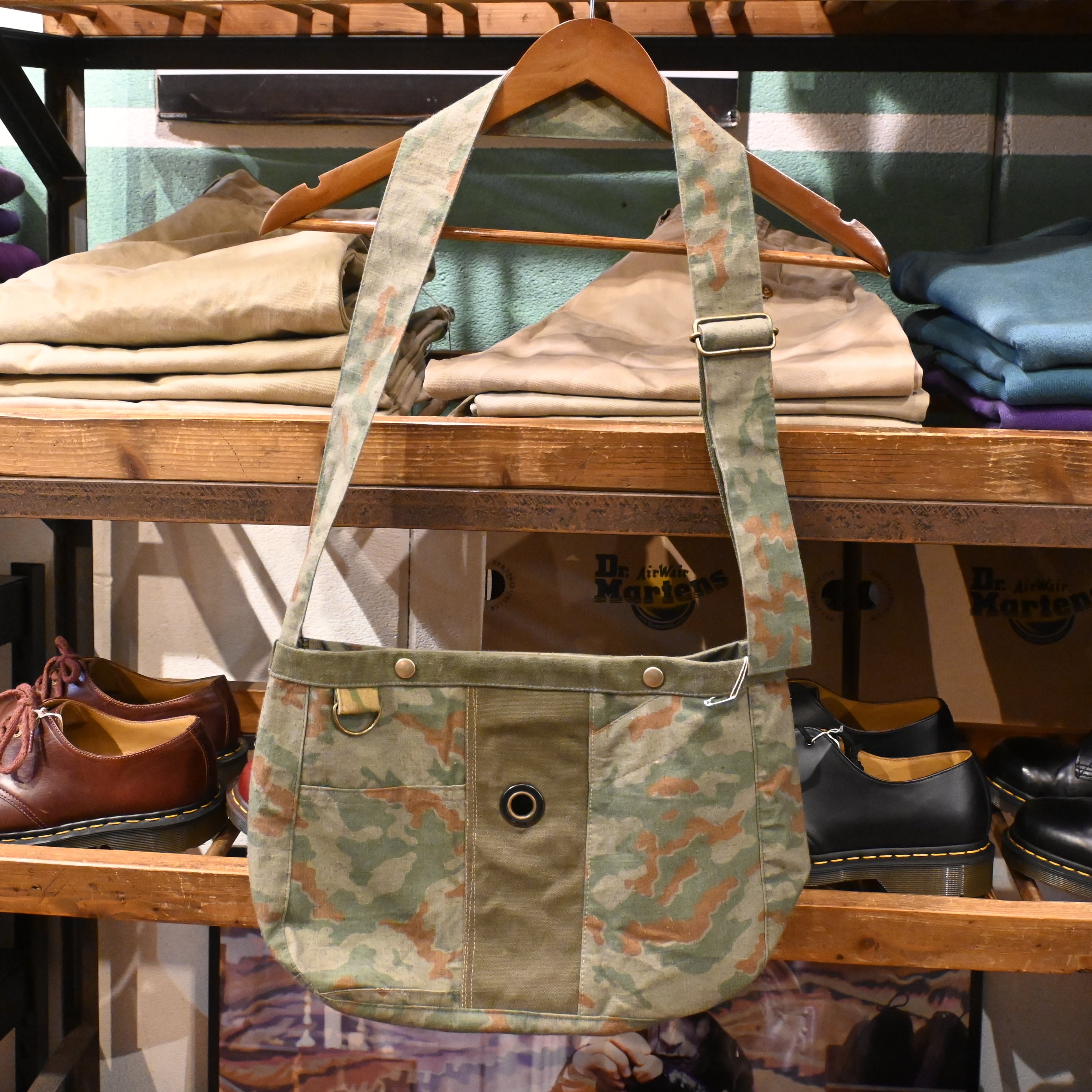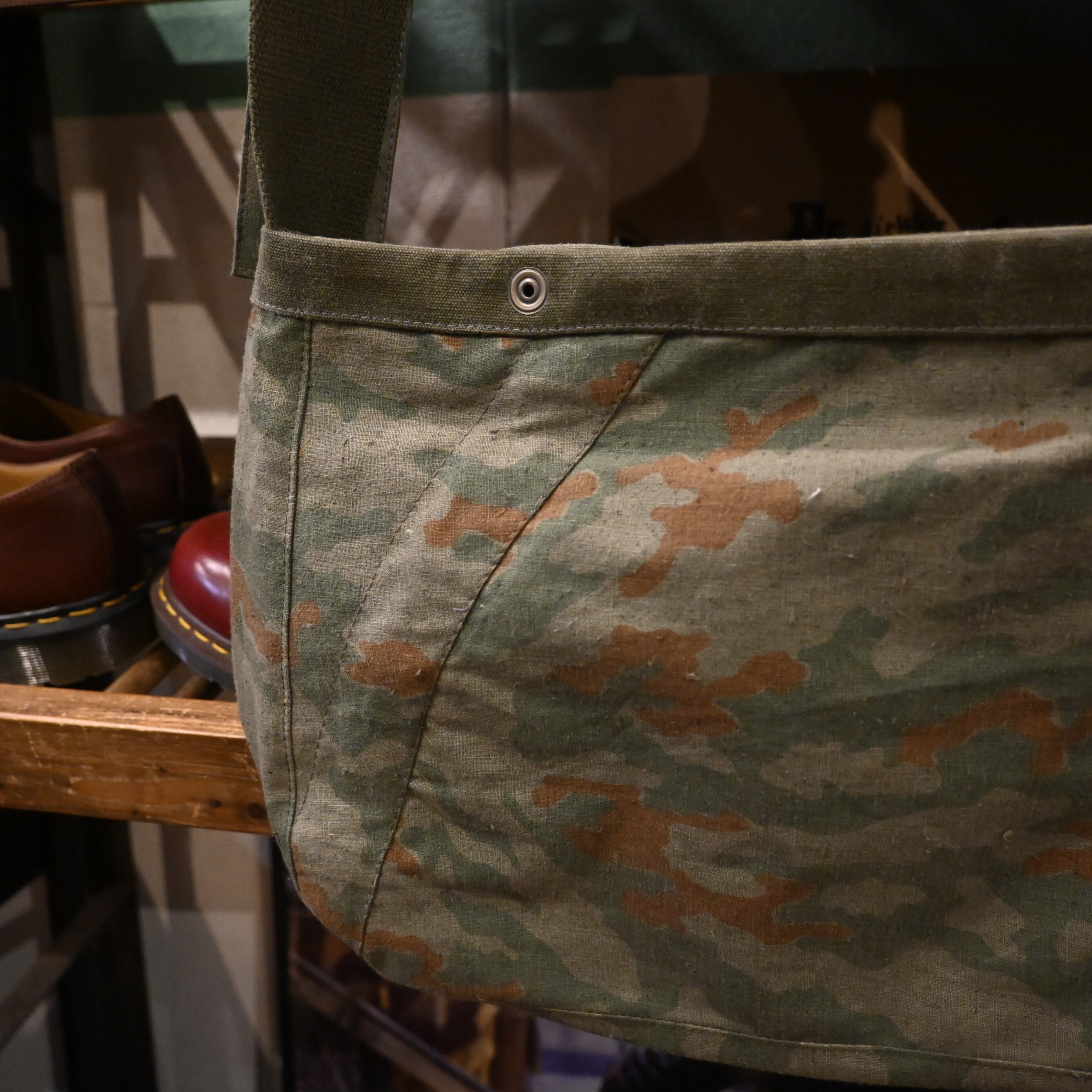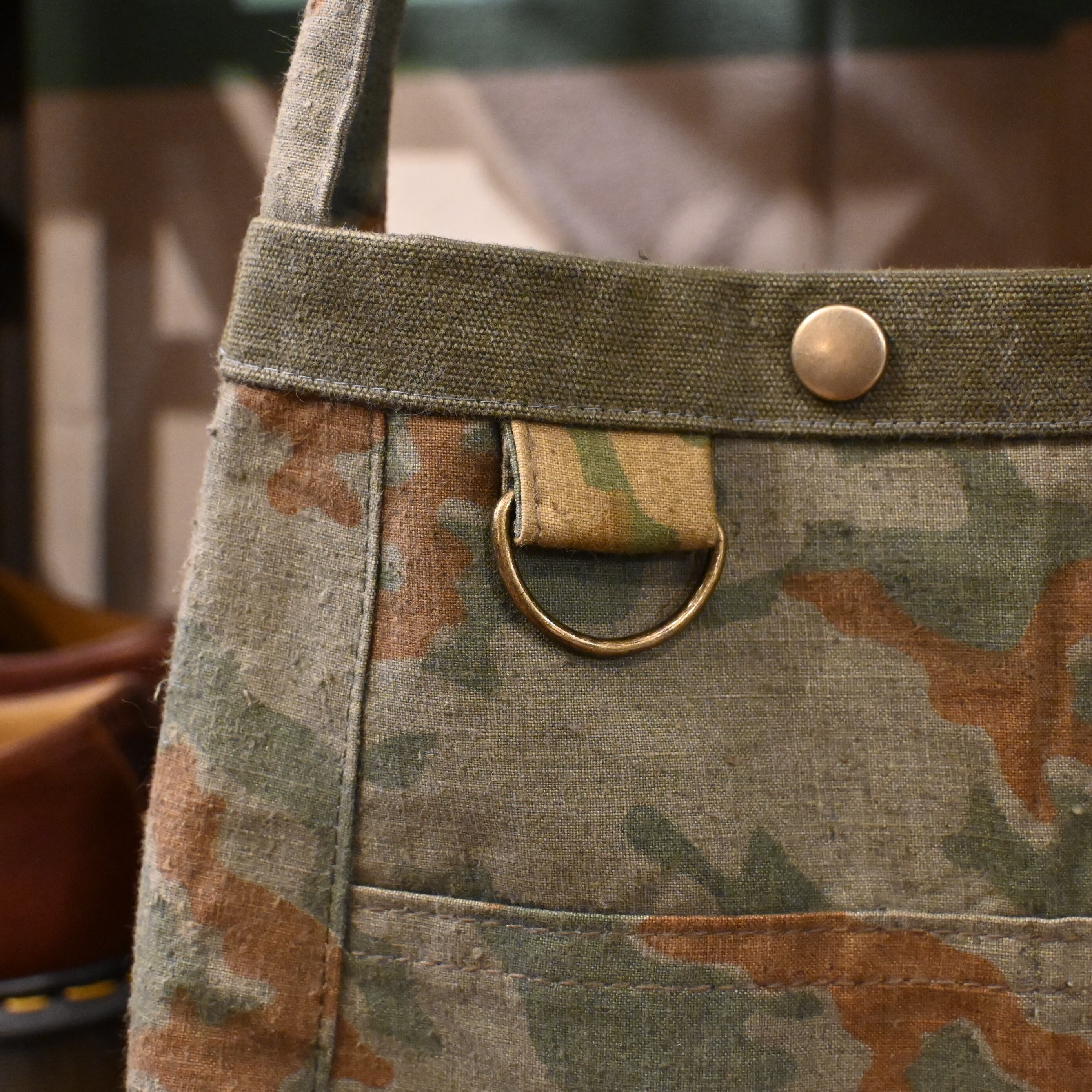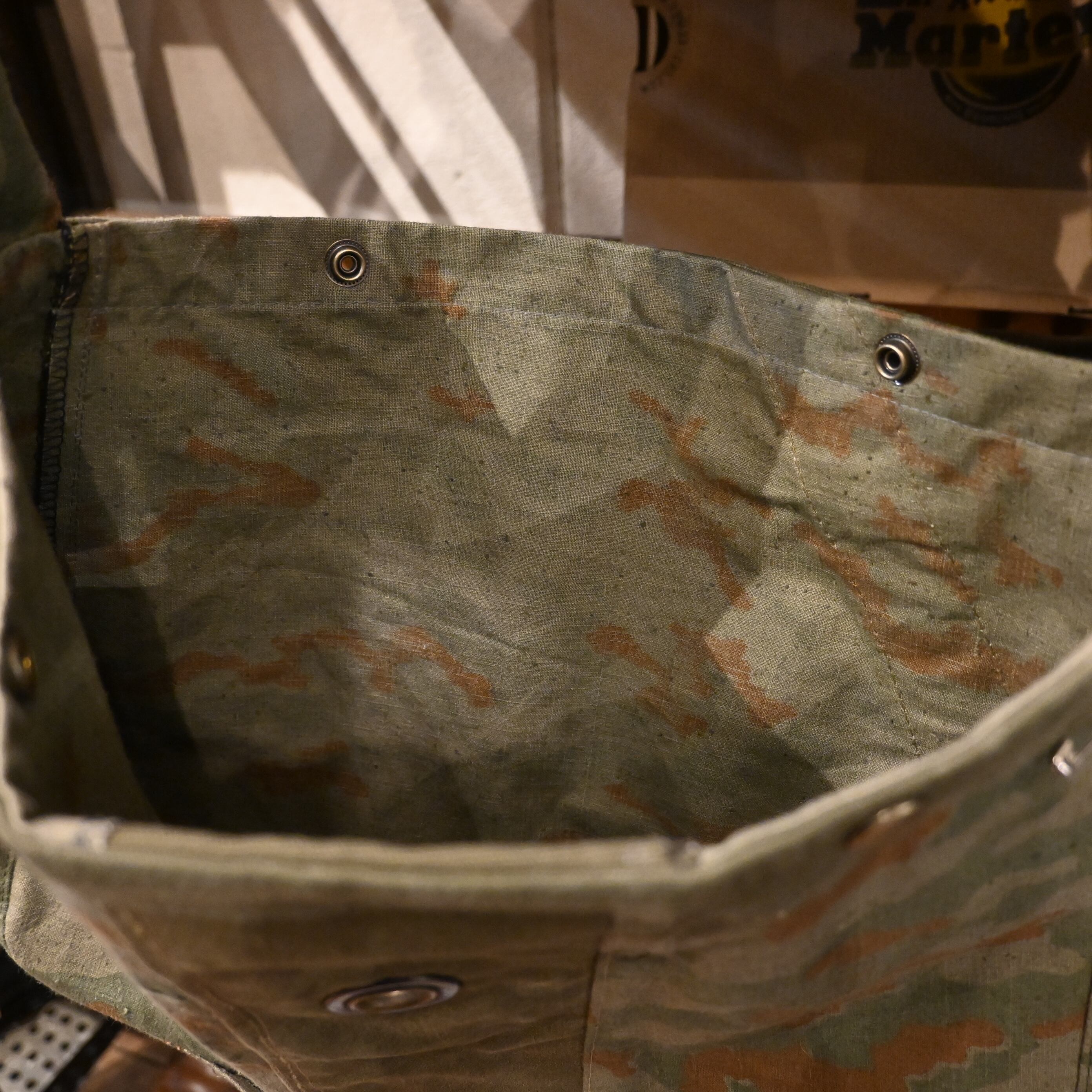 フロント中央には古いコットンキャンバス(USARMY ダッフルバッグのファブリック)をコンビ使いし、スプリンターカモとのコントラストが映える唯一無二の仕上がり。