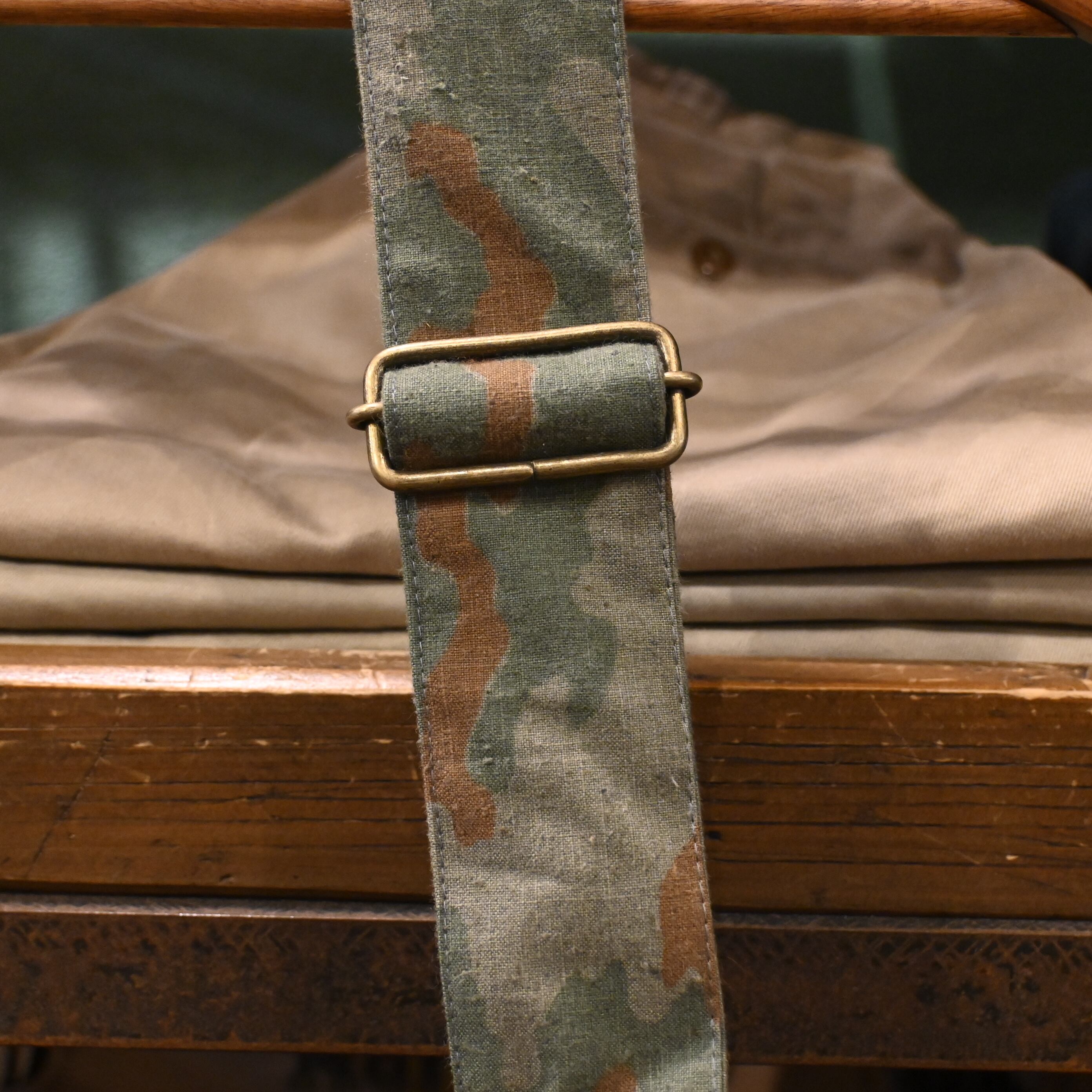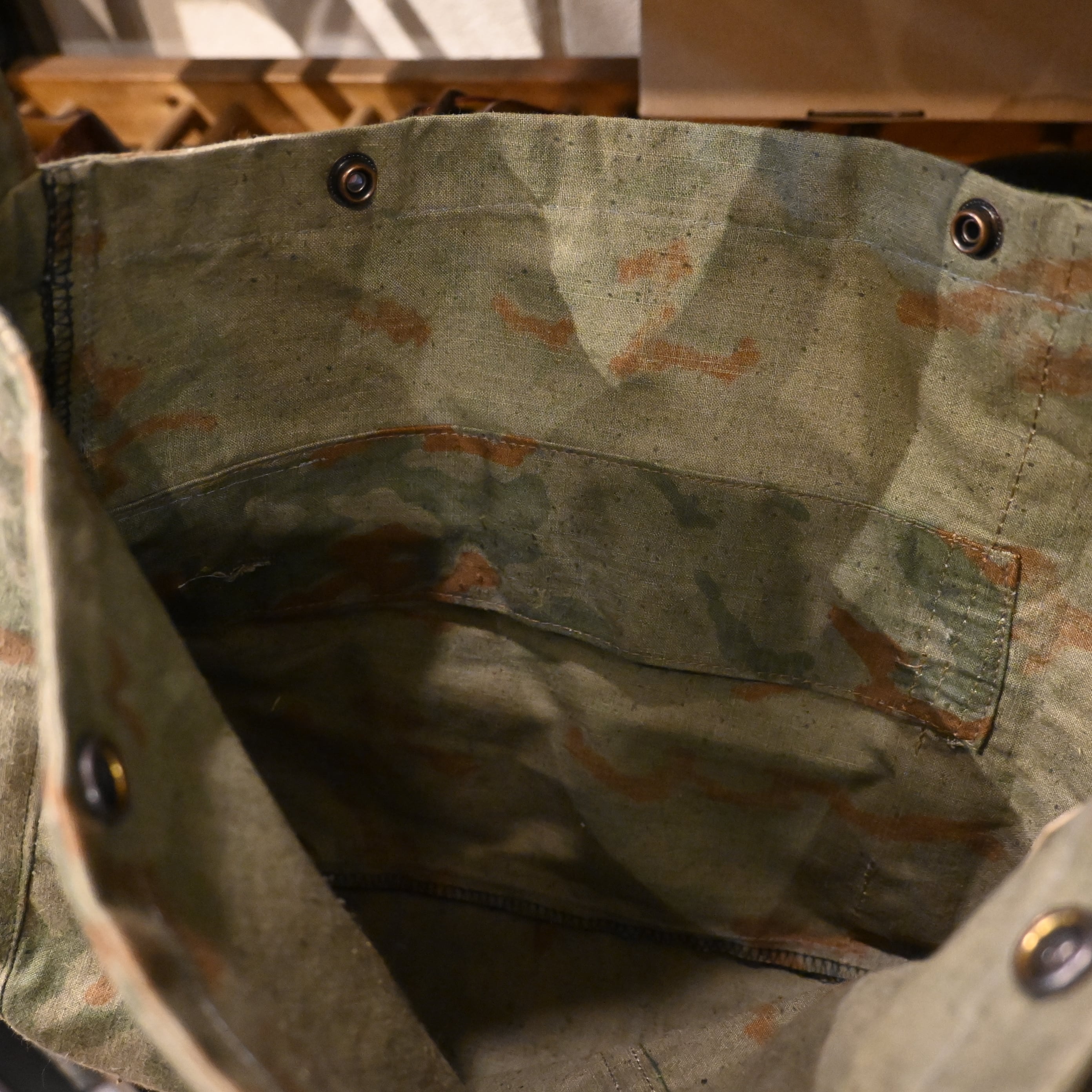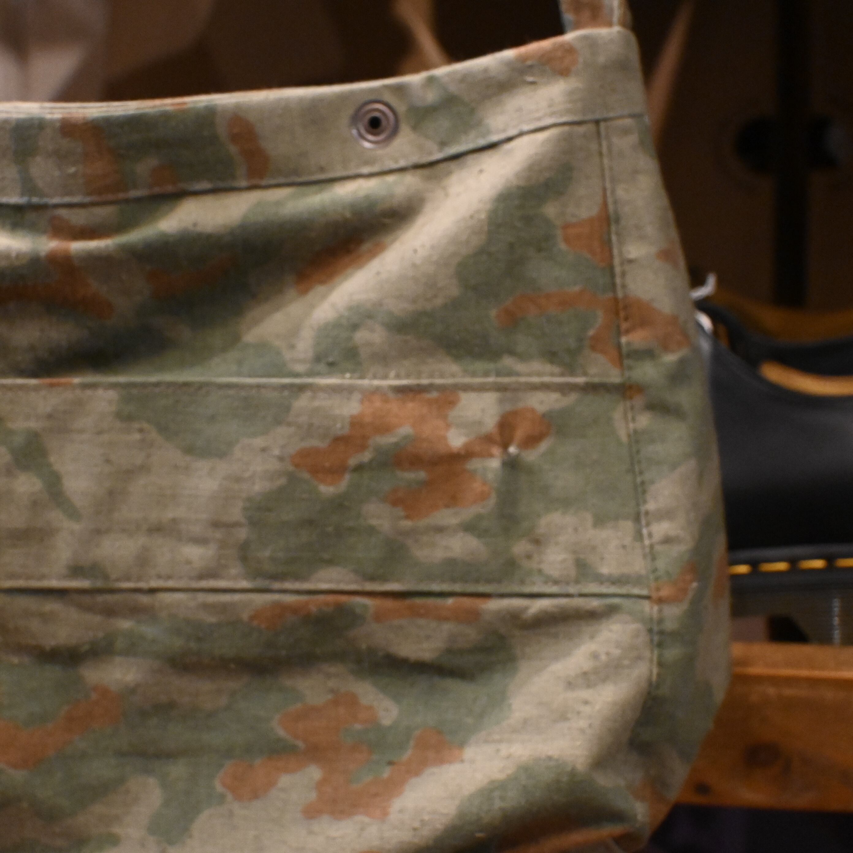 ミリタリーピースならではの古いキャンバスの風合いを楽しめる一点物です。