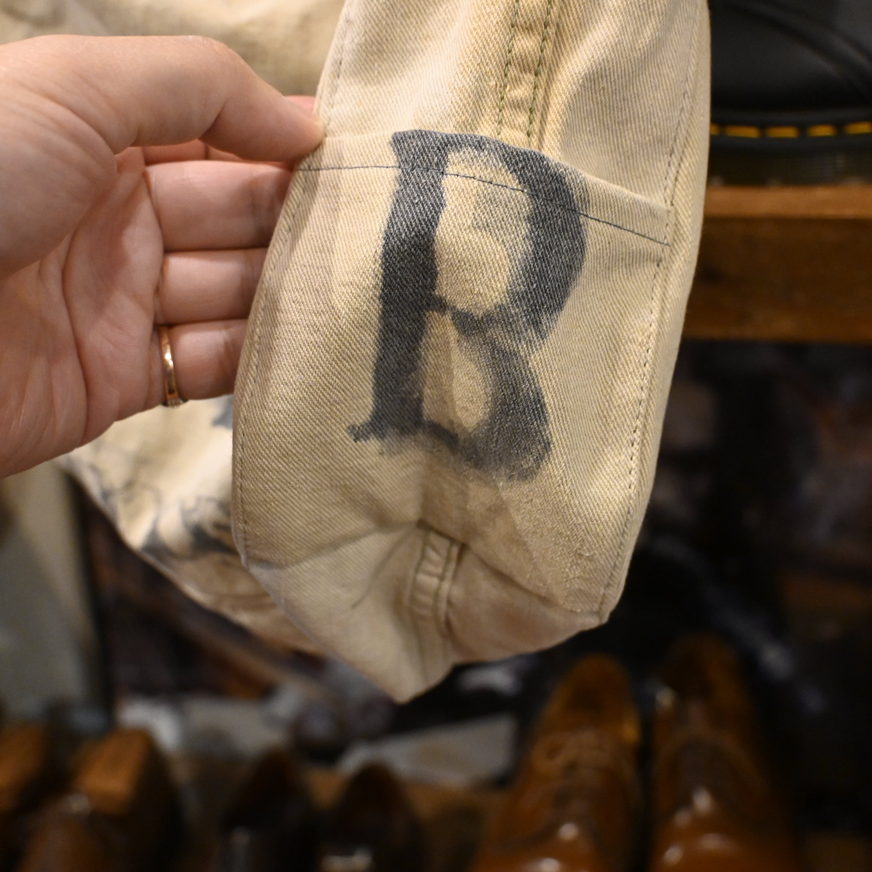 ステンシルのかすれ、汚れ、アタリ、補修跡など、ヴィンテージ素材特有の使用感があります。
