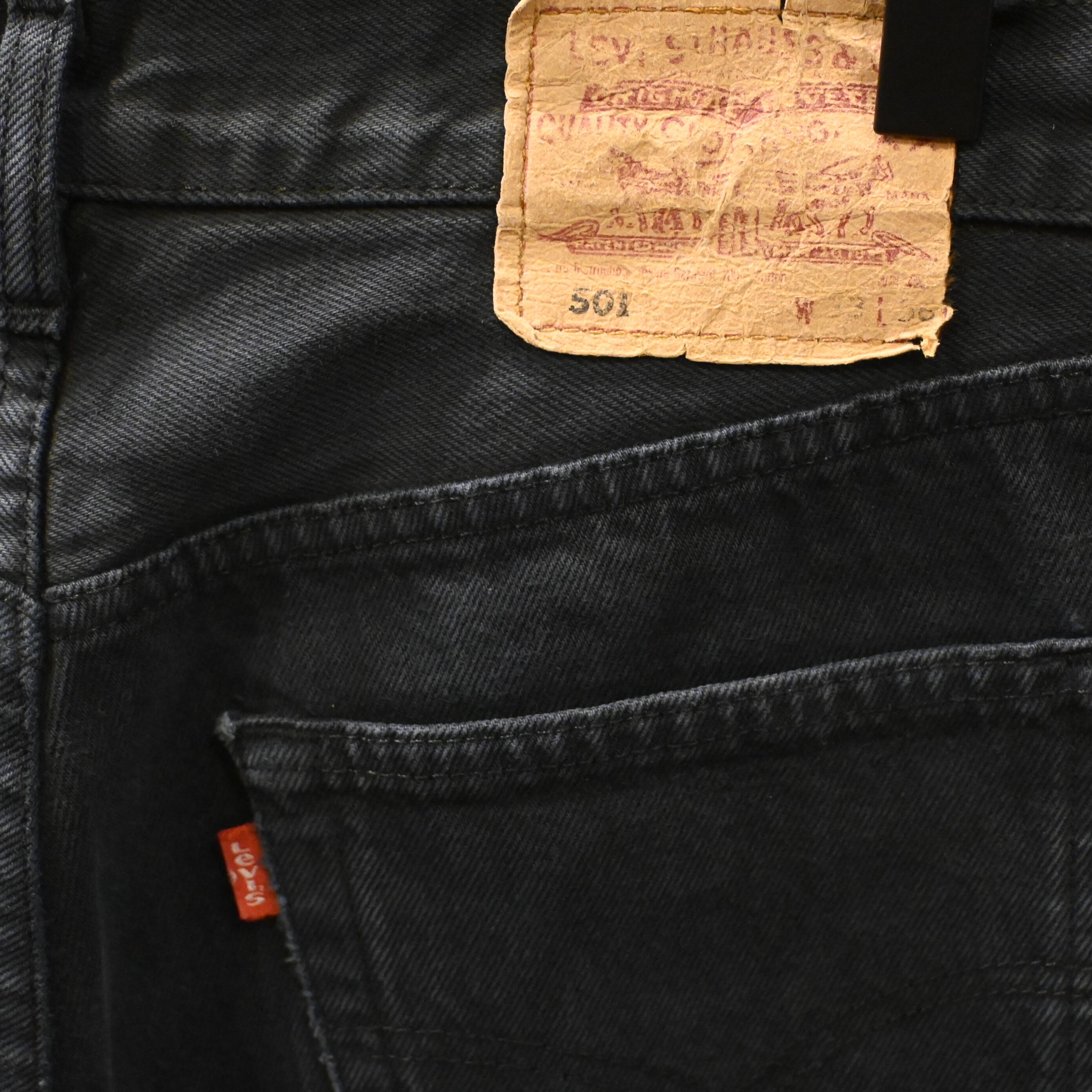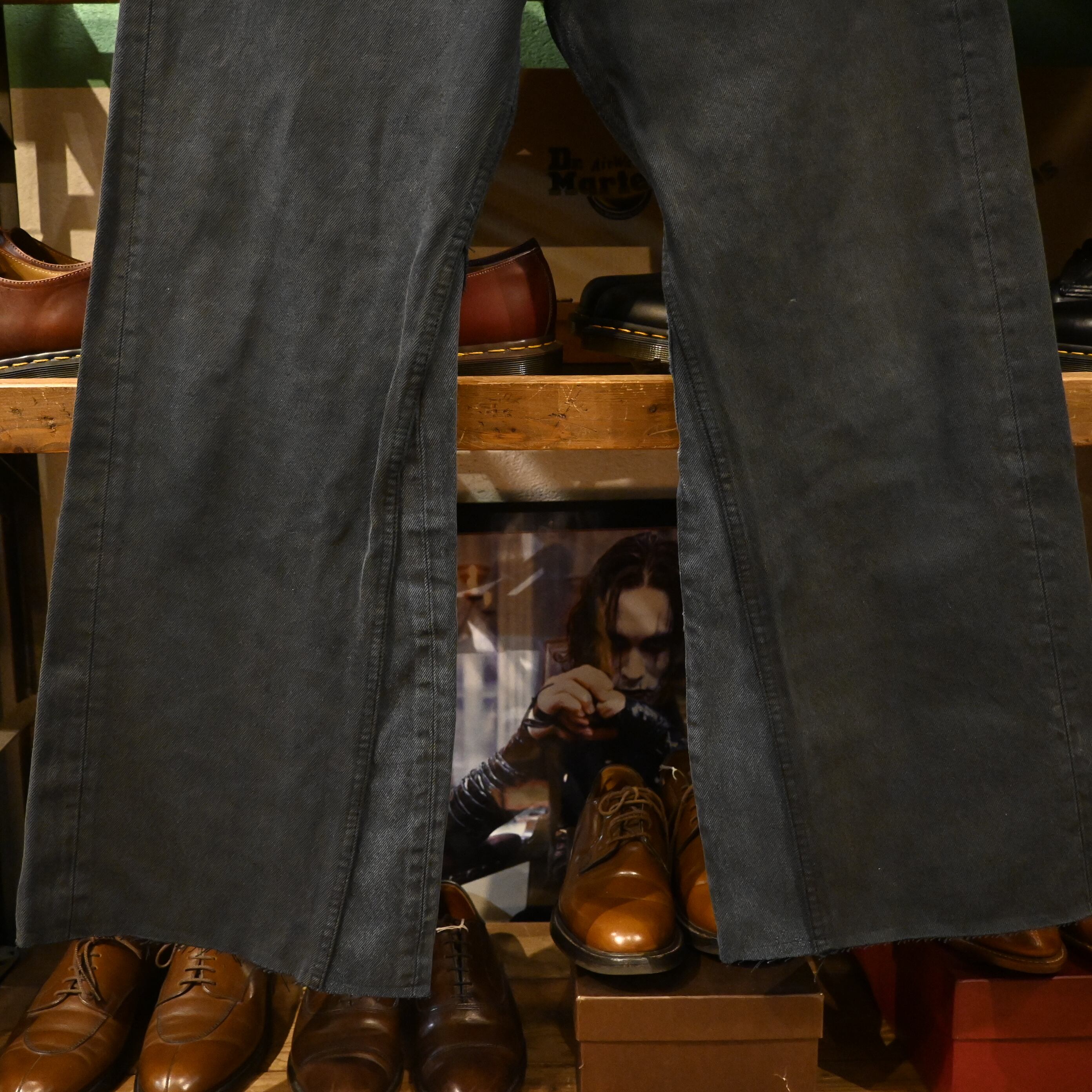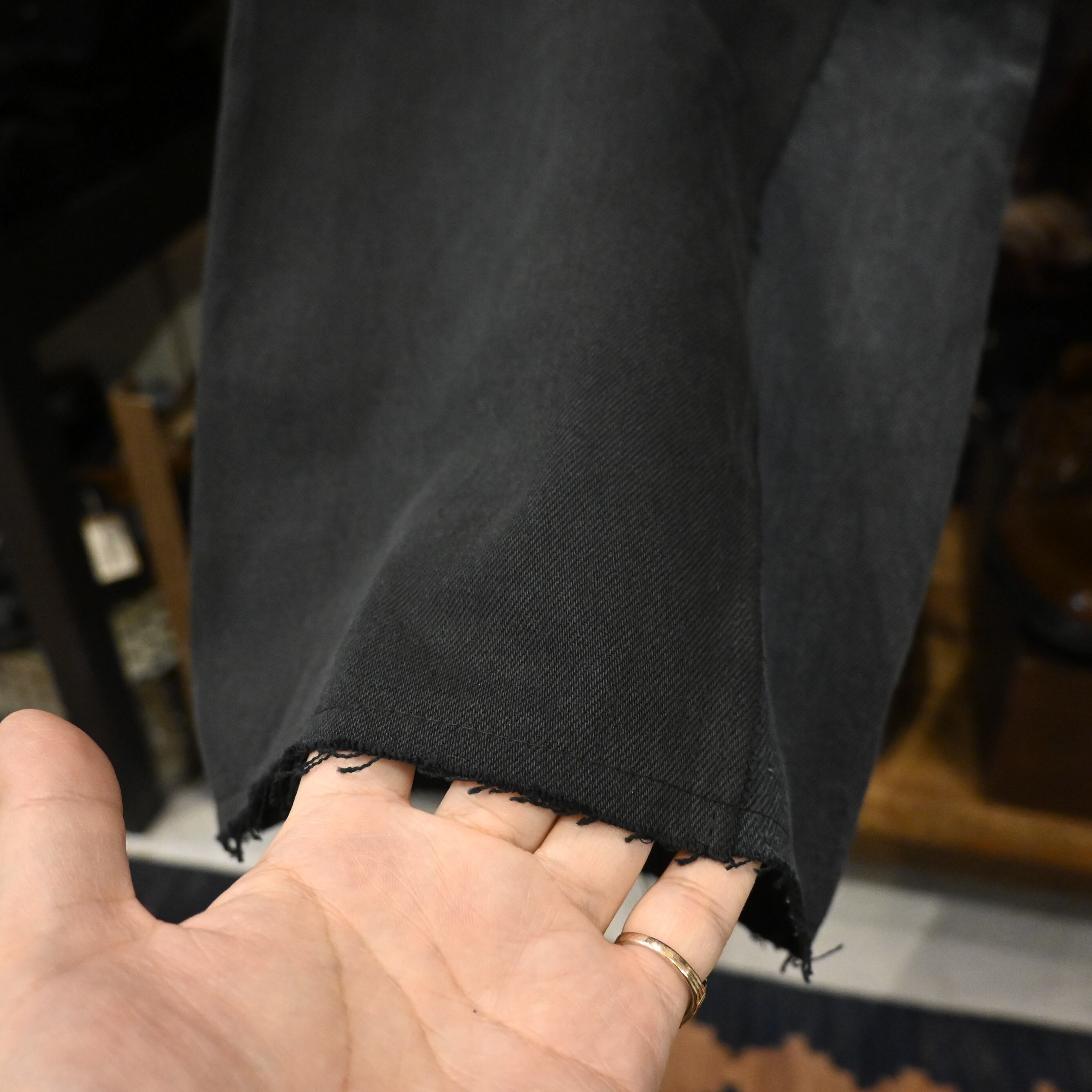 ヴィンテージのブラックデニム特有のフェード、裾カットオフ仕様のほつれ、わずかな擦れなどがありますが、着用に問題のない良好なコンディションです。