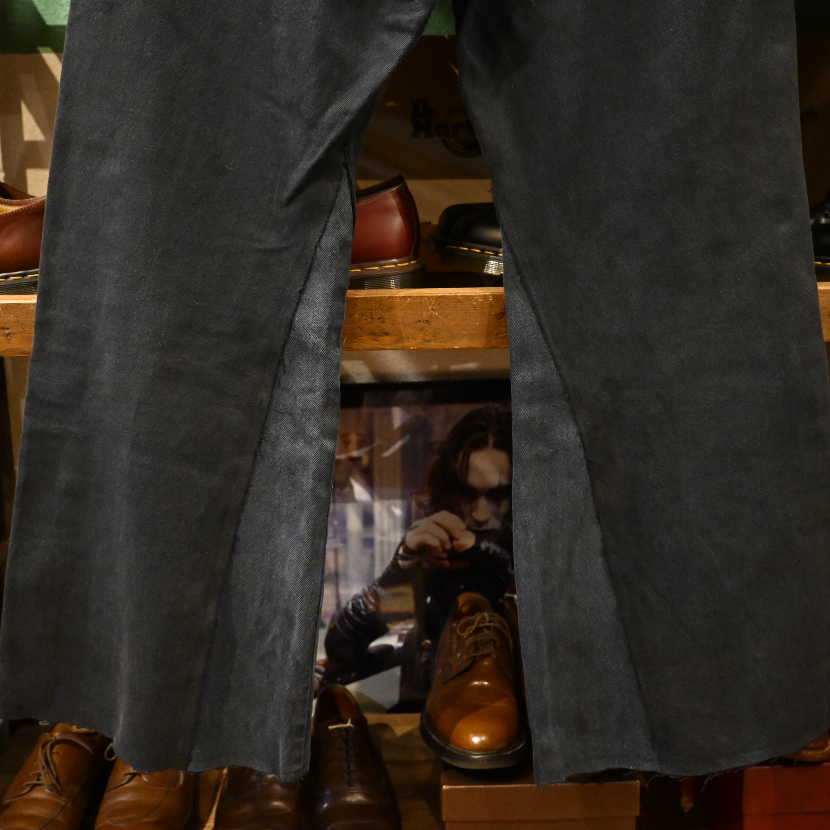 リーバイスのブラックデニムをベースに、RE:Stoked独自のカットオフ仕様でフレアシルエットへ再構築したリメイクアイテムです。