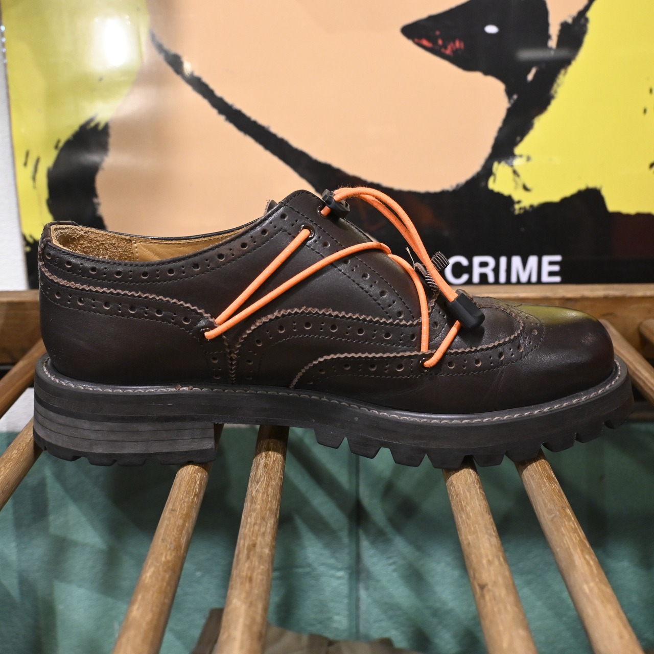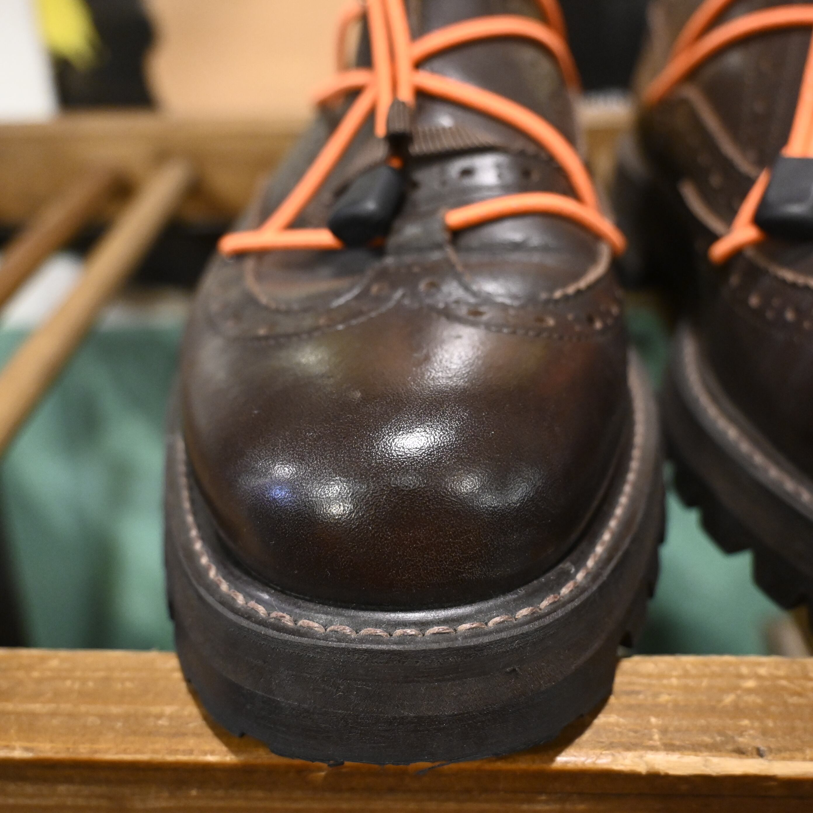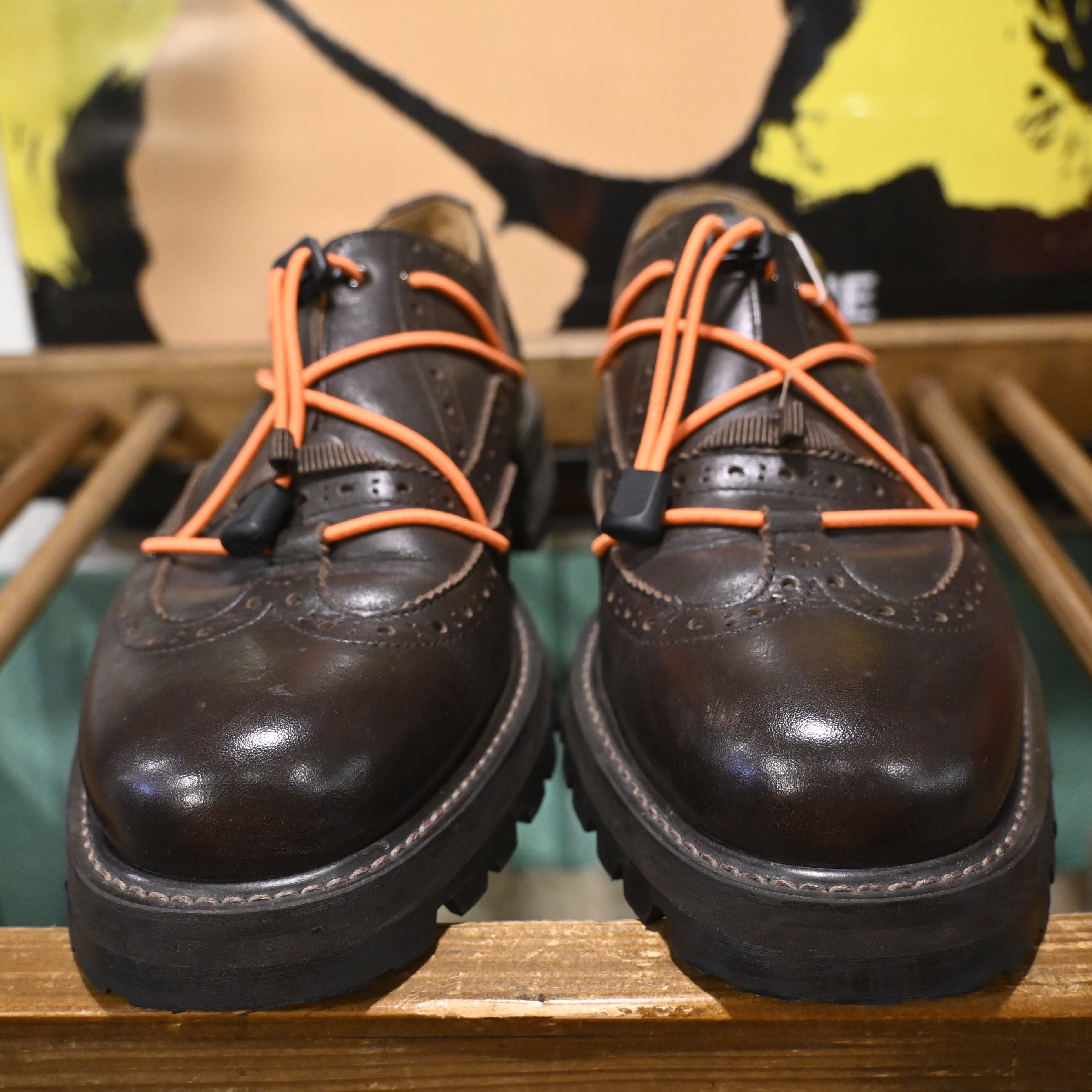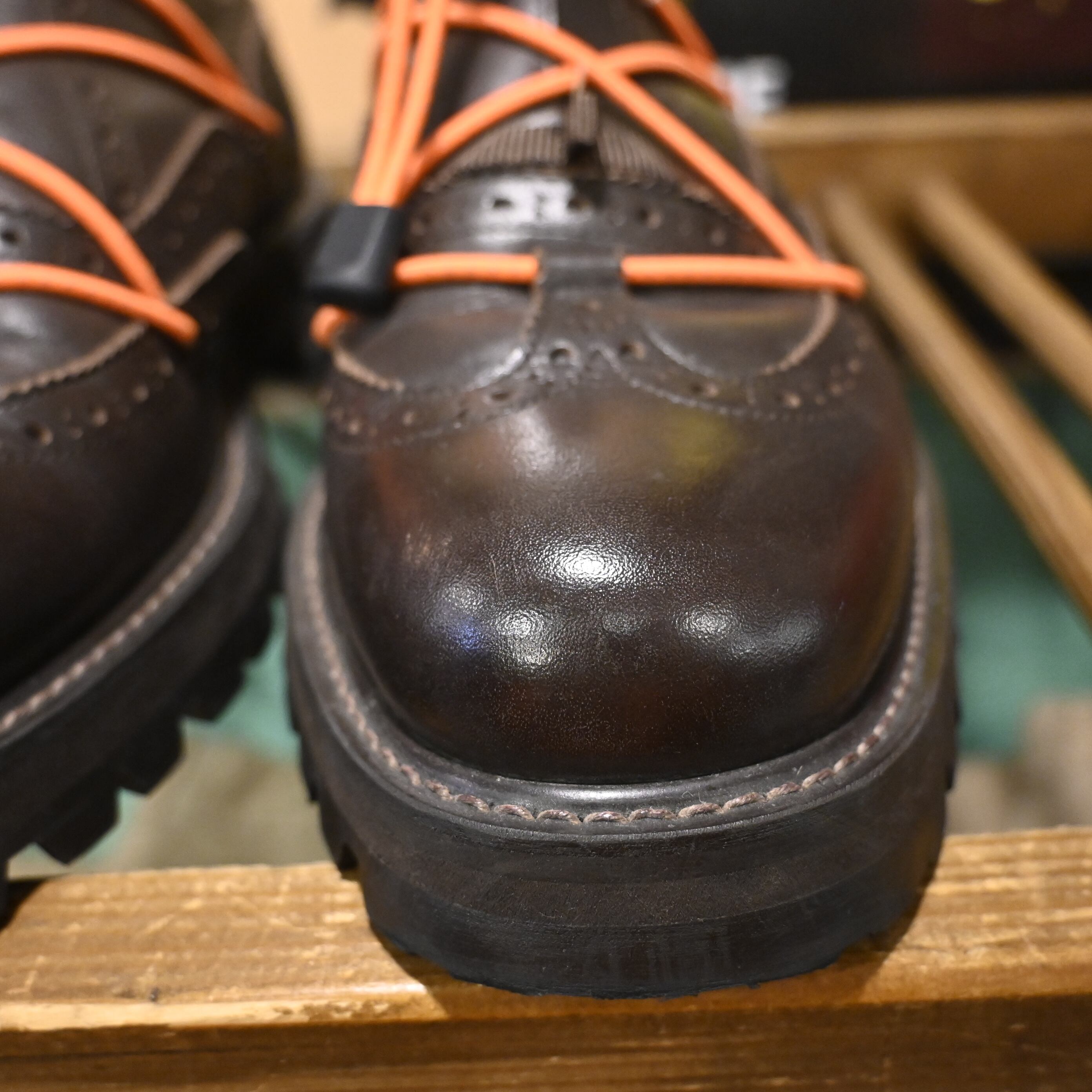 シューレースではなくコードを巻き付けて足をホールドする独自の構造が特徴で、ブラウンレザーに映えるオレンジコードは純正仕様となります。