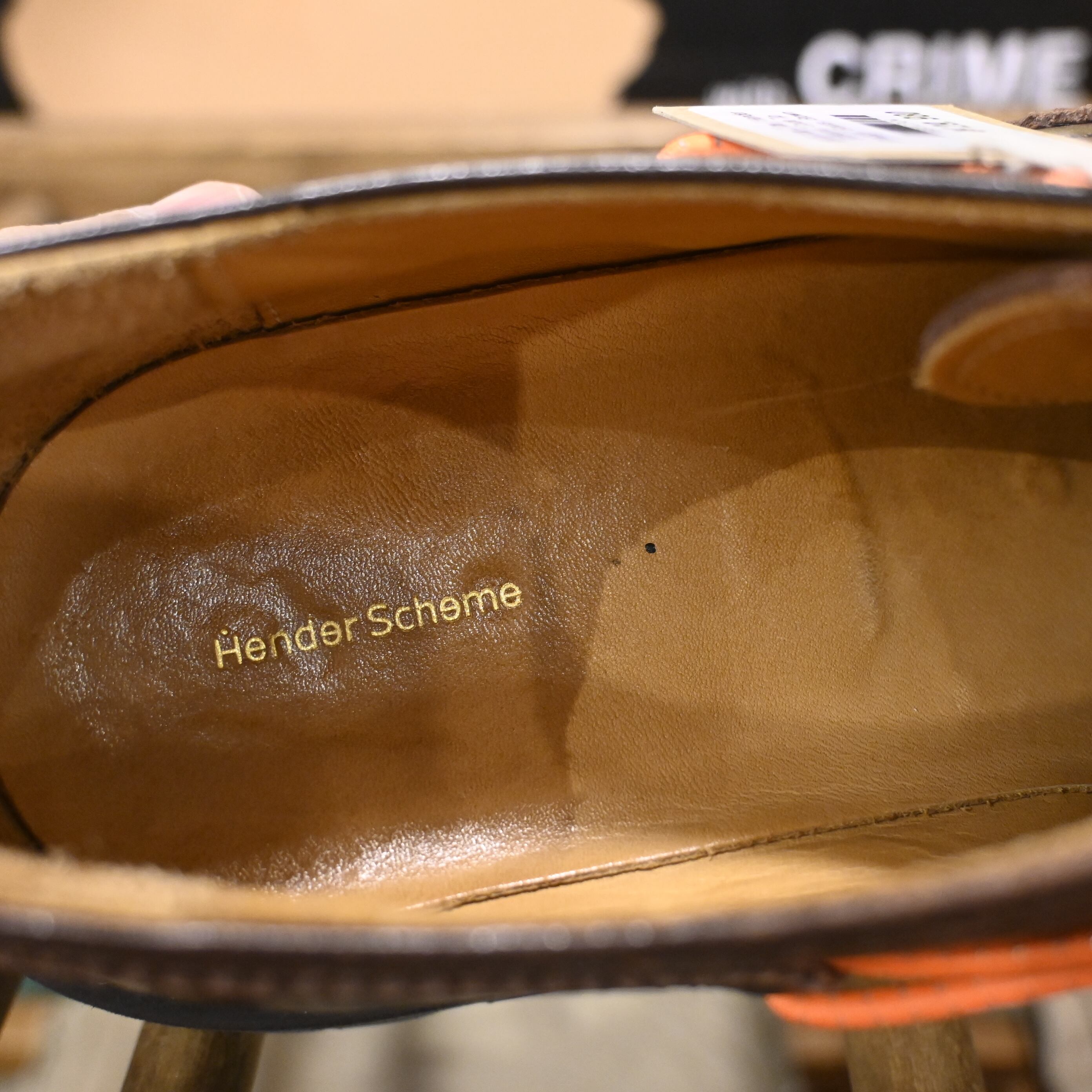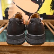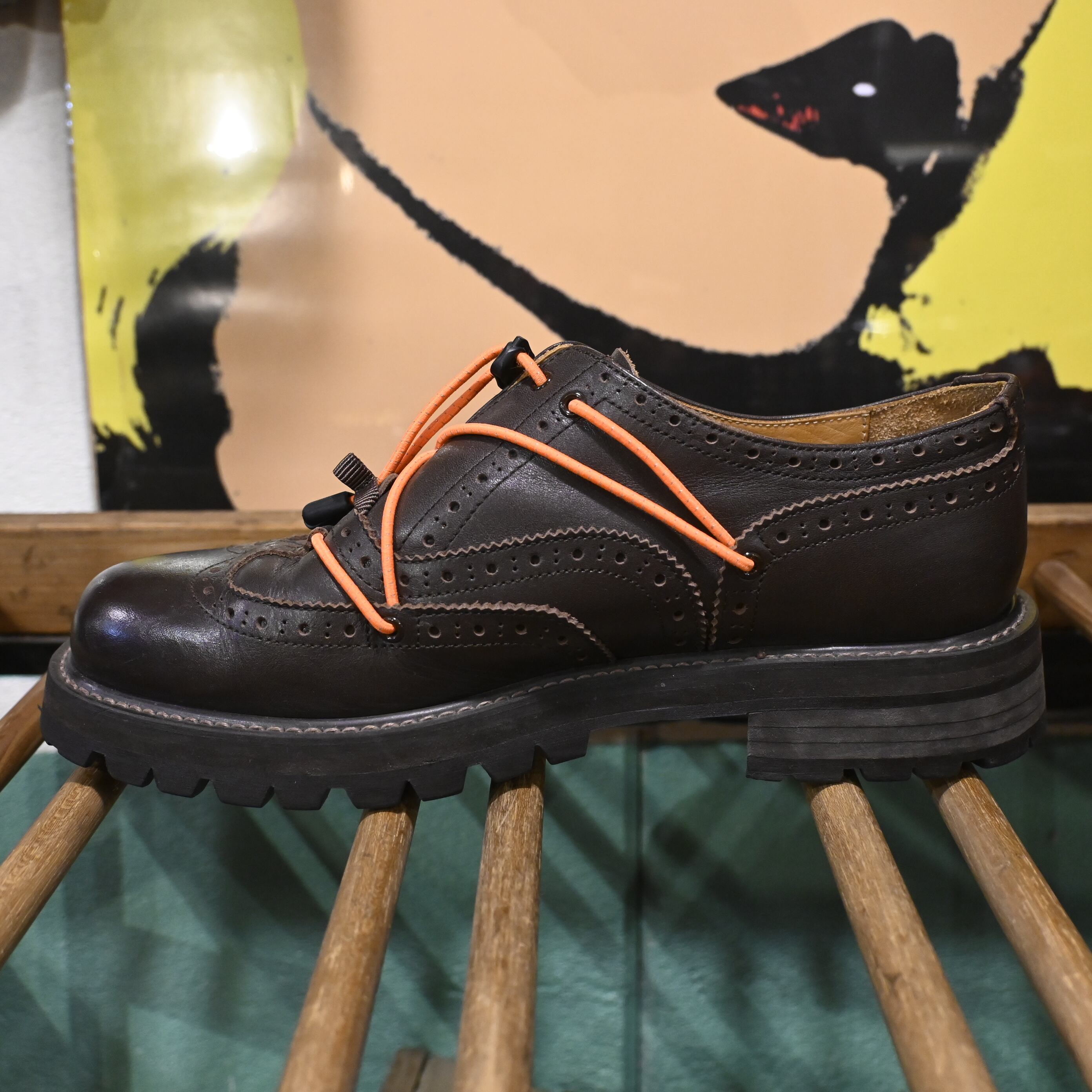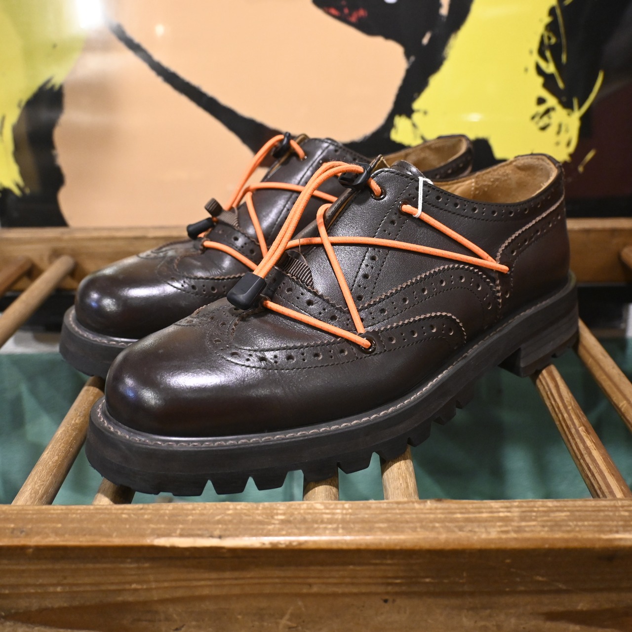 シューレースではなくコードを巻き付けて足をホールドする独自の構造が特徴で、ブラウンレザーに映えるオレンジコードは純正仕様となります。