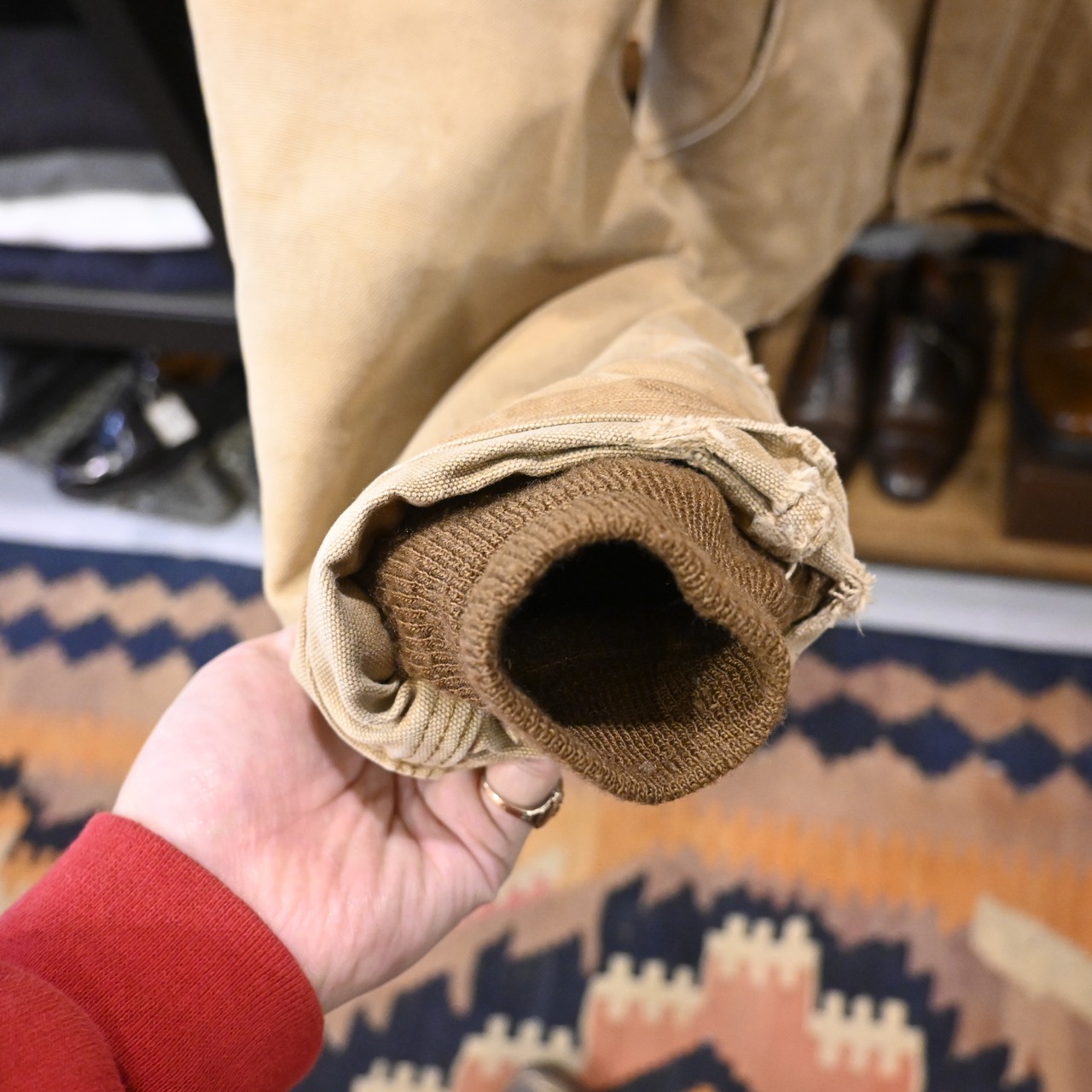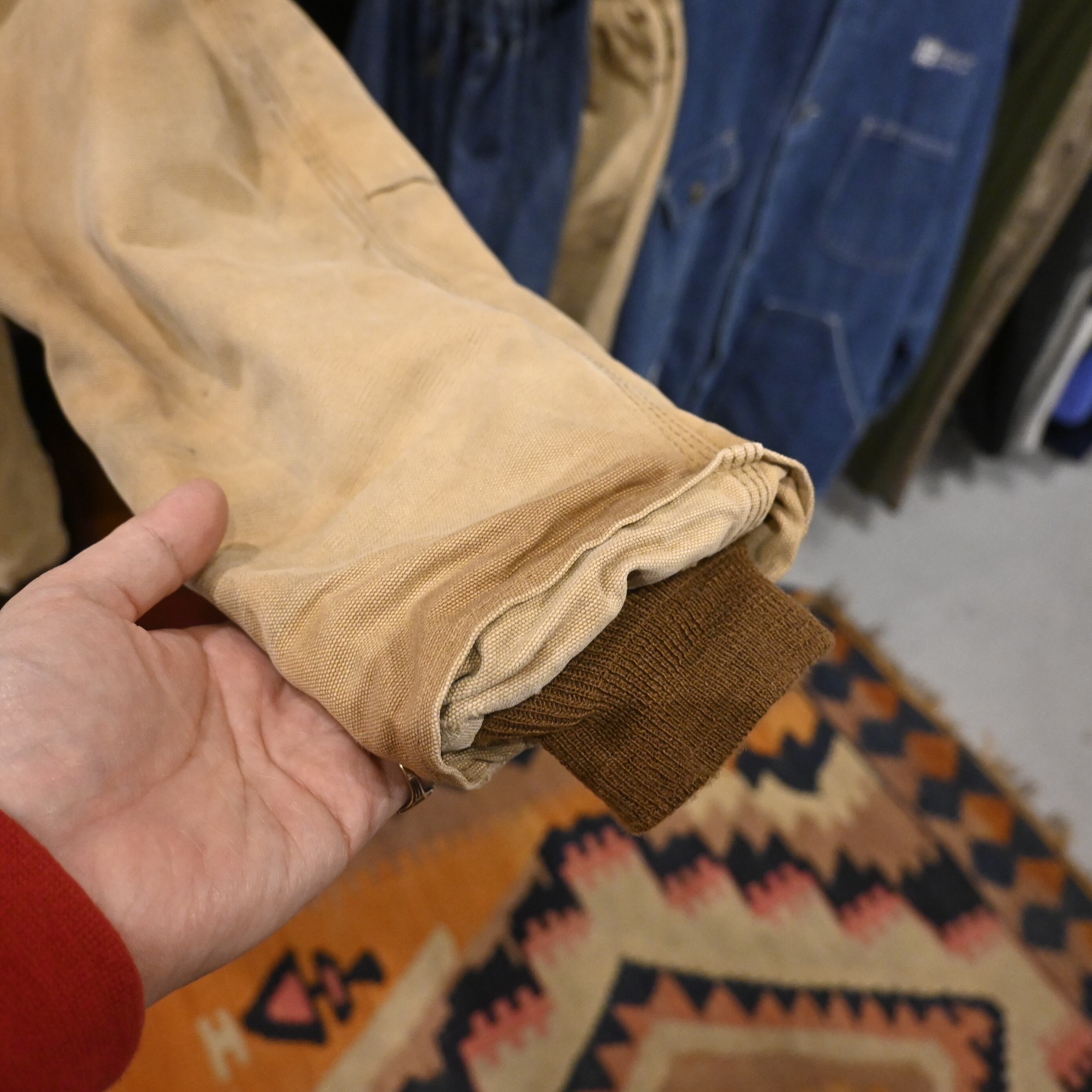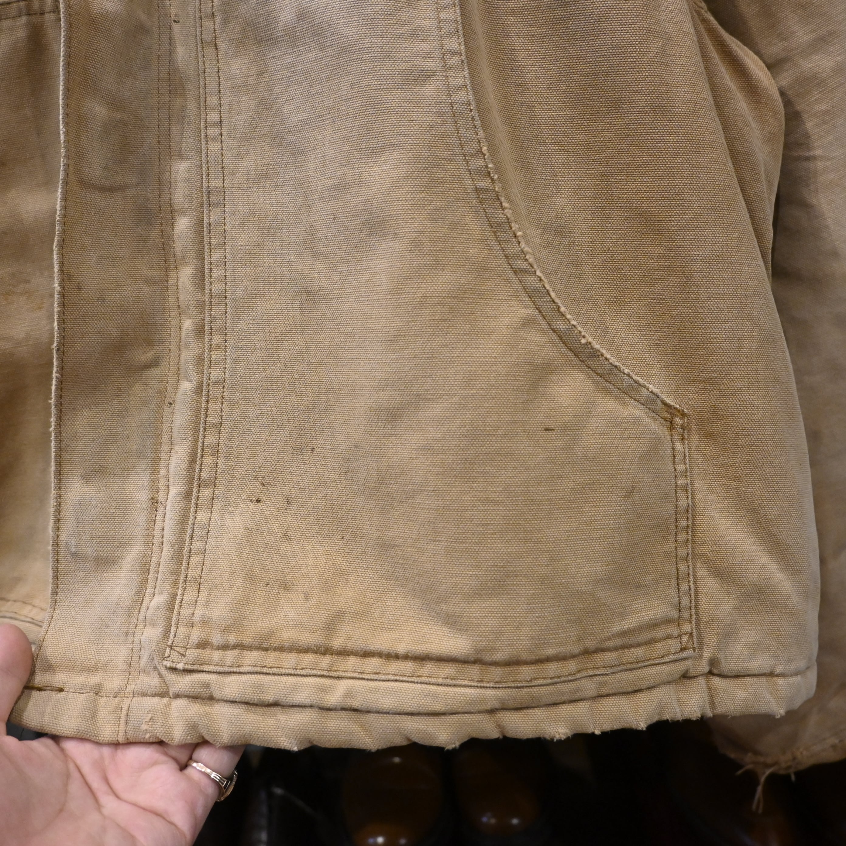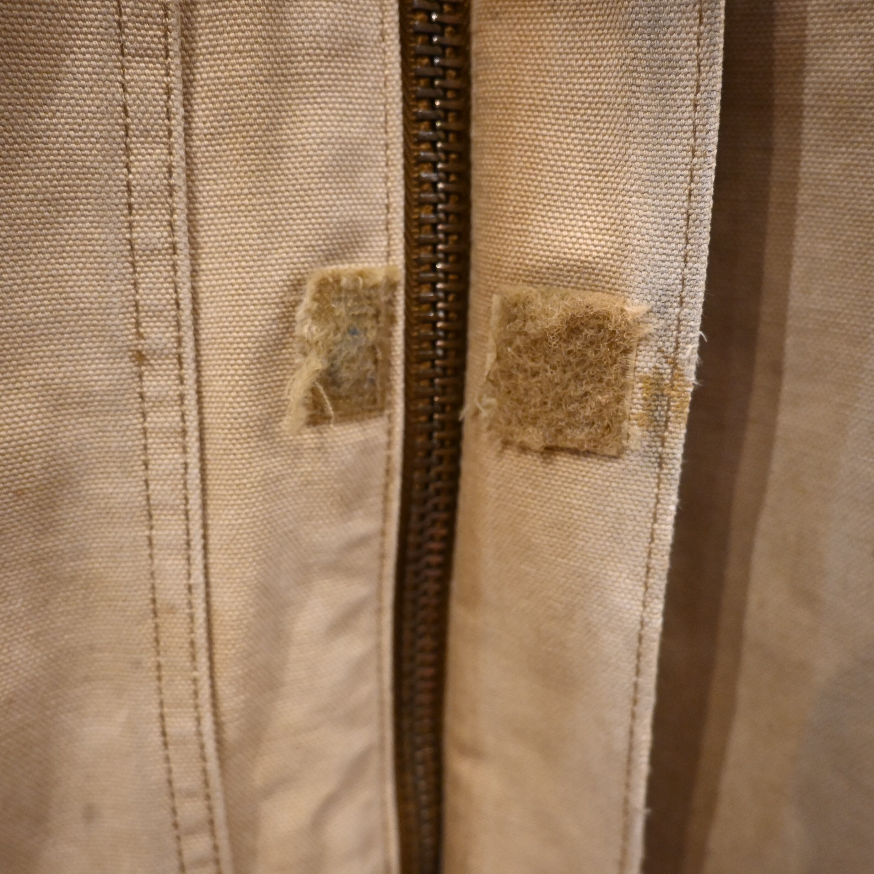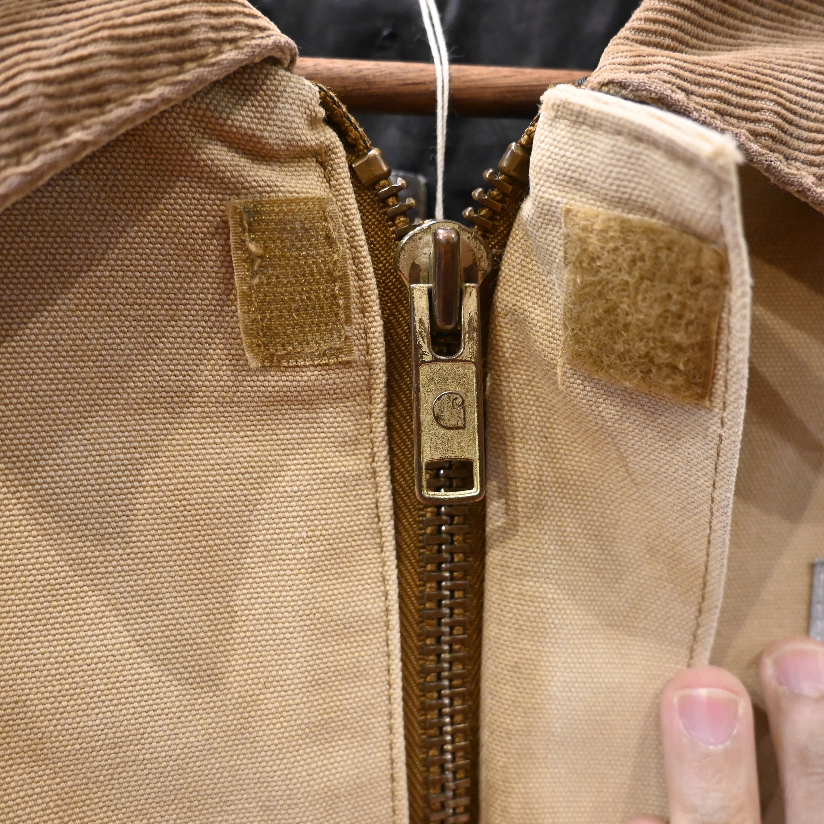 ジッパーにはCarharttロゴ入りの真鍮パーツを使用。身幅はしっかり広めで、中にスウェットやパーカーを合わせても窮屈にならないバランスです。