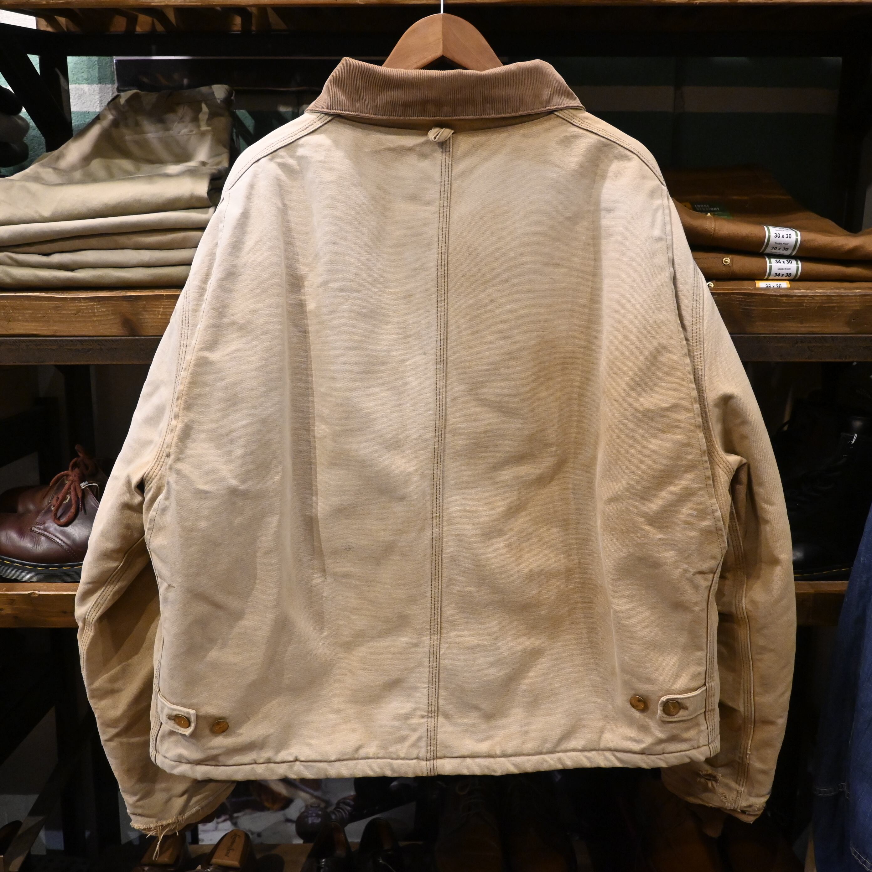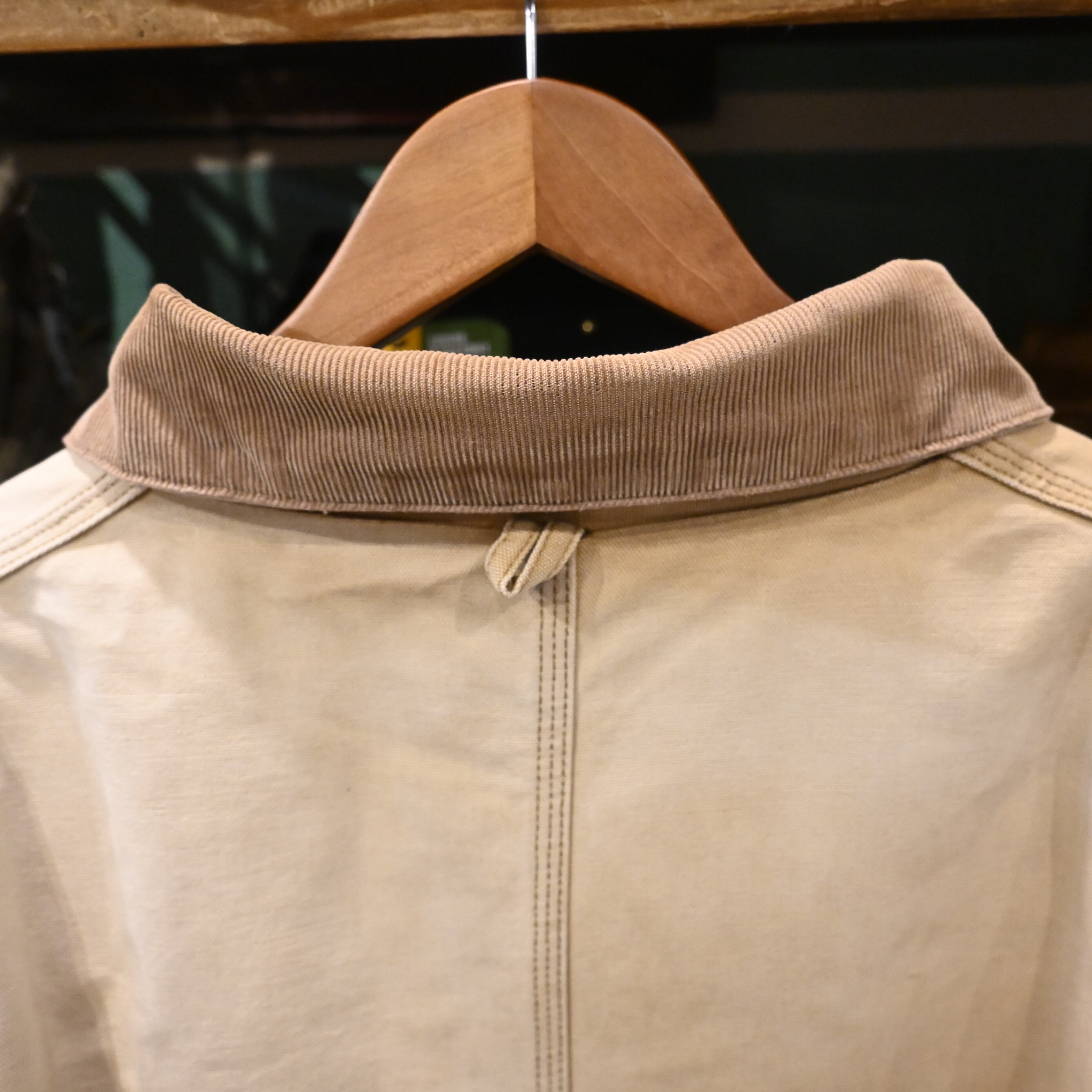 しっかりとした12ozダック生地にコーデュロイ襟、裏地はキルティング仕様。ワークウェアらしい堅牢さと、使い込まれた雰囲気の良さが共存する一枚です。