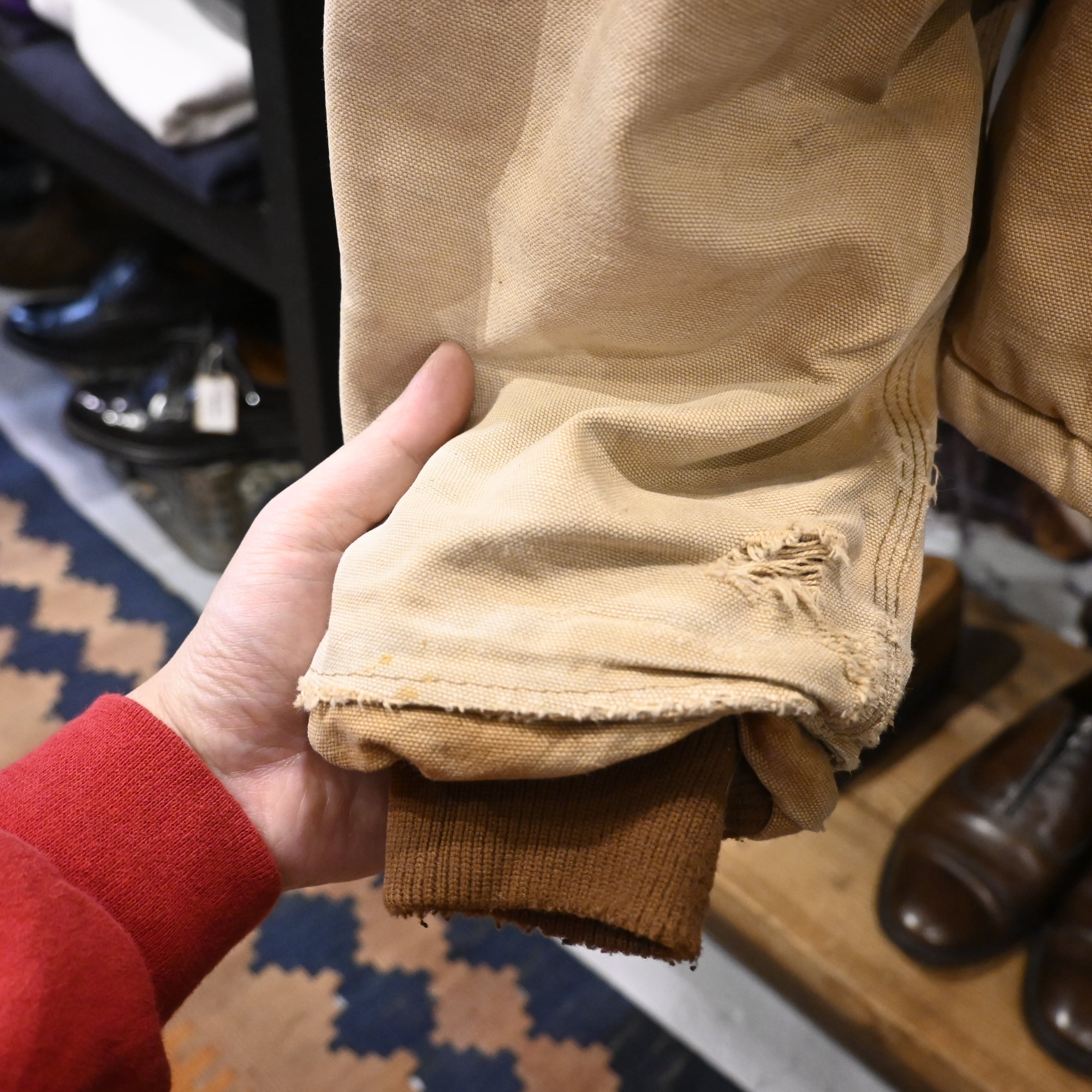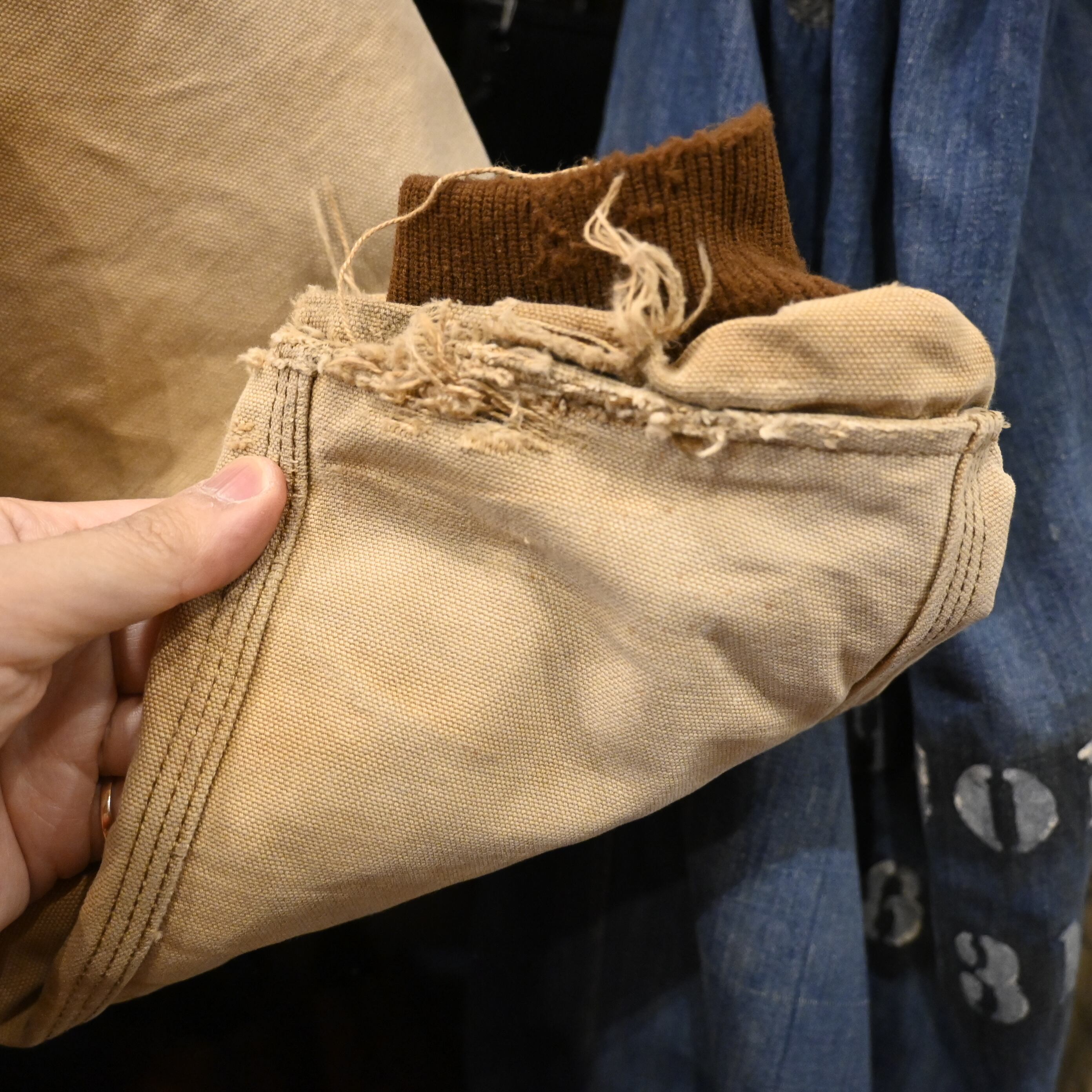 全体にスレ・汚れ・フェード、袖口のダメージ、裾のほつれなど、リアルな使用感の強いアイテム。ヴィンテージワーク特有の“育った表情”を楽しみたい方におすすめです。