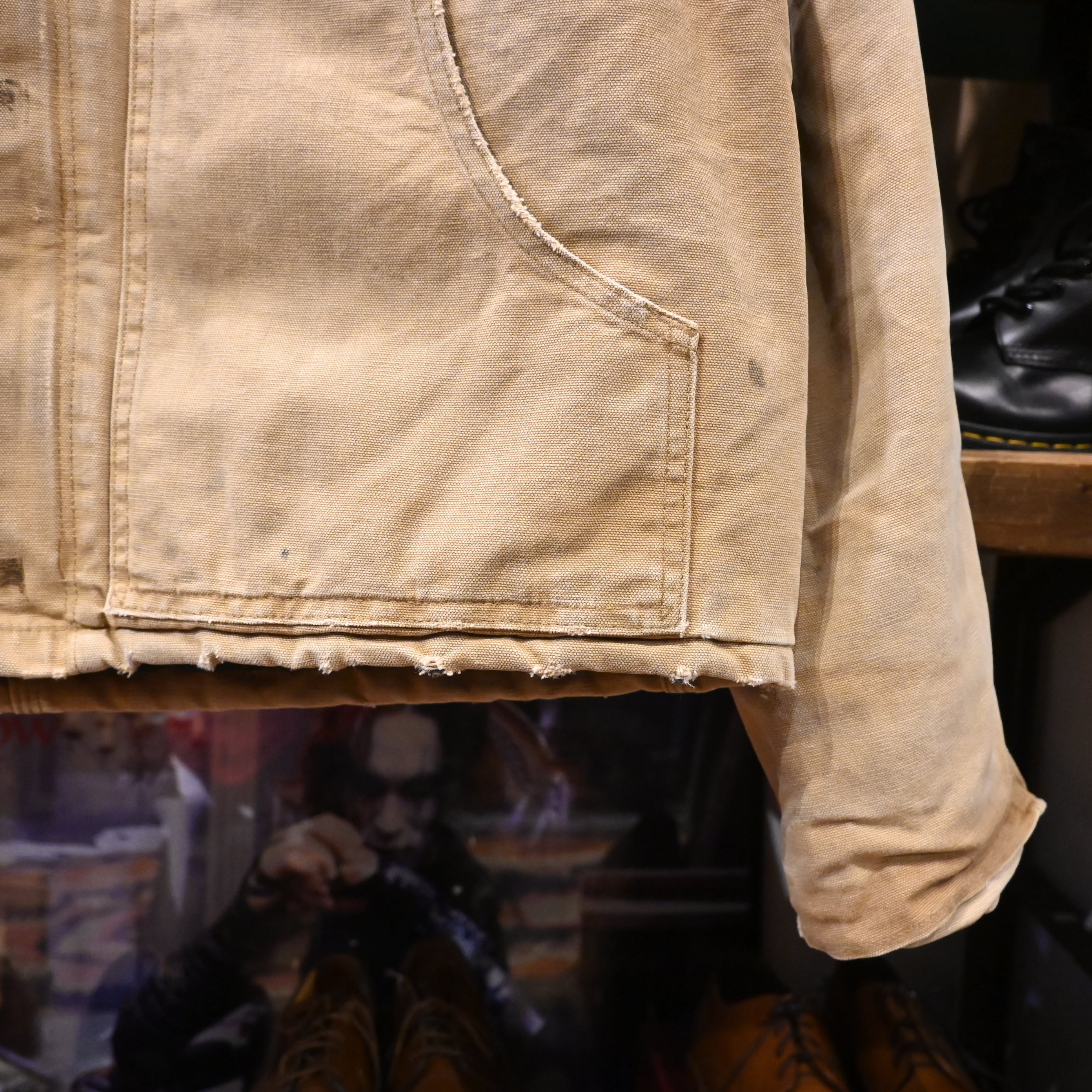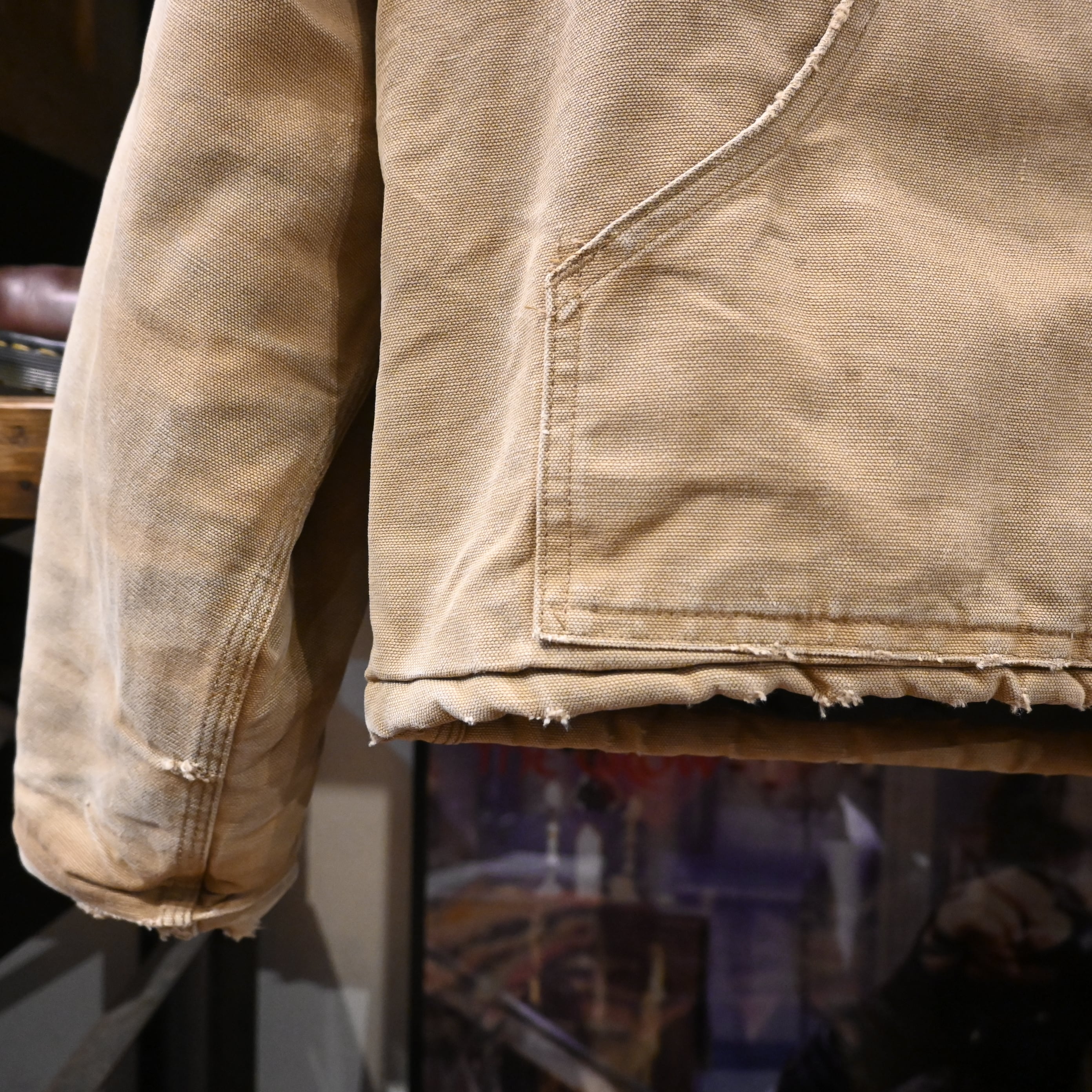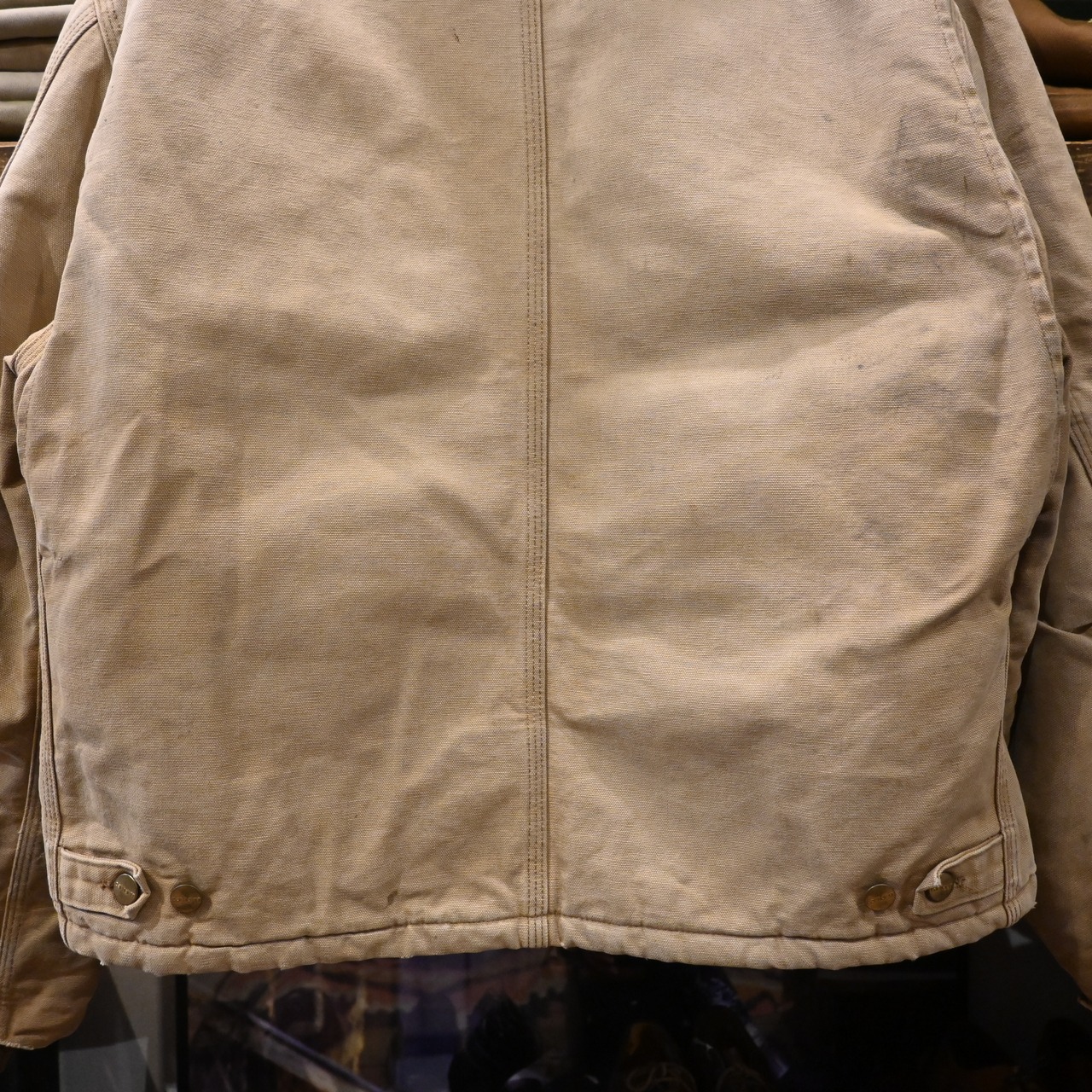 全体的に汚れ・擦れ・使用感強め。袖口や裾にダメージあり。裏地に使用感あり。リアルワークらしい雰囲気を求める方向けのコンディションです。