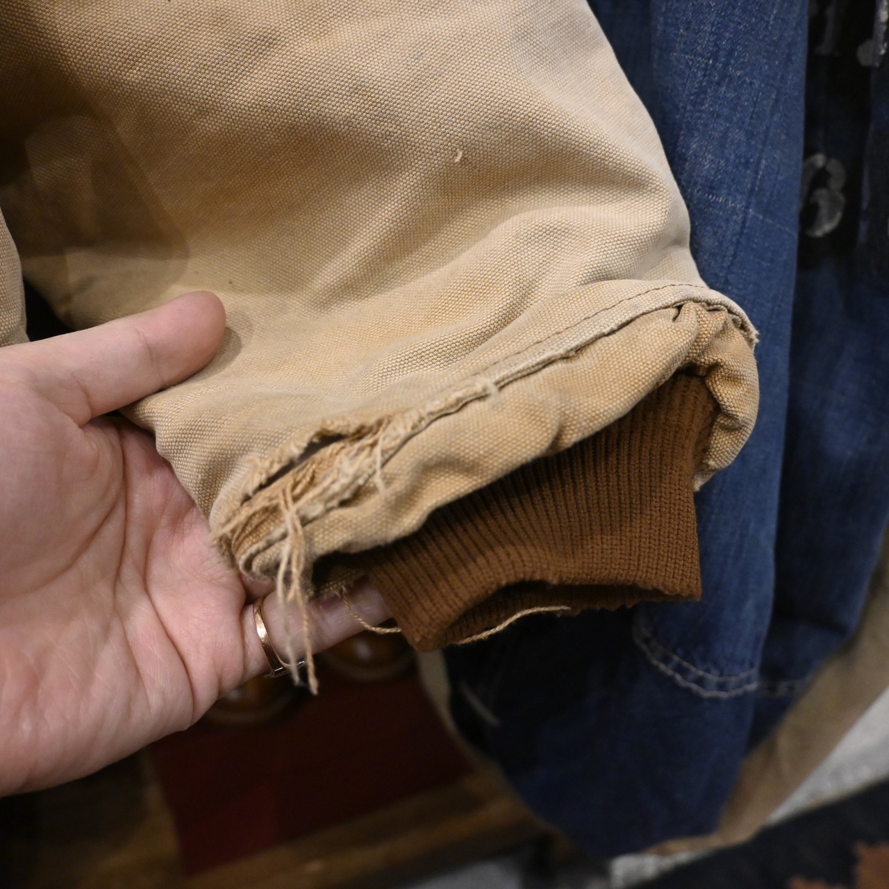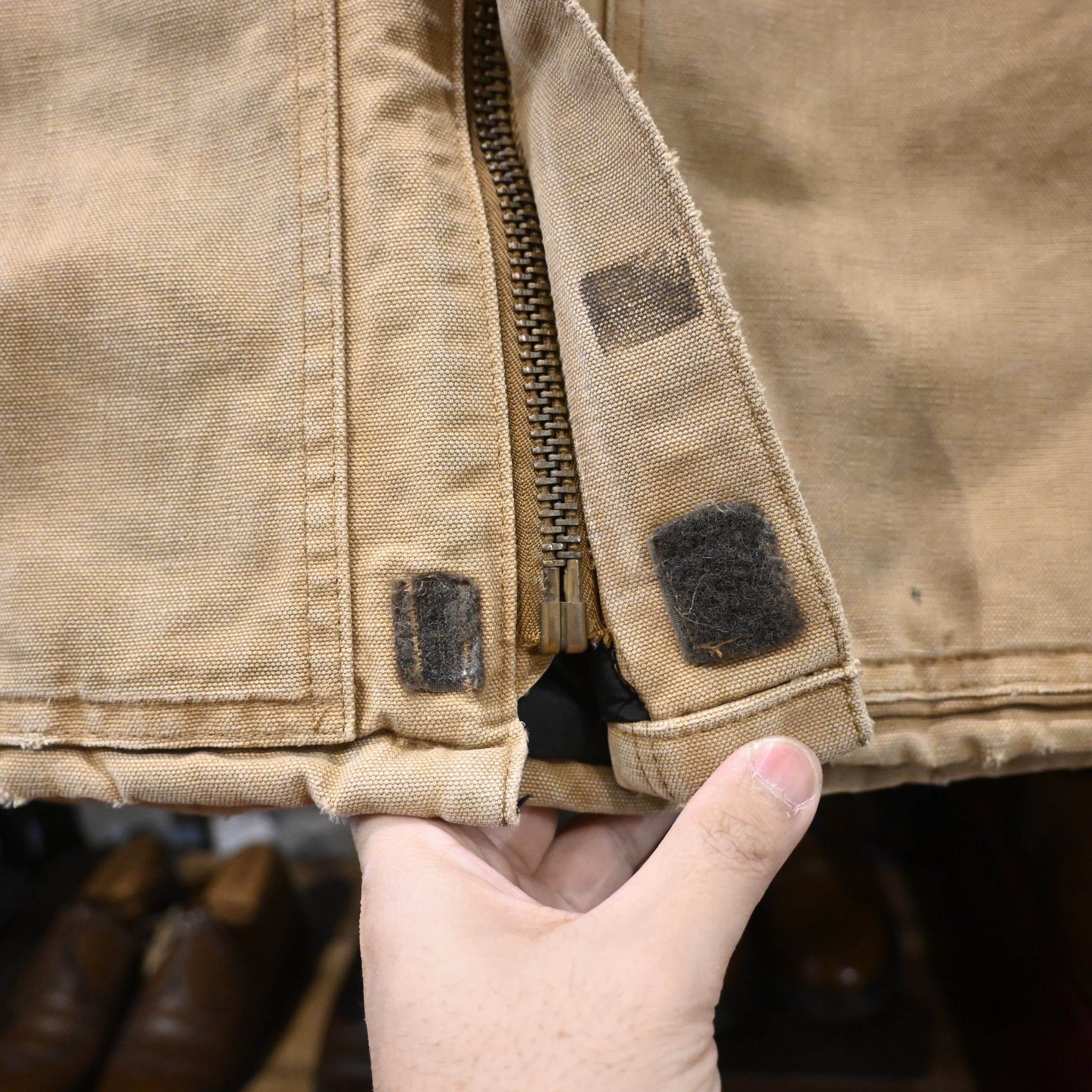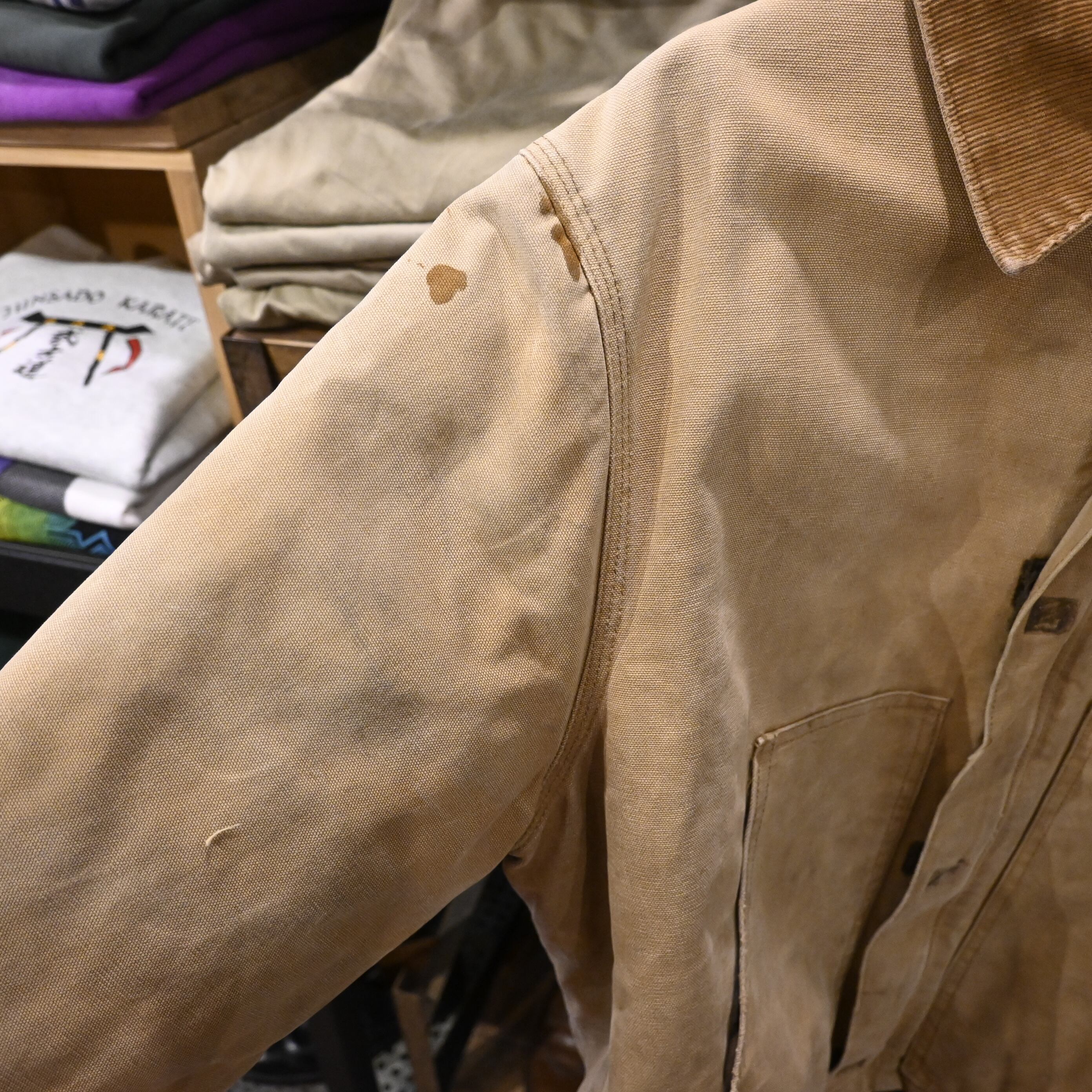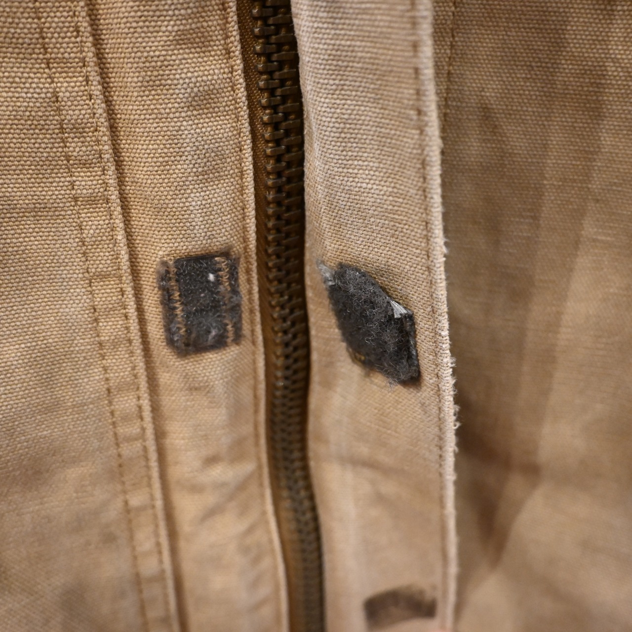 全体的に汚れ・擦れ・使用感強め。袖口や裾にダメージあり。裏地に使用感あり。リアルワークらしい雰囲気を求める方向けのコンディションです。