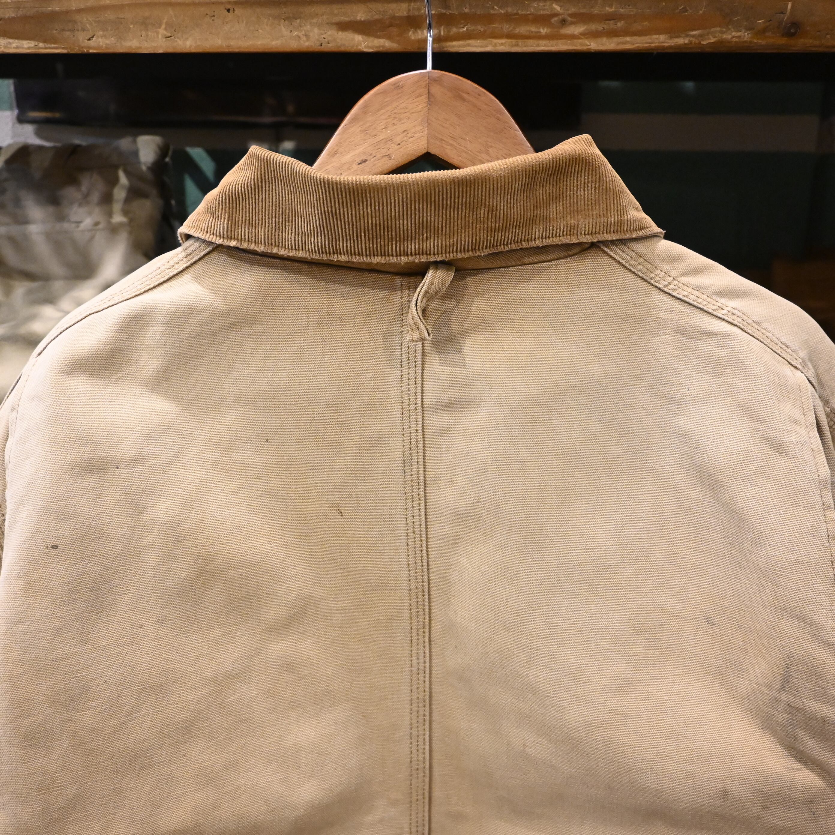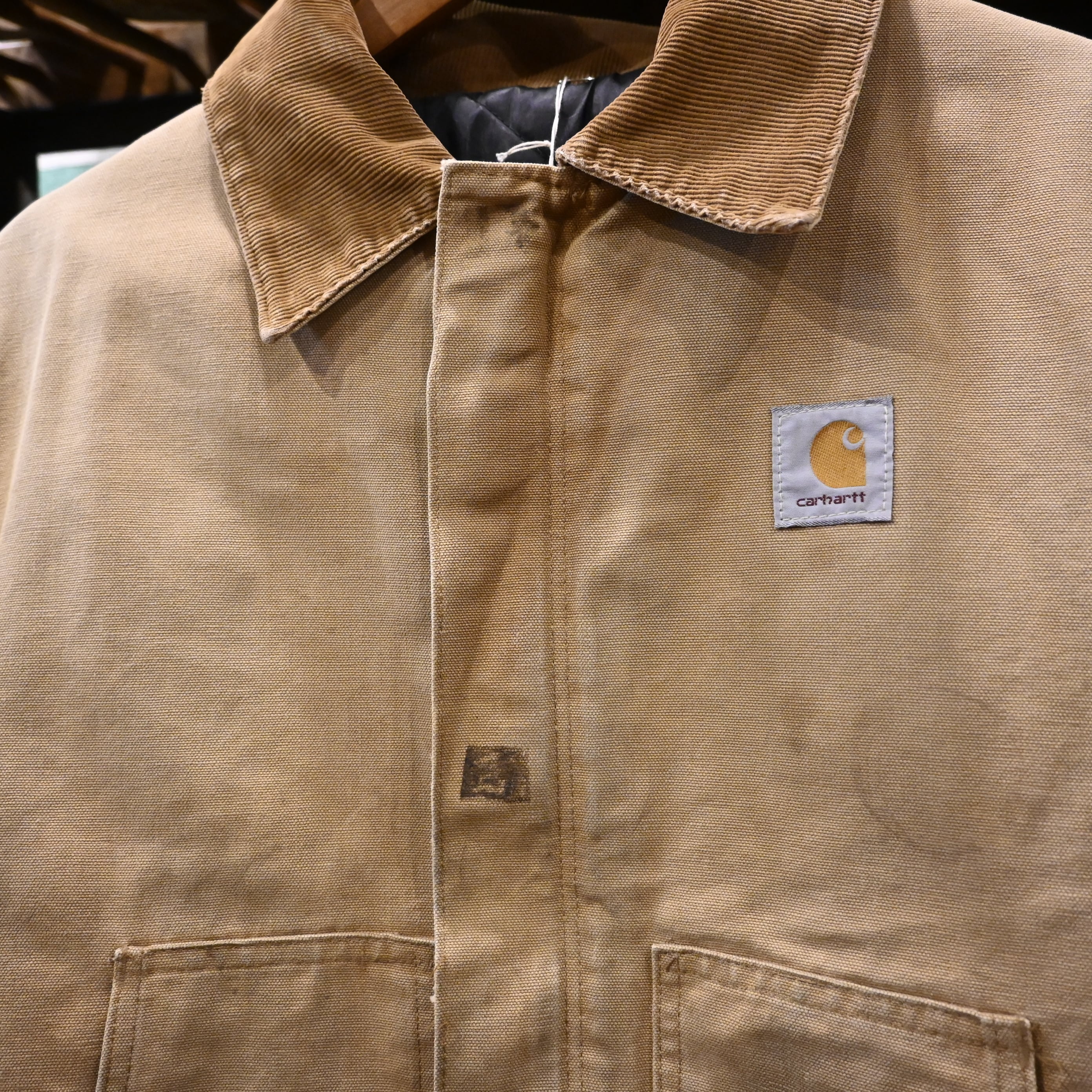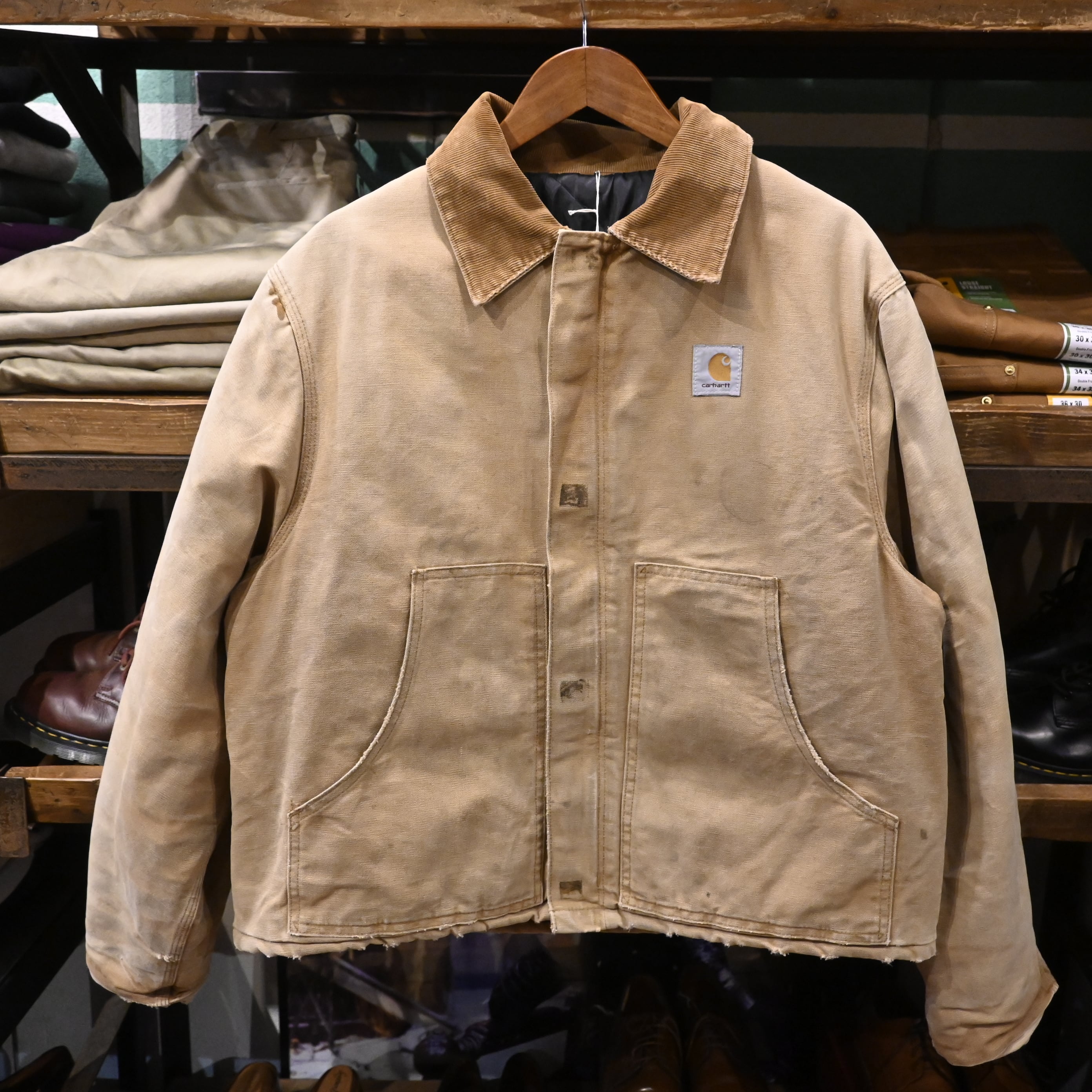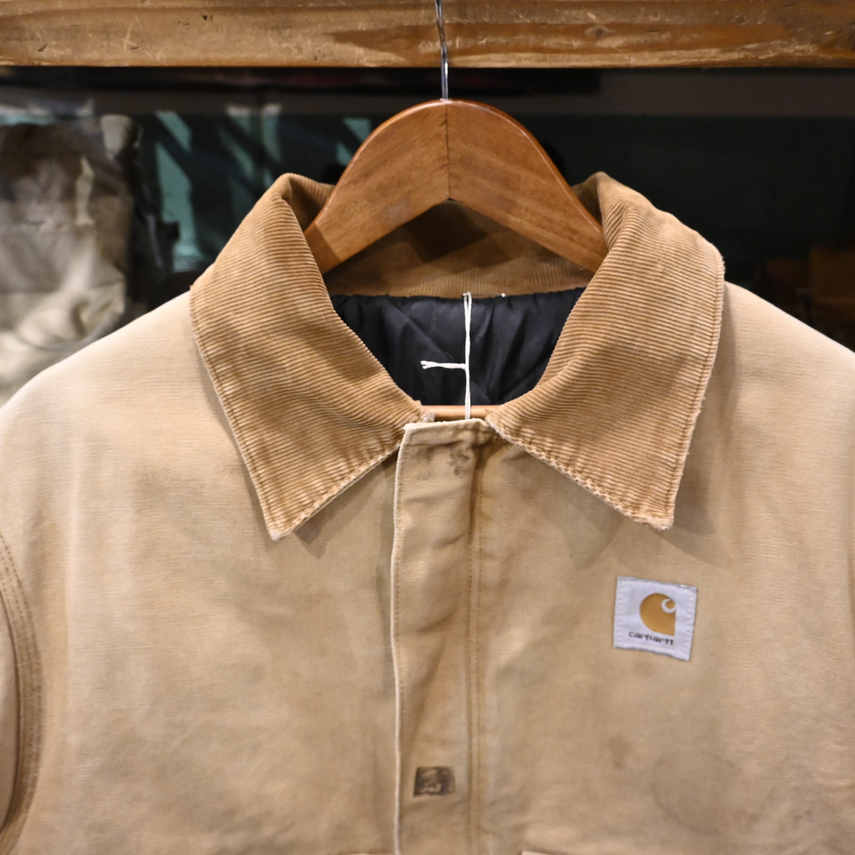 Carharttの代表的なワークジャケット。タフなコットンダック地、コーデュロイ襟、保温性の高いキルティングライナーという王道構成で、アメリカ古着らしい無骨な雰囲気をしっかり纏った一着です。