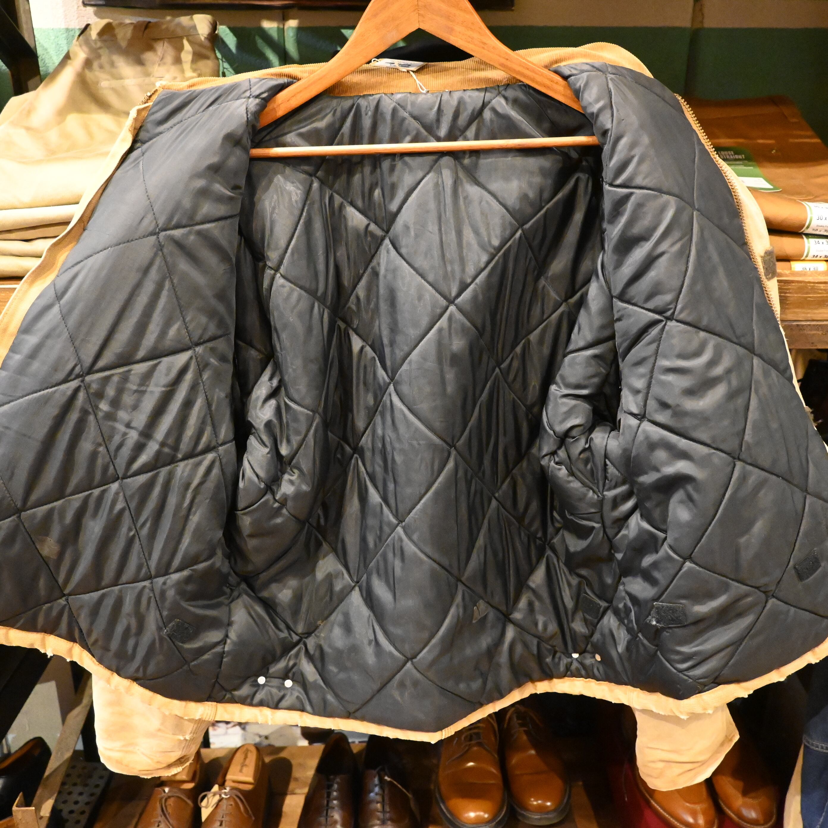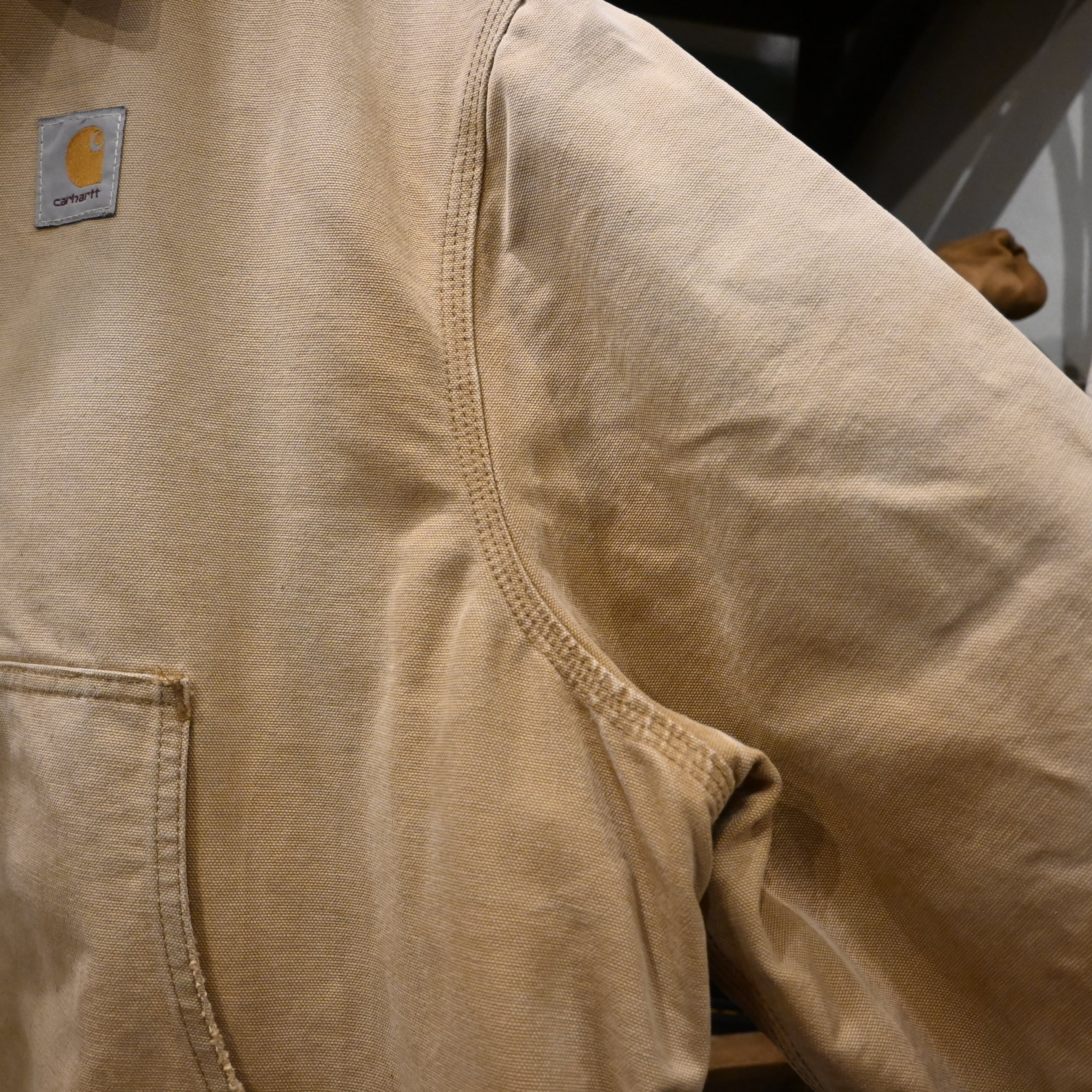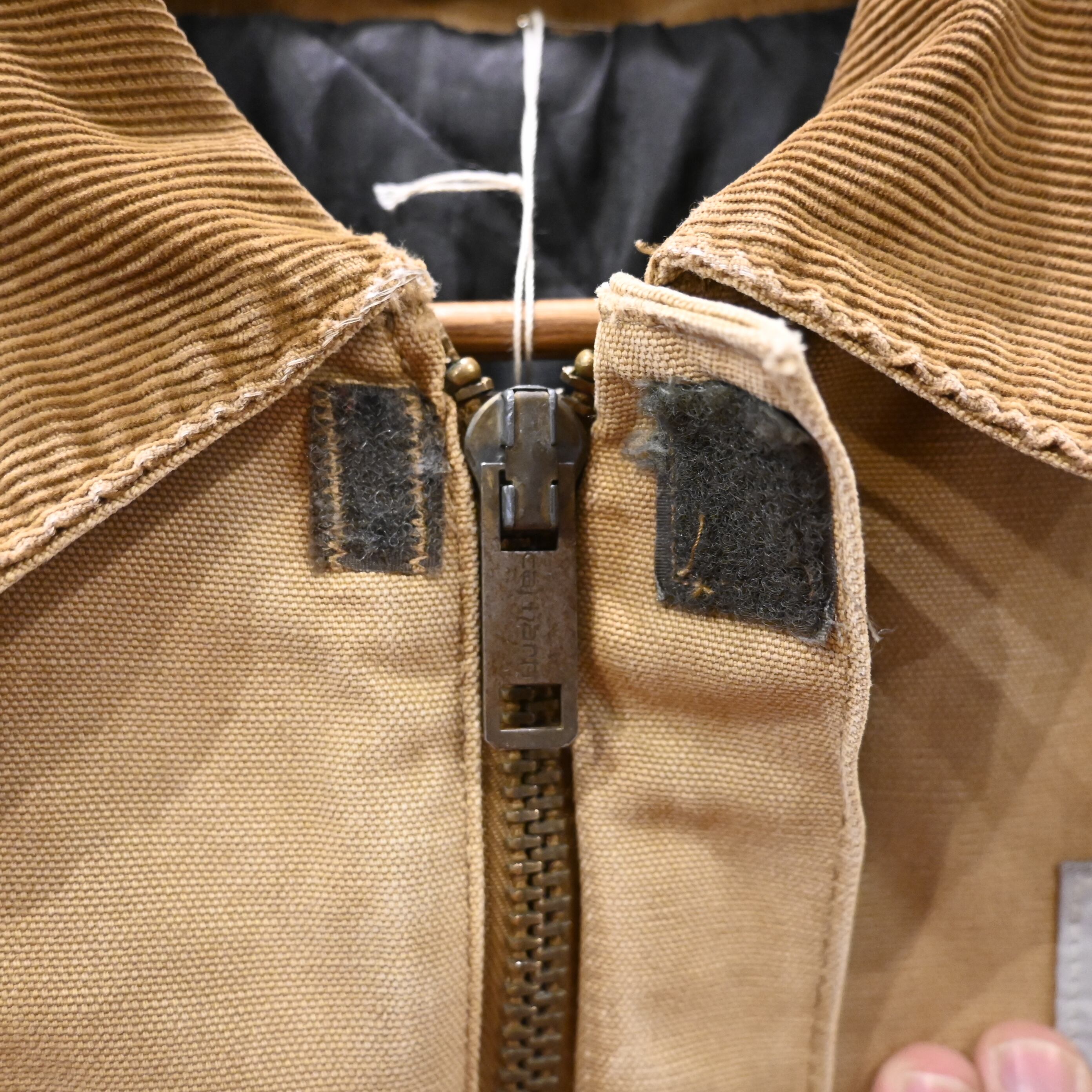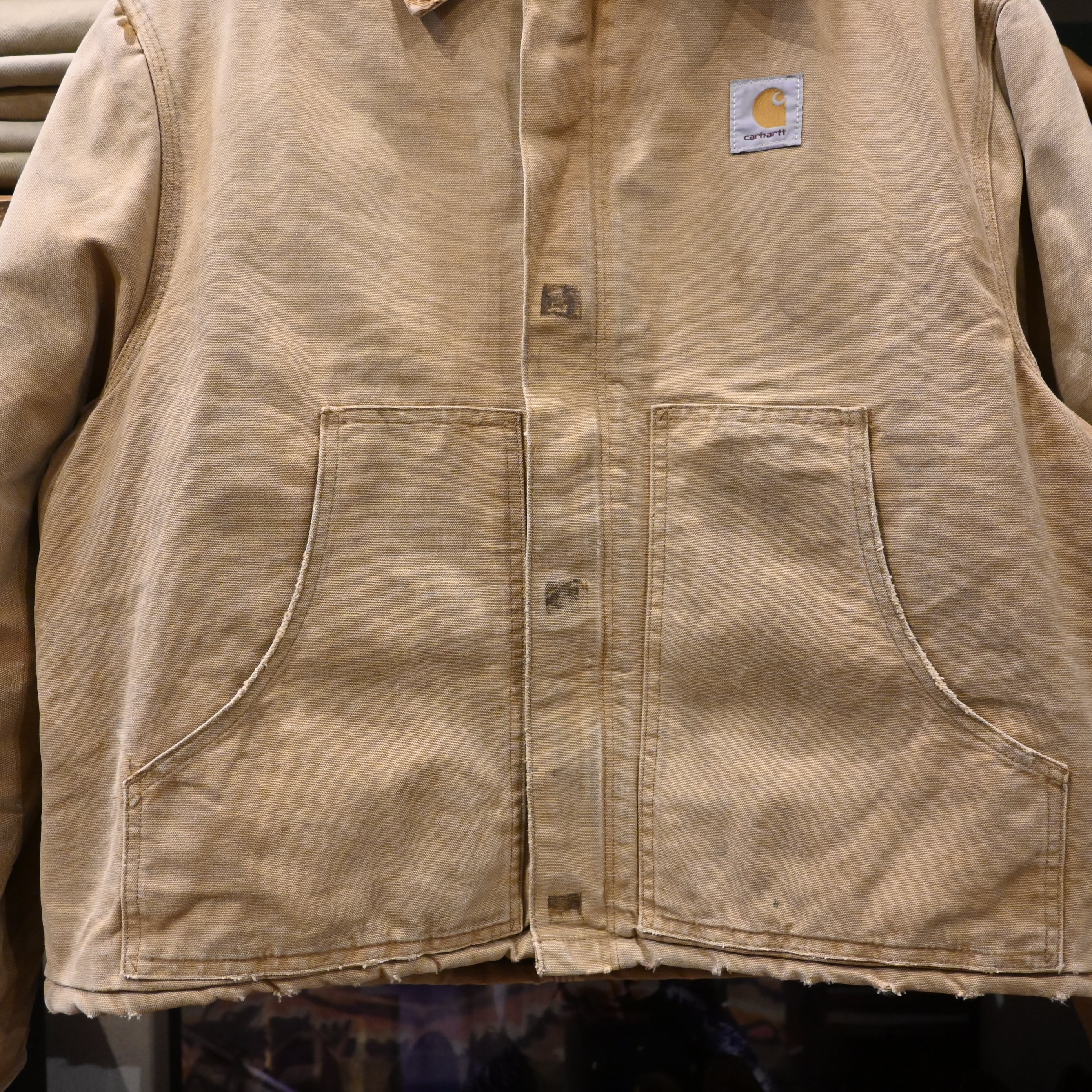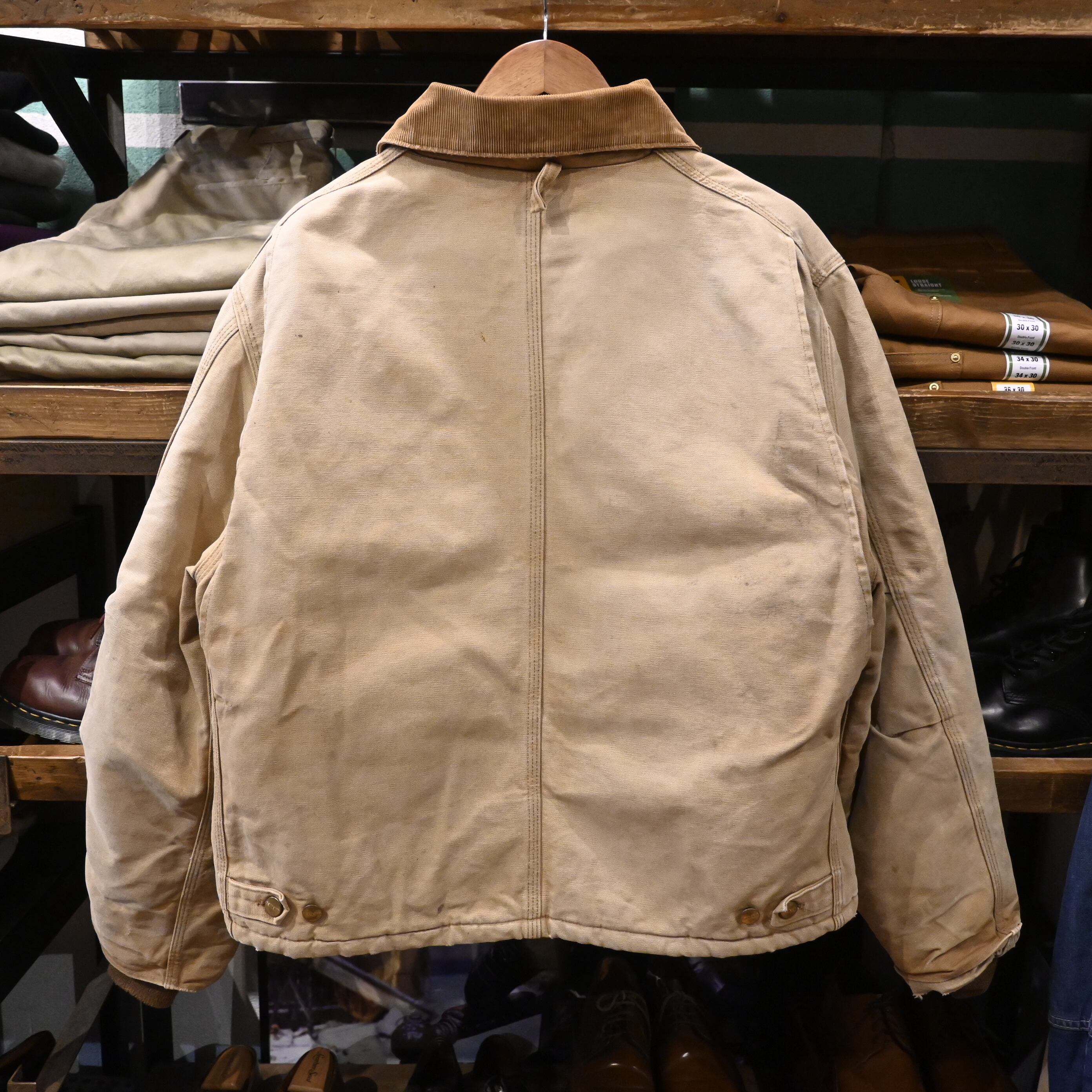 Carharttの代表的なワークジャケット。タフなコットンダック地、コーデュロイ襟、保温性の高いキルティングライナーという王道構成で、アメリカ古着らしい無骨な雰囲気をしっかり纏った一着です。