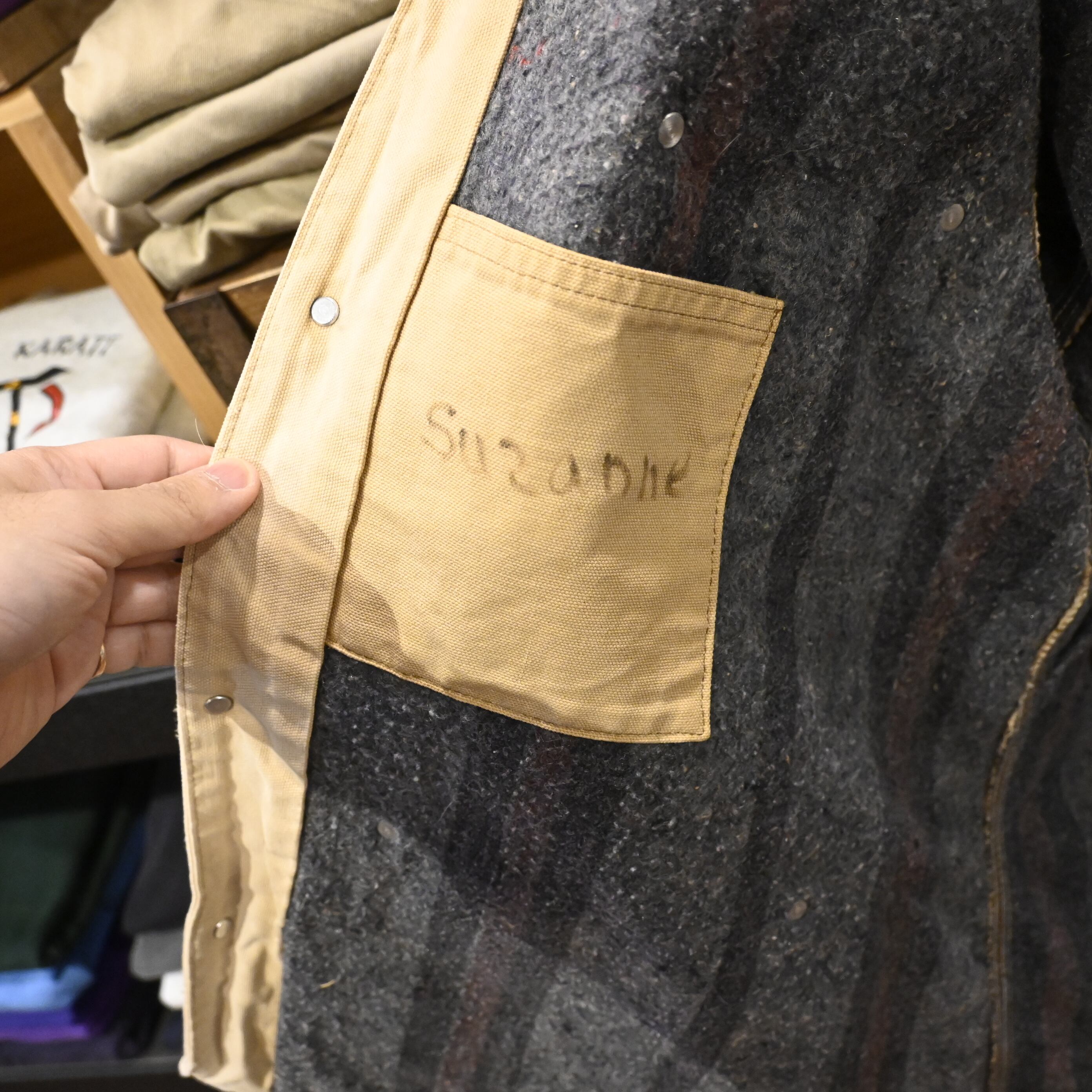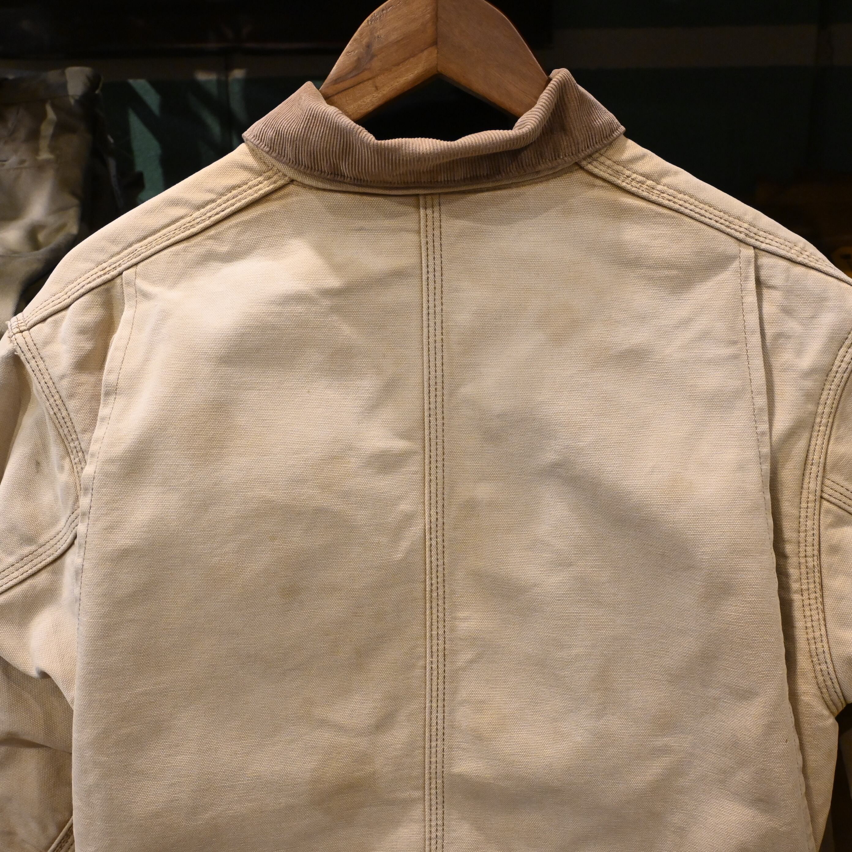 袖口のスレ、前立て周りの汚れやキズなど、実使用ならではのリアルな風合いが魅力。