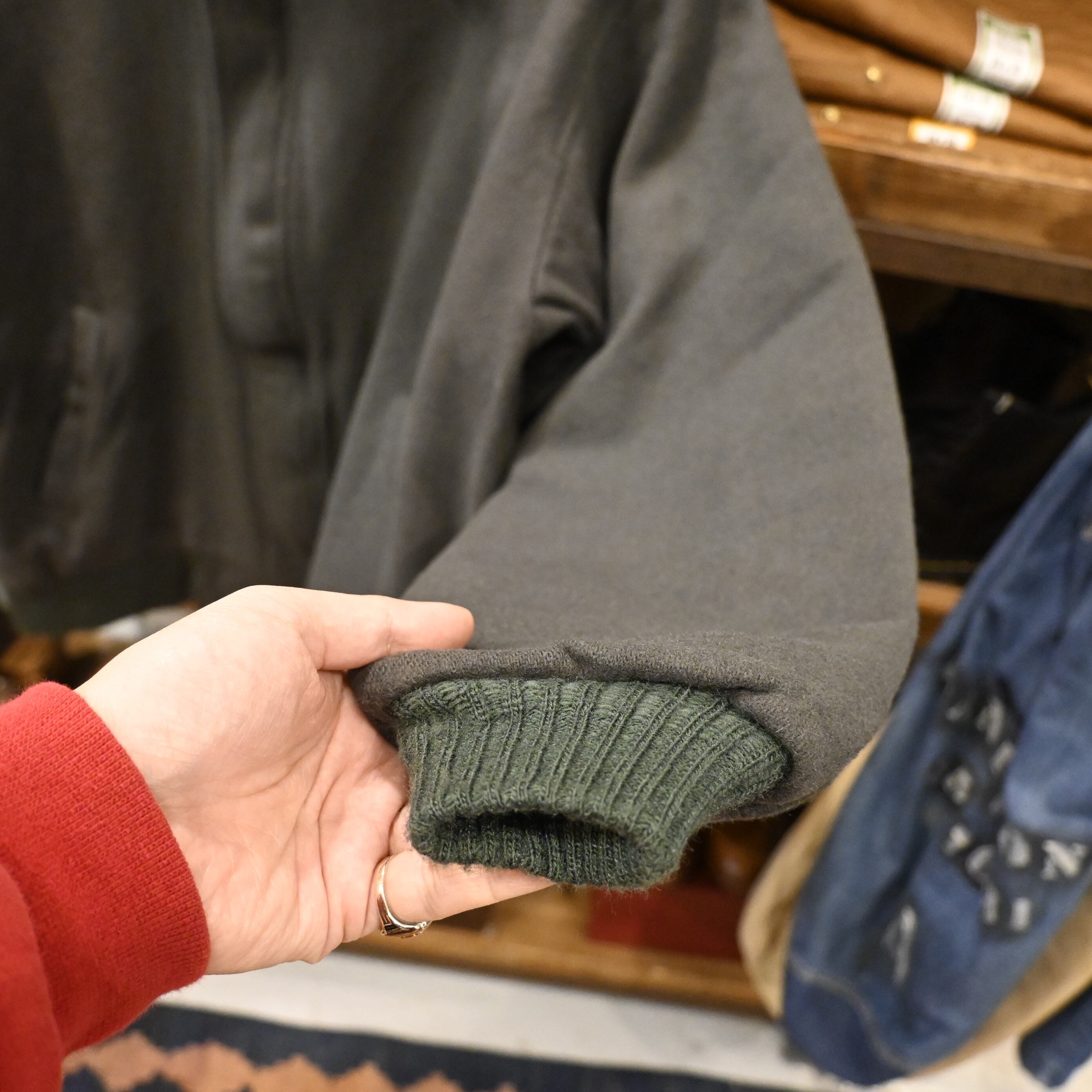 シルエットは身幅に余裕を持たせたクラシックなブルゾン型。裾と袖にはリブニットを採用しており、冷気の侵入を防ぐ実用的なディテールです。
