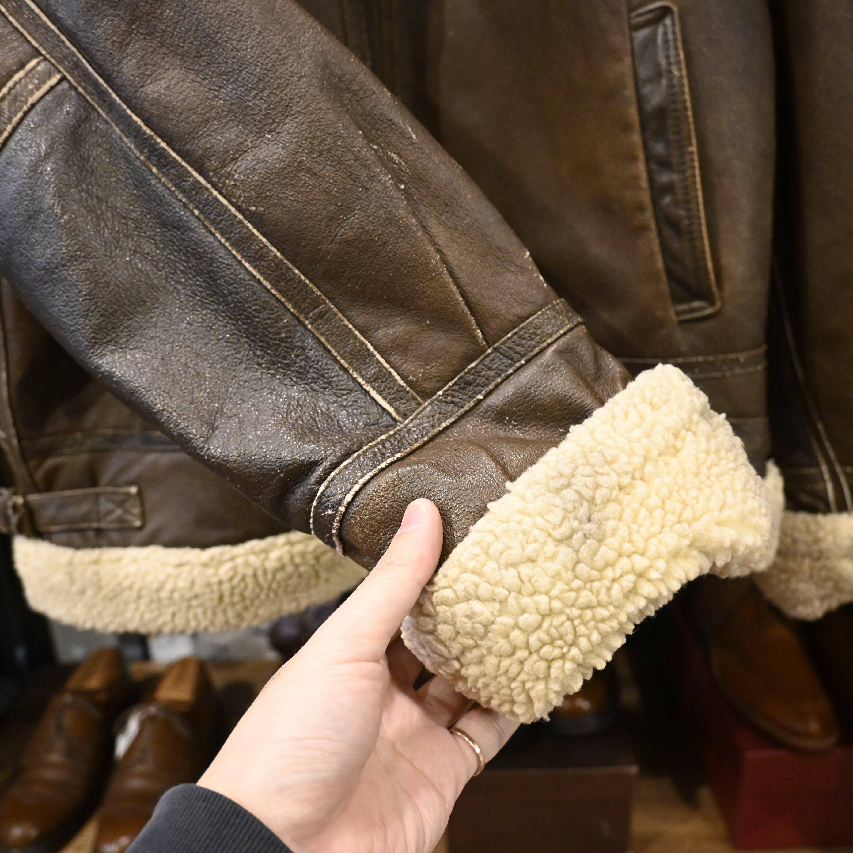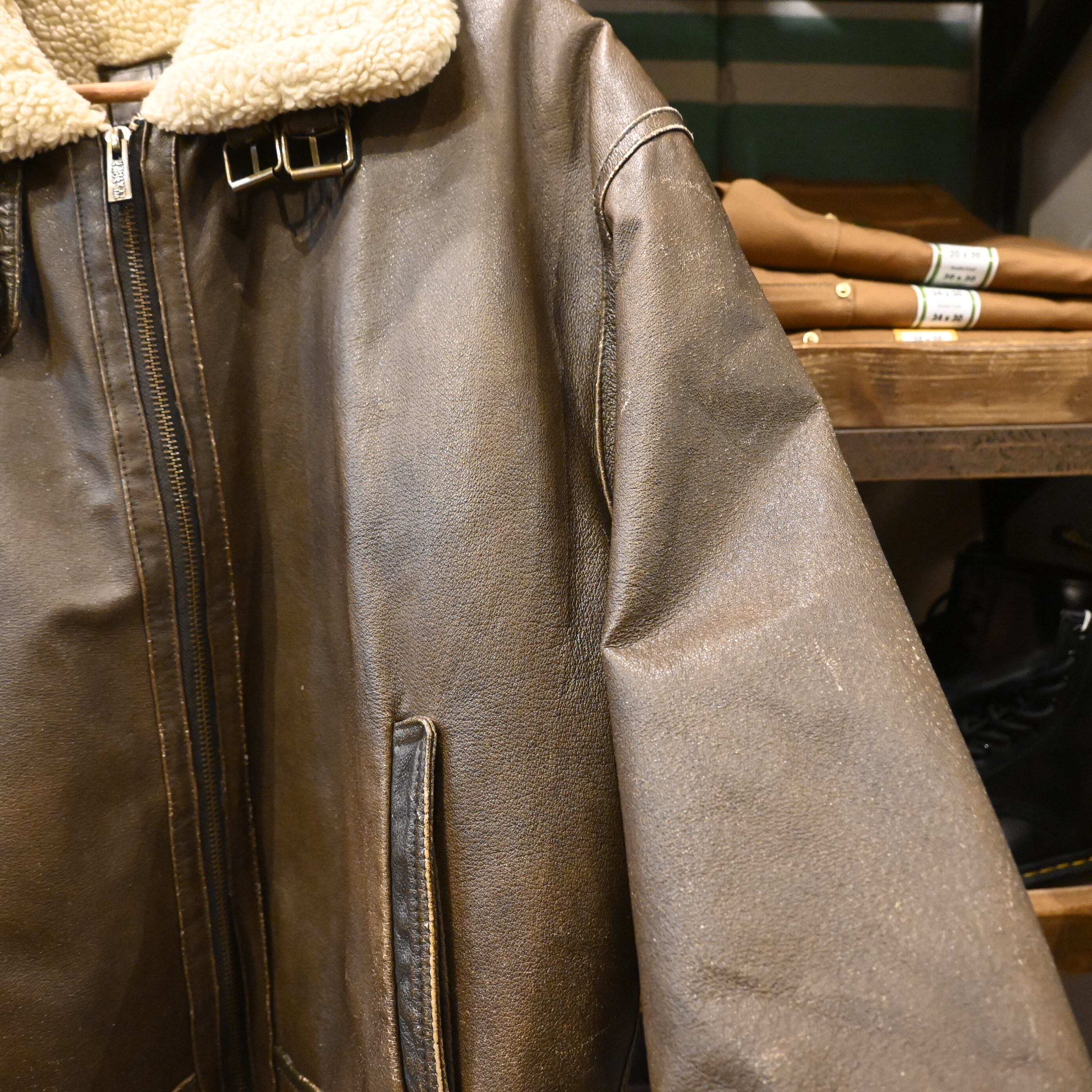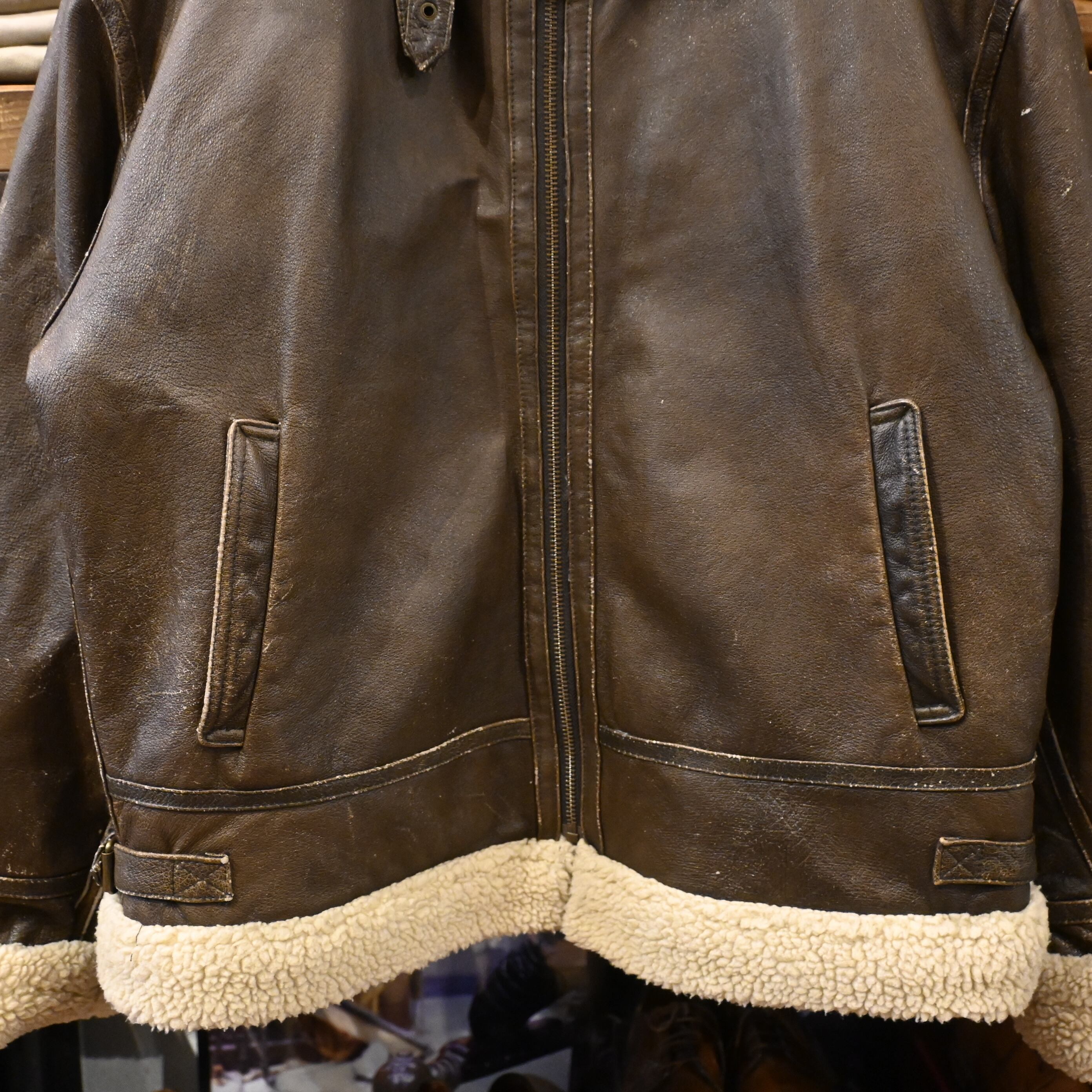 レザー全体にスレ・色ムラ・着用感あり。ボア部分に若干のつぶれ有り。着用に問題のあるダメージはありません。古着らしい風合いとしてお楽しみいただけます。