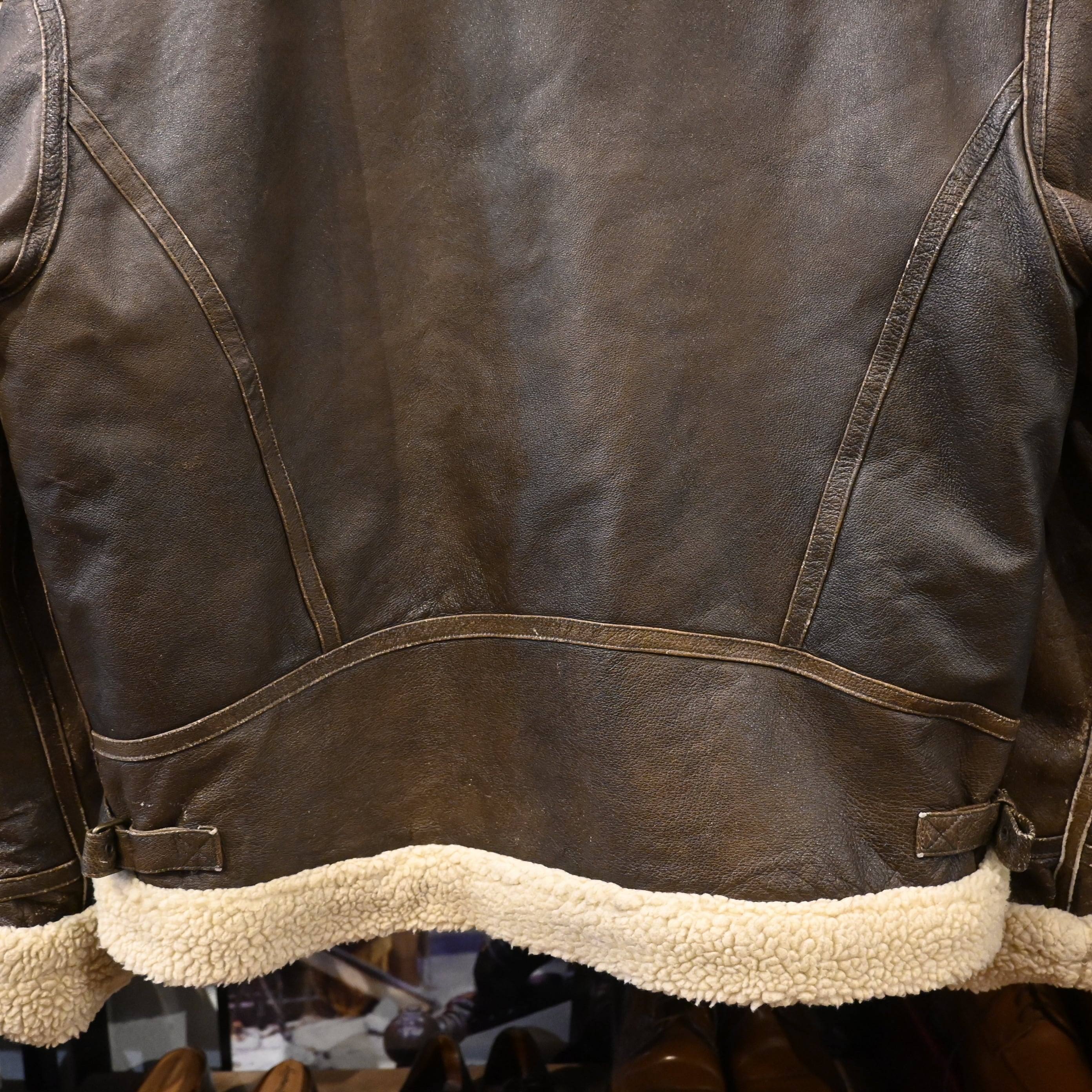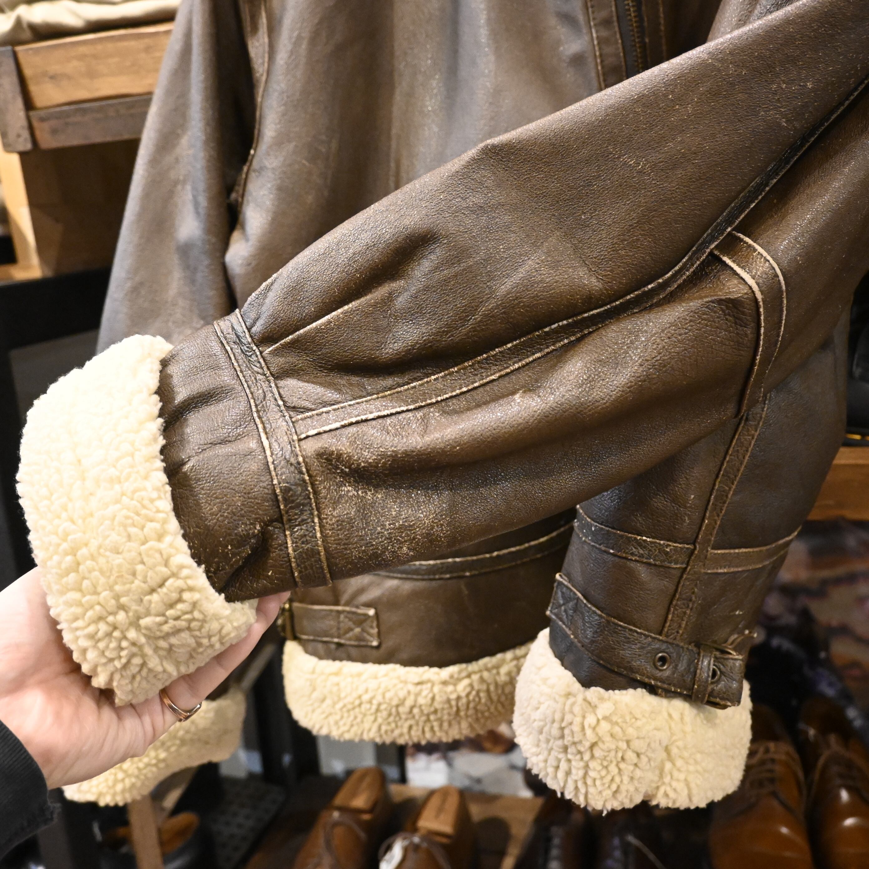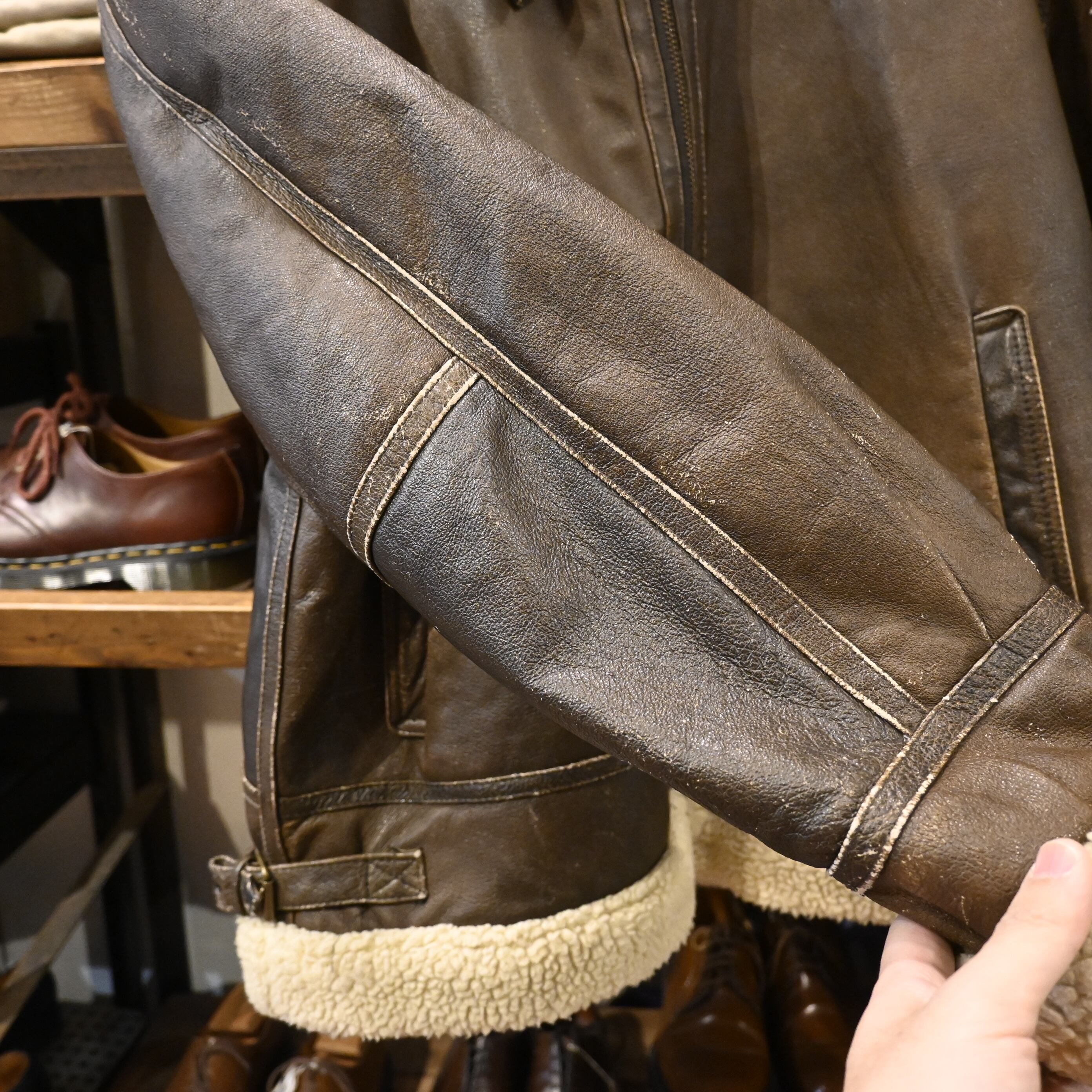 レザー全体にスレ・色ムラ・着用感あり。ボア部分に若干のつぶれ有り。着用に問題のあるダメージはありません。古着らしい風合いとしてお楽しみいただけます。