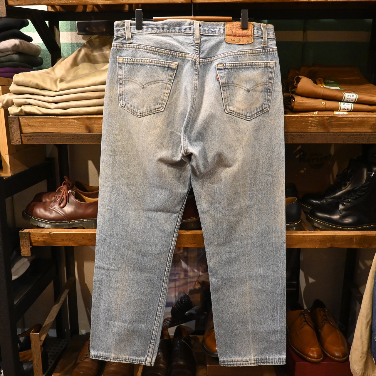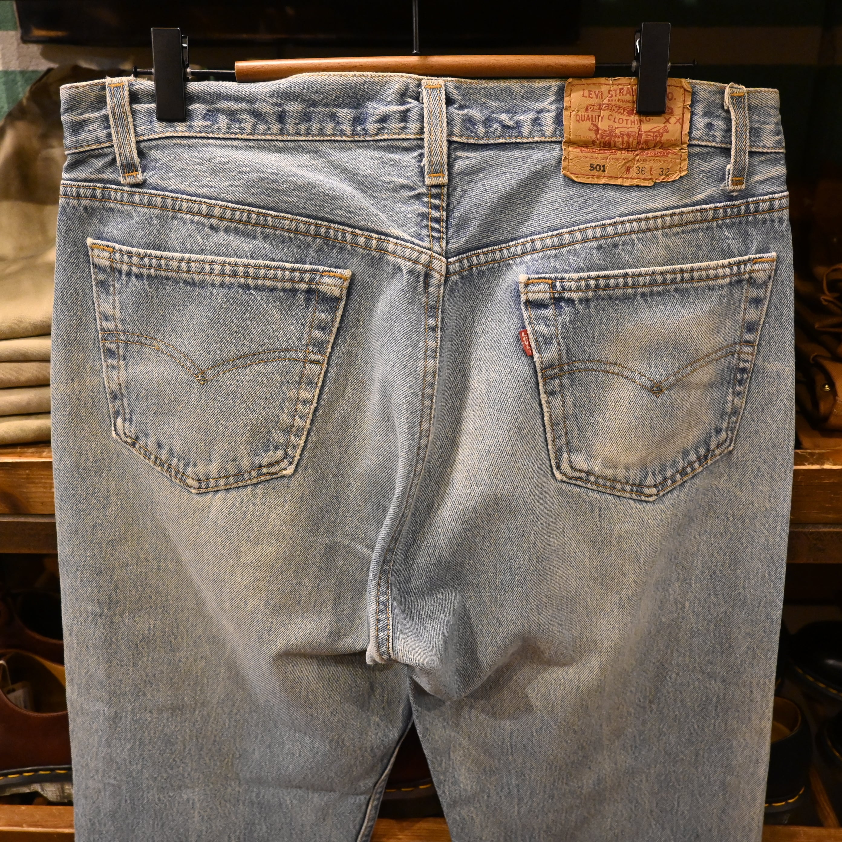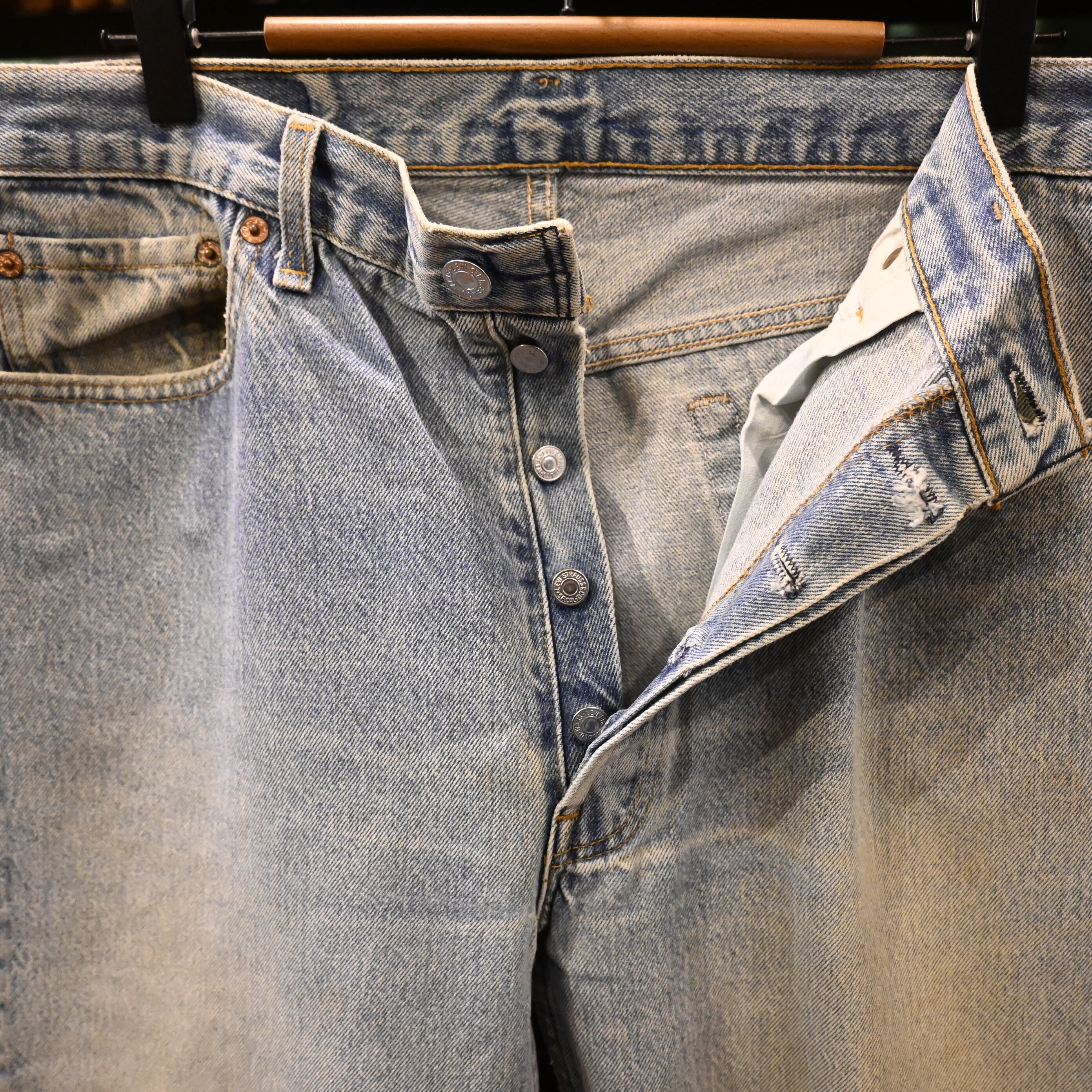 アメリカ製の501らしい無骨な表情と、全体に入った明るいライトブルーのフェードが魅力の一本です。
